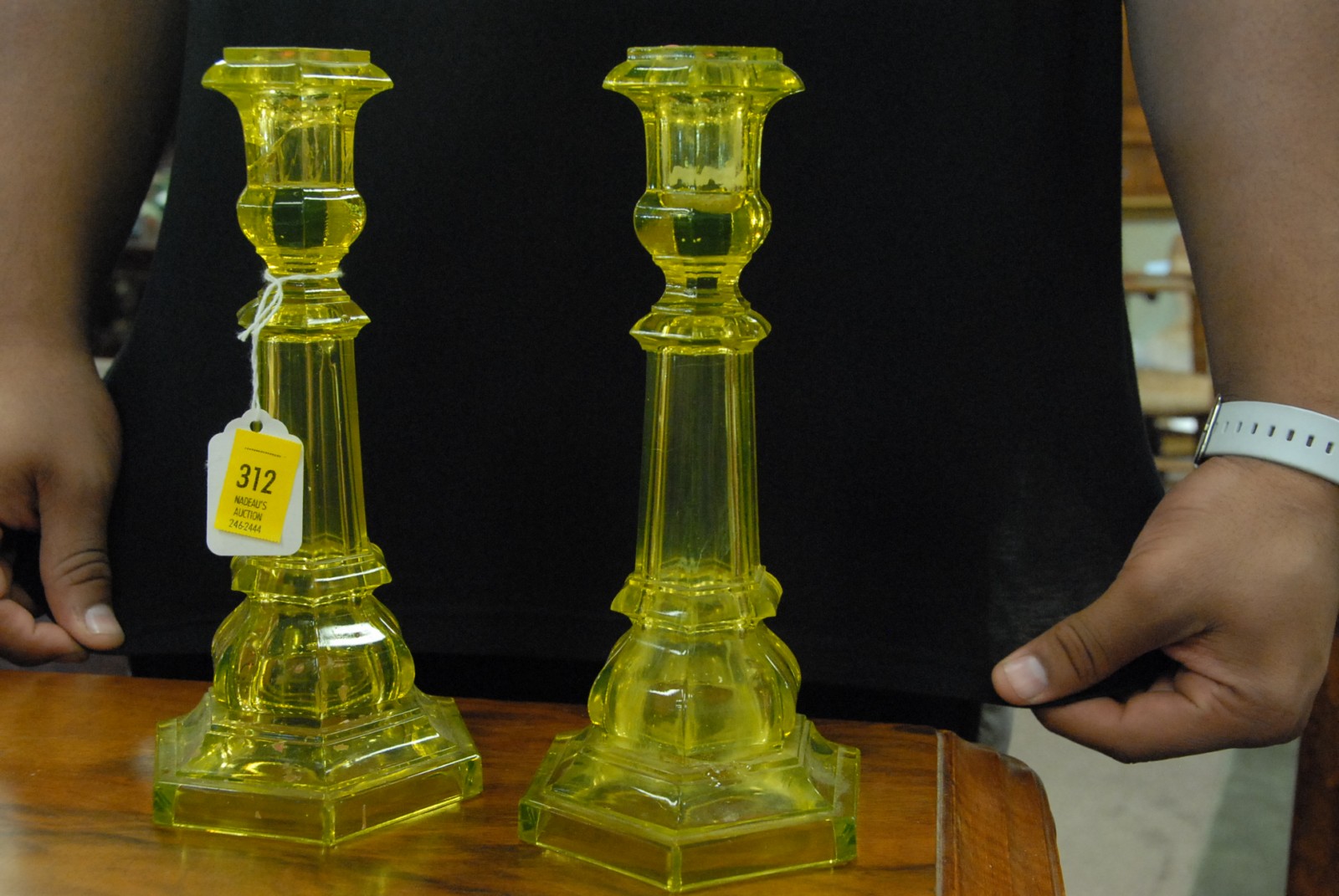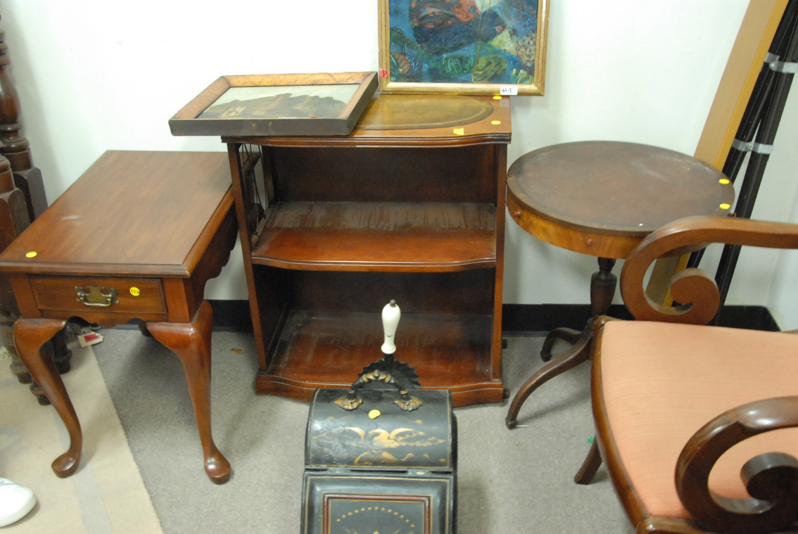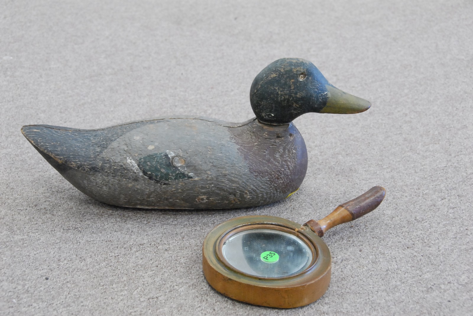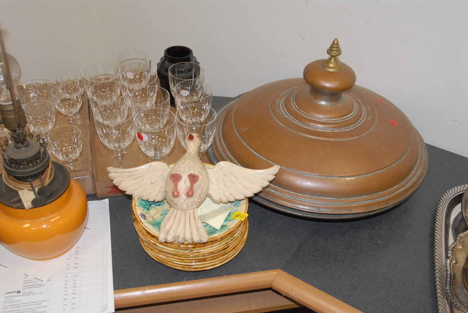 Group lot, including a group of 10 Majolica plates, crystal stems, amethyst vase, covered copper piece, a lamp, 2 wood carving, one a bird, and one a three dimensional plaque with a man