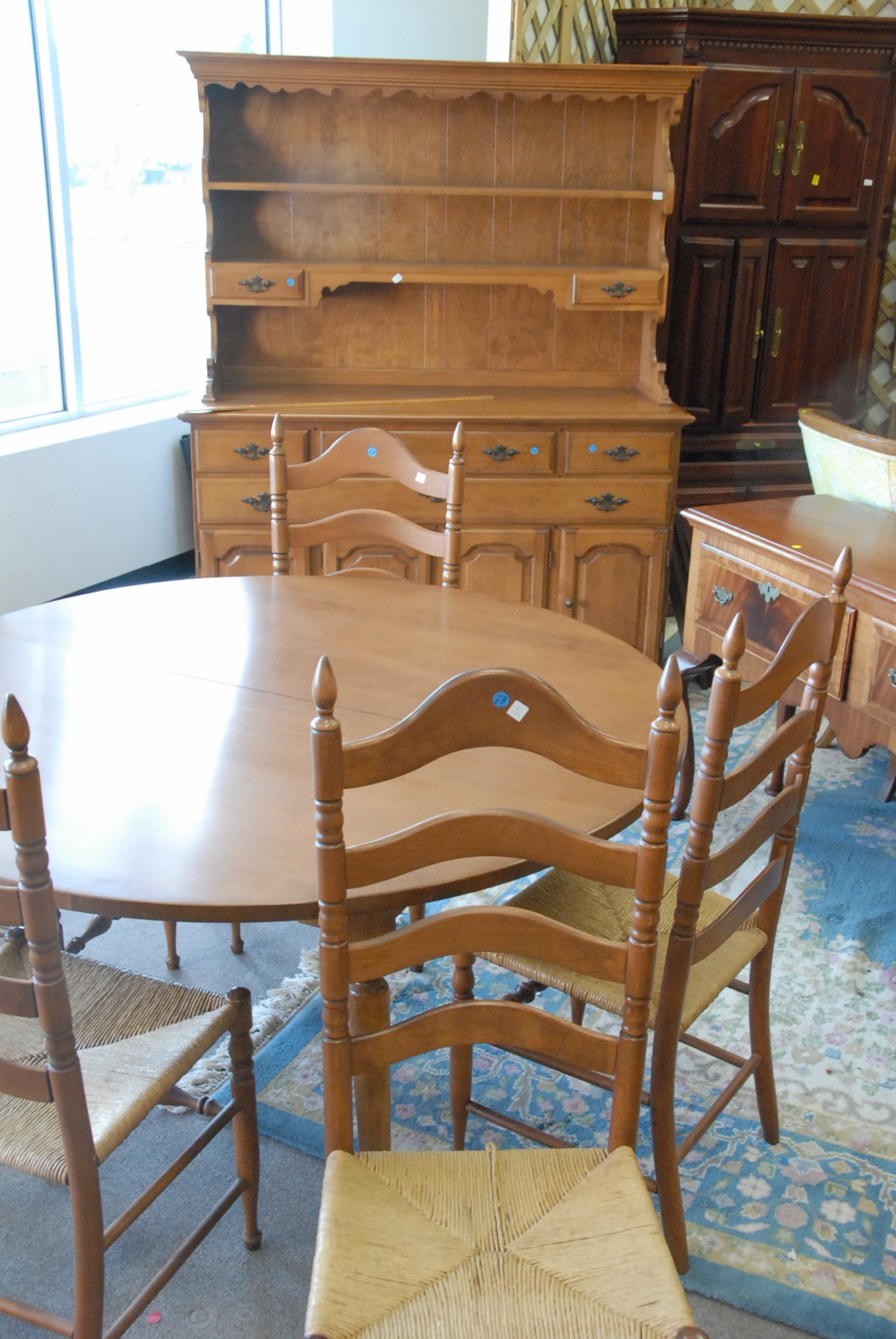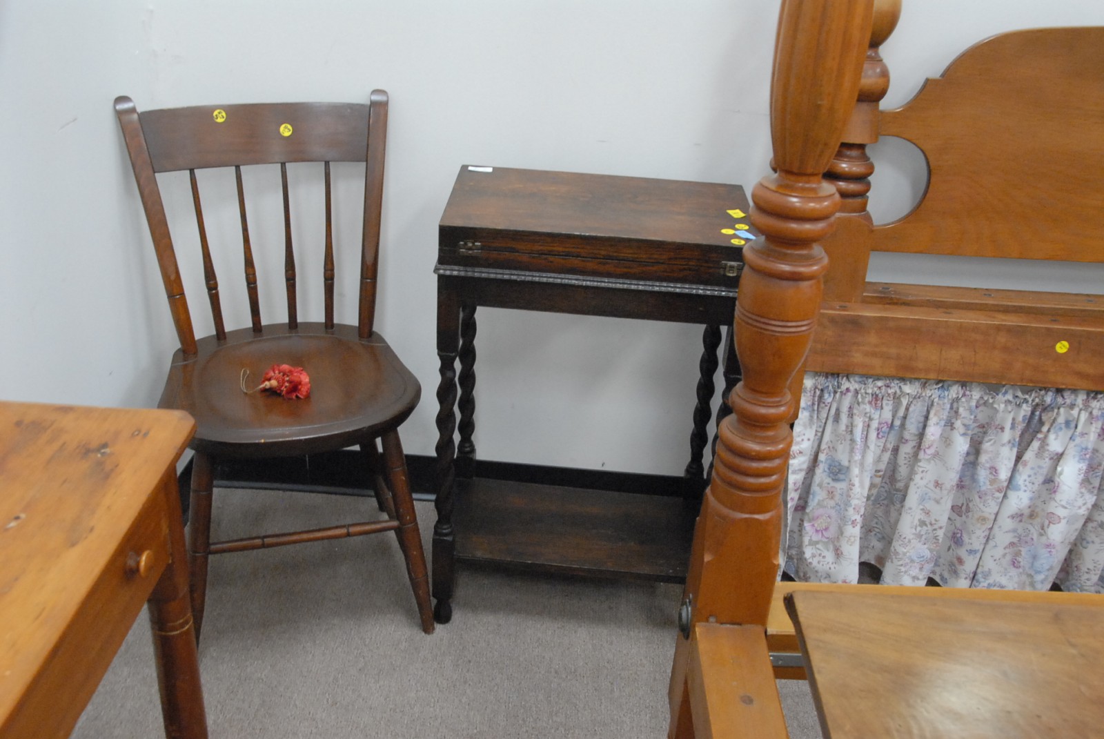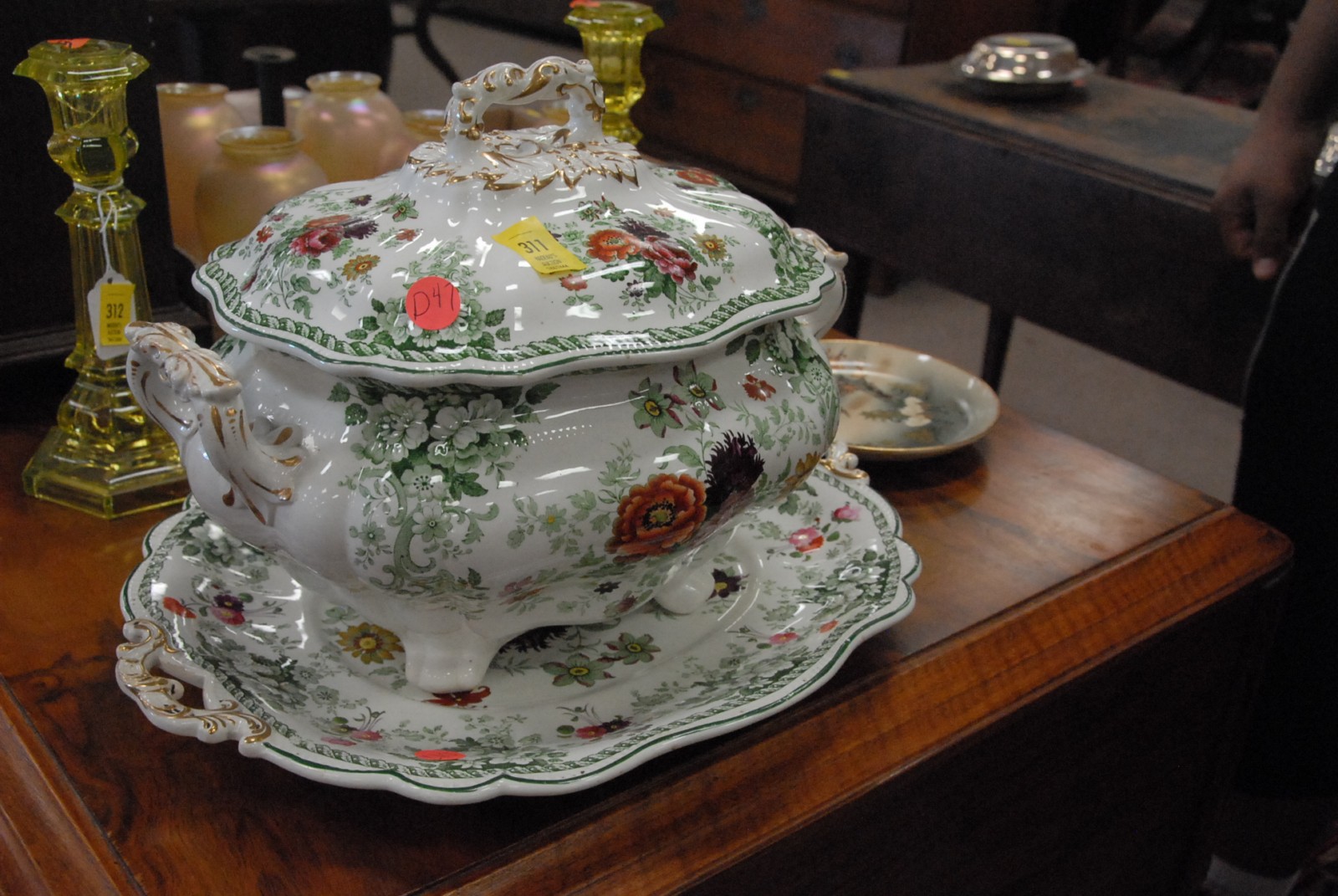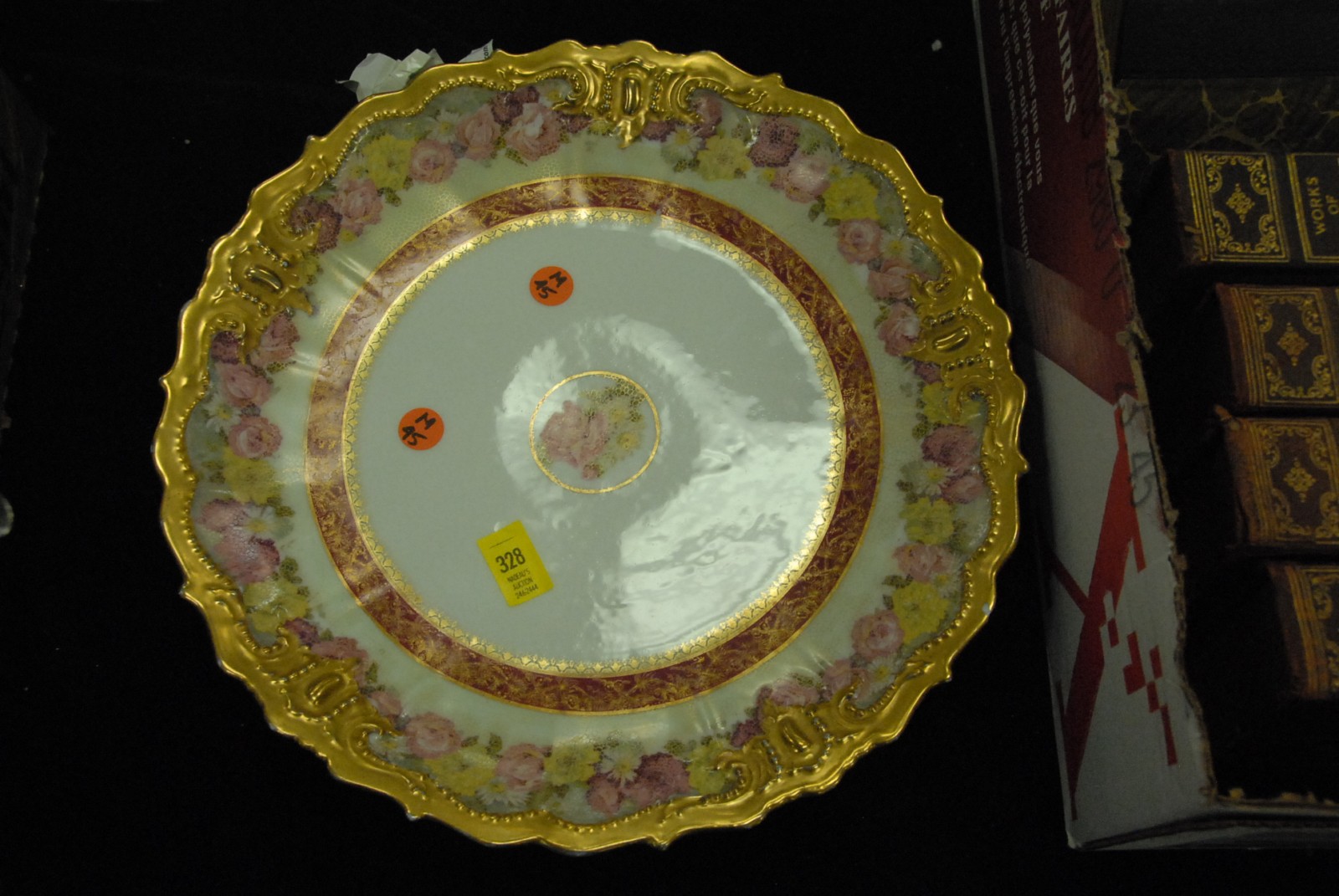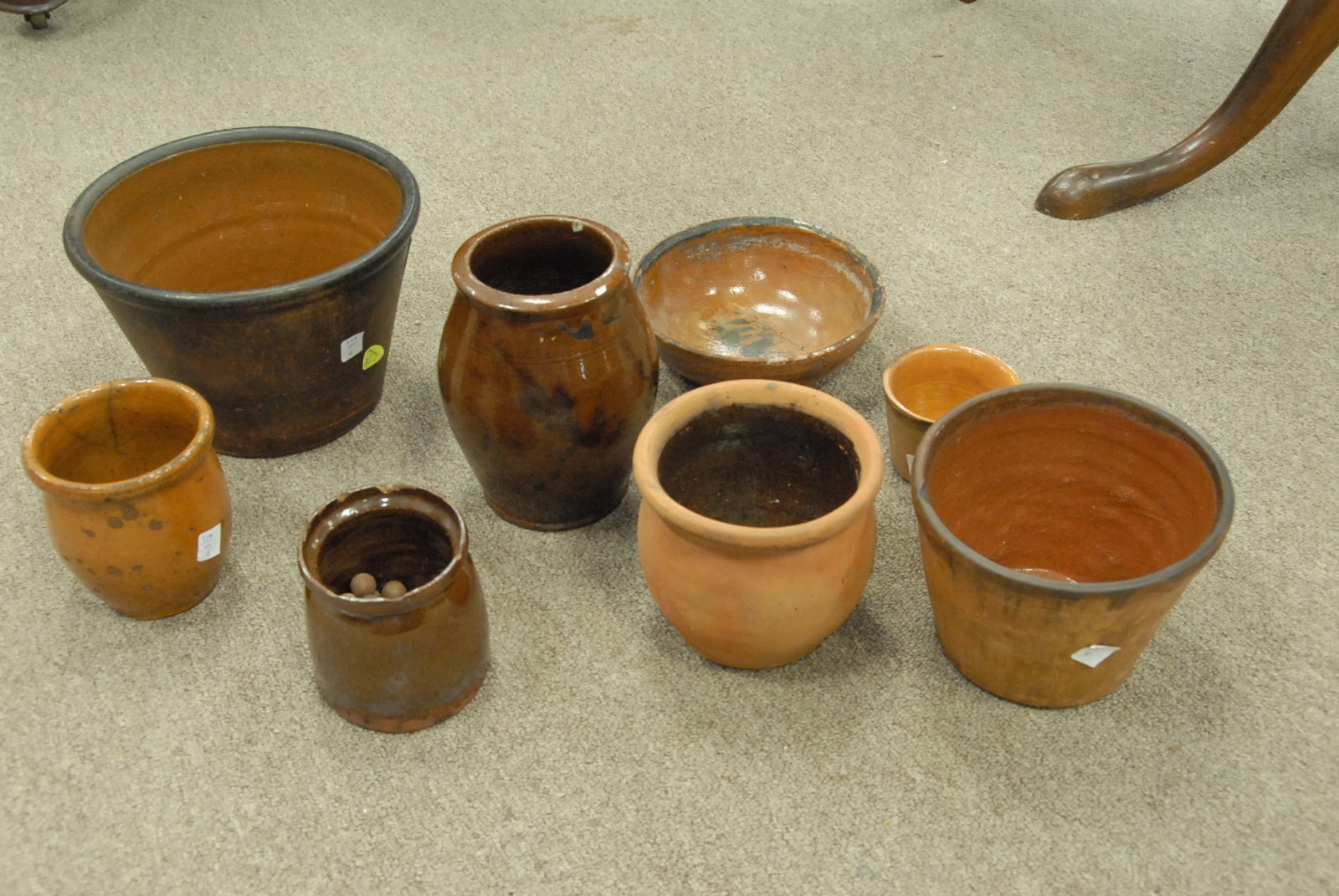 Group lot, including a group of 10 Majolica plates, crystal stems, amethyst vase, covered copper piece, a lamp, 2 wood carving, one a bird, and one a three dimensional plaque with a man