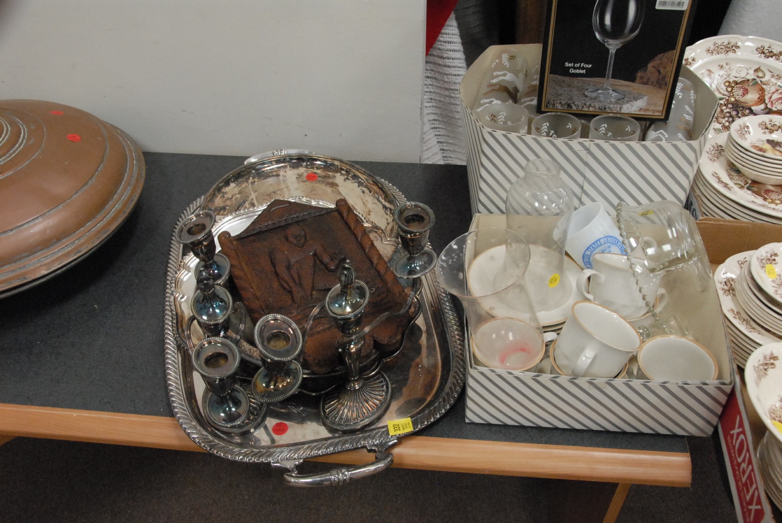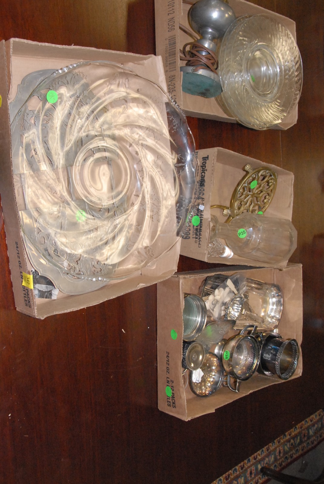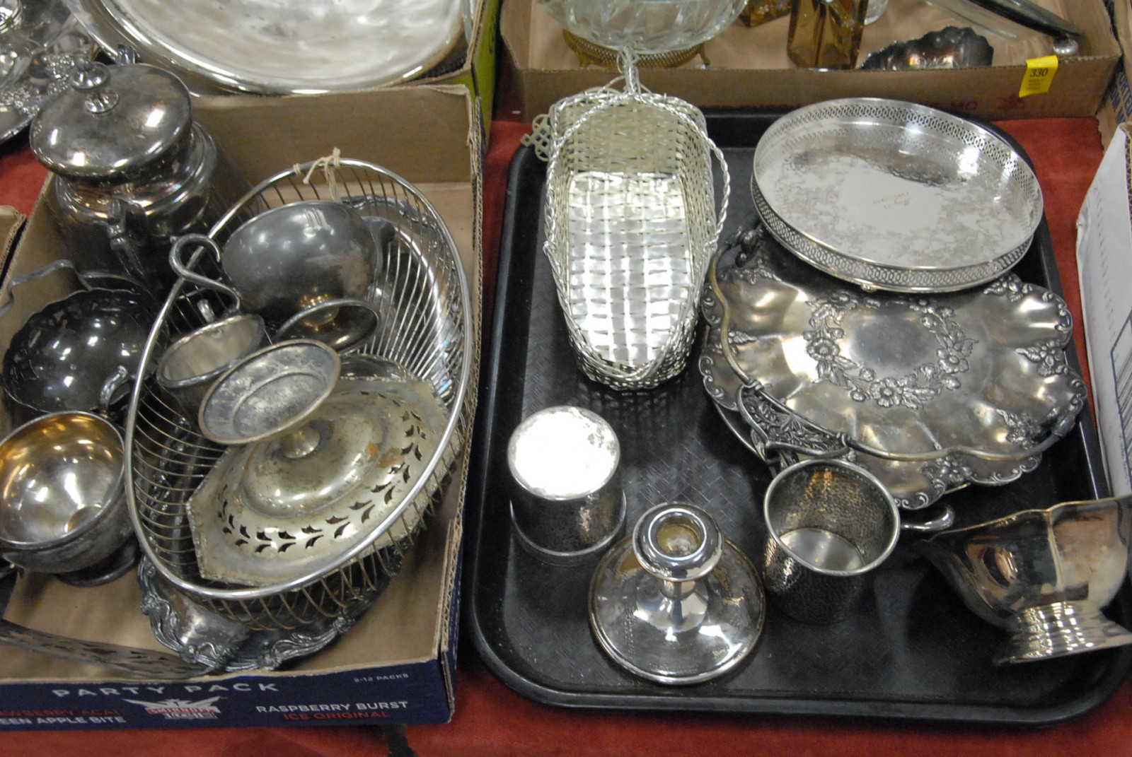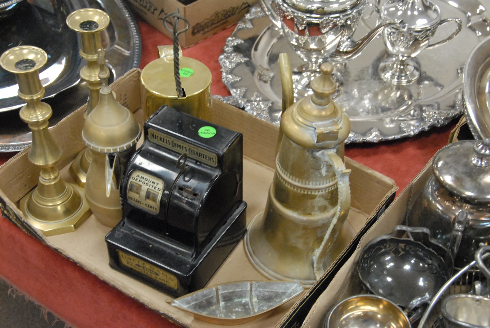 5 tray lots plus trays all silver plate to include a 5 piece tea sets, brass candlesticks, brass pots, silver plated basket trays, gravy boat, and misc.