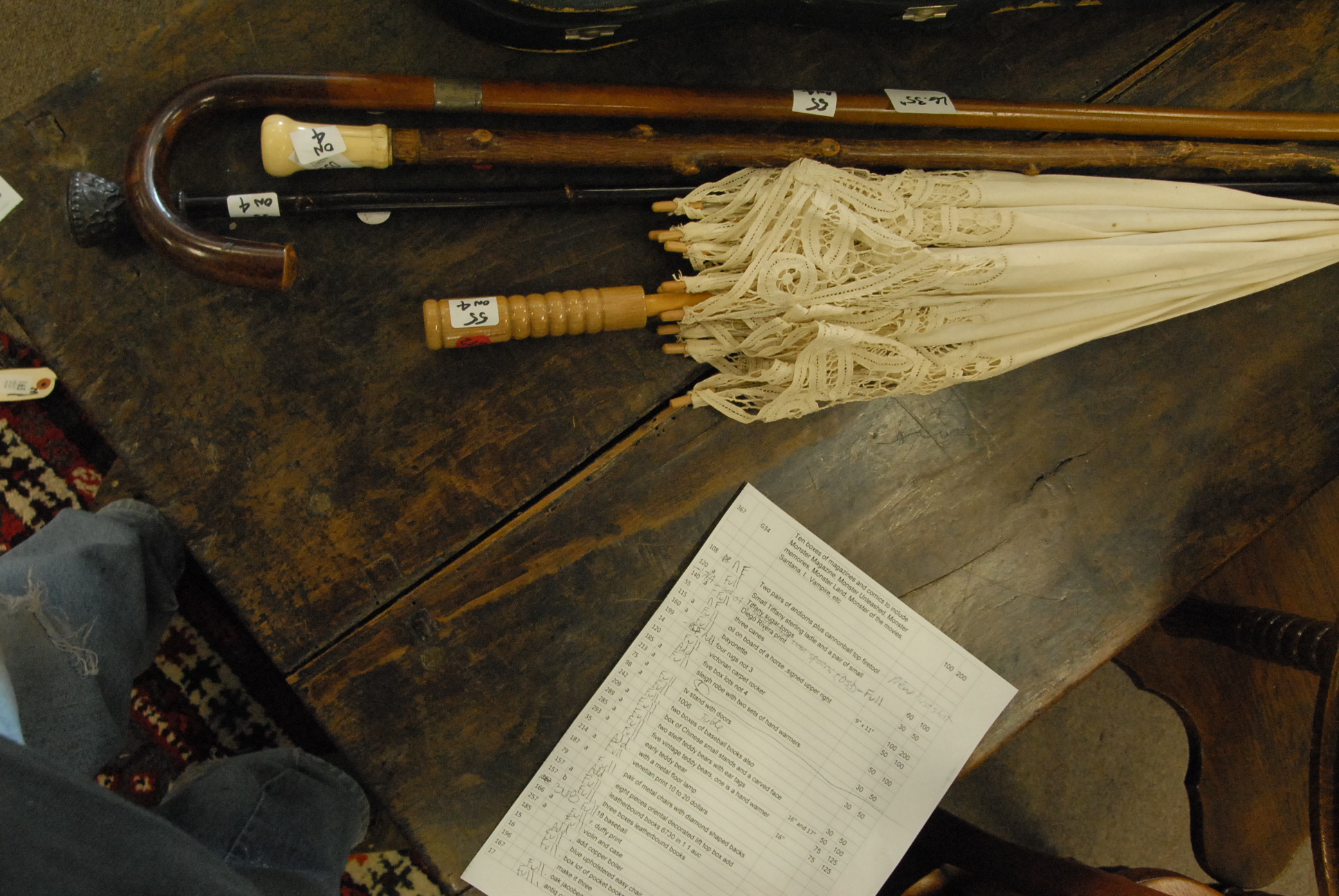 Three canes, one with ivory and a parasol