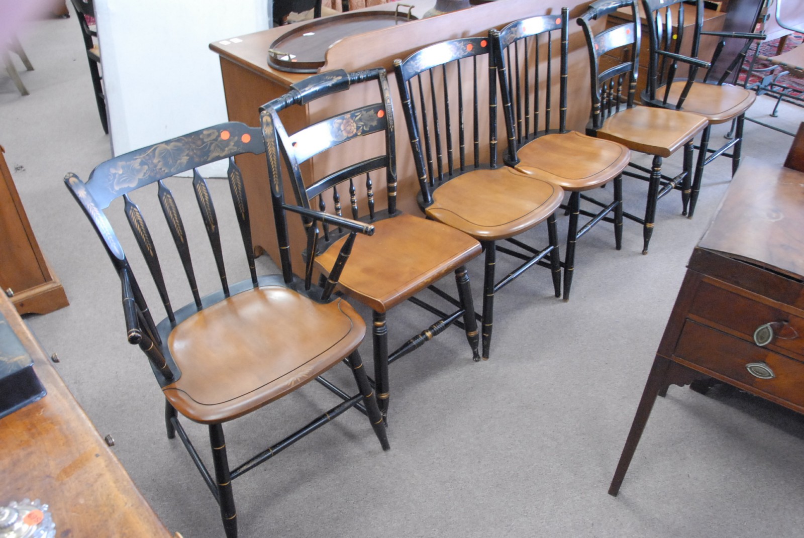 Six Hitchcock chairs and two armchairs, two pairs of side chairs