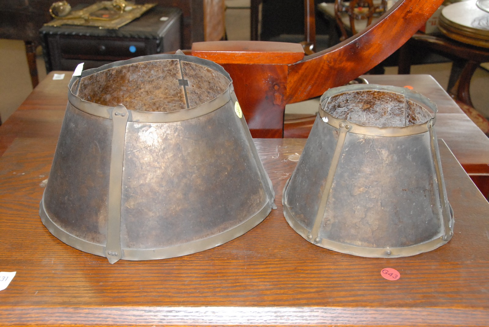 Pair of arts and crafts lampshades with mica inserts