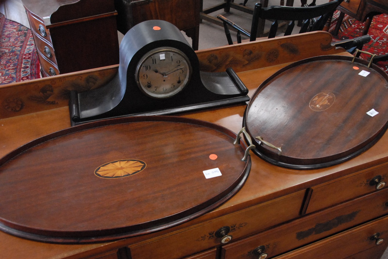 Three piece lot to include two mahogany inlaid trays and a mahogany Seth Thomas camel back clock