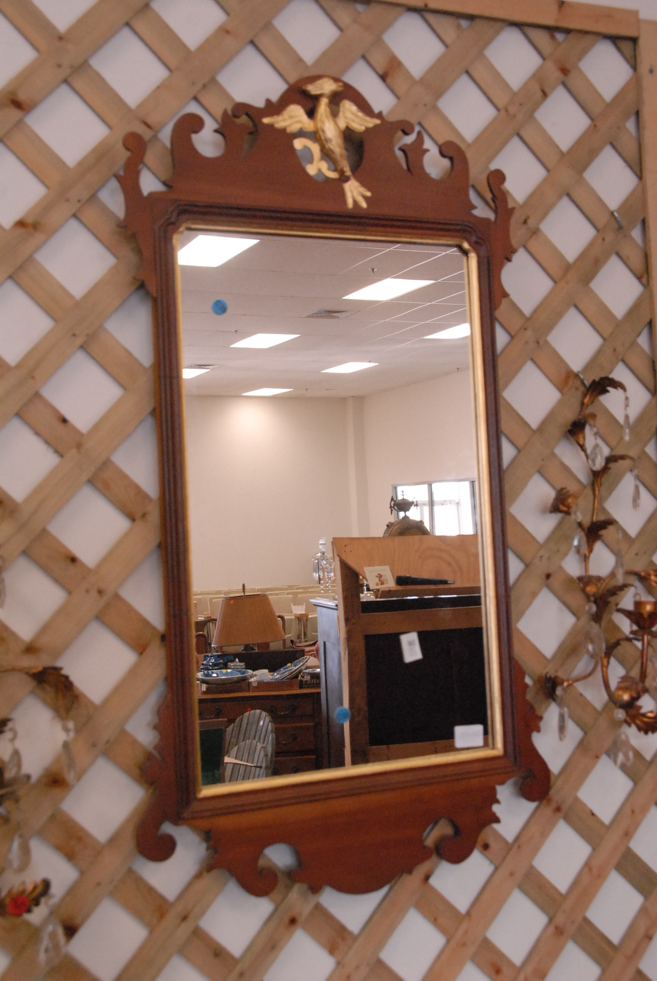 Custom cherry Chippendale style mirror with a phoenix bird