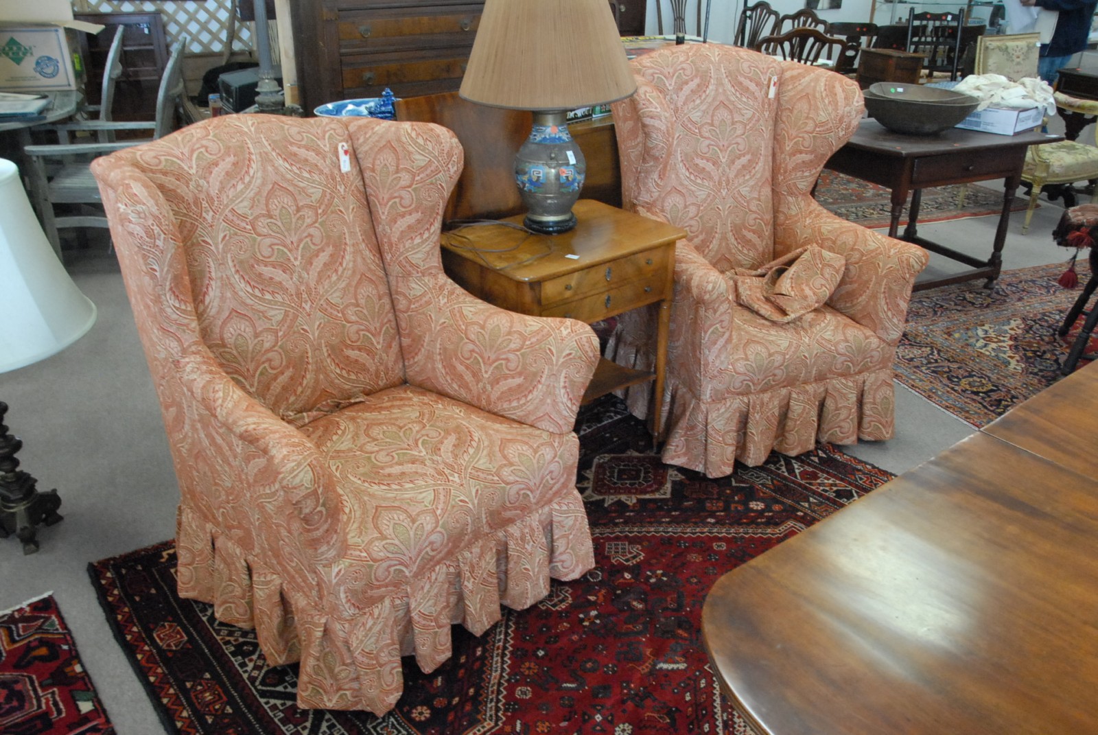 Two Victorian upholstered wing chairs, near matching