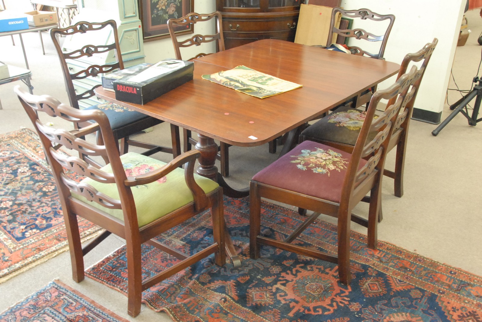 Mahogany double pedestal dining table with three leaves and six Chippendale style chairs with needlepoint seats