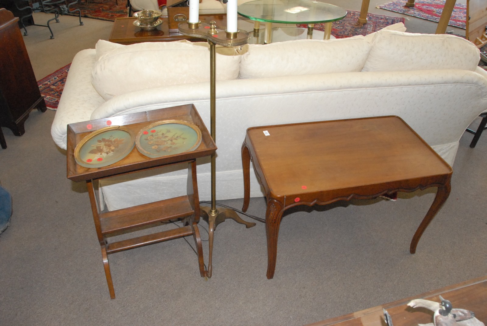 Lot to include French style coffee table, side table, brass and wood floor lamp, pair of prints, and a spool bed