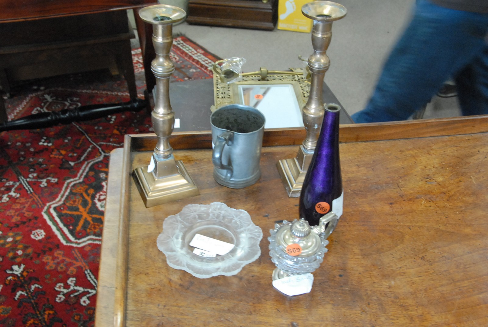 Seven piece lot to include a pair of candlesticks, an enameled Japanese vase, pewter cup, Lalique dish, Oriental decorated lift top box, and a small mustard dish with silver top and bottom