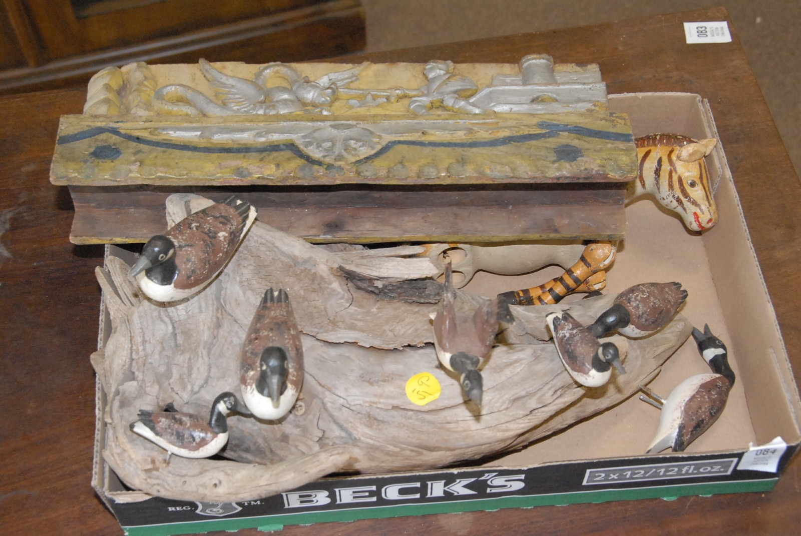 Box lot of three pieces including carved geese on driftwood, wooden zebra, and a woodcarving of a knight sleighing a dragon