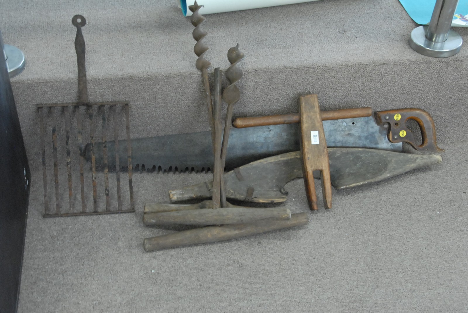 Primitive lot including a couple of augers, a roaster, a saw