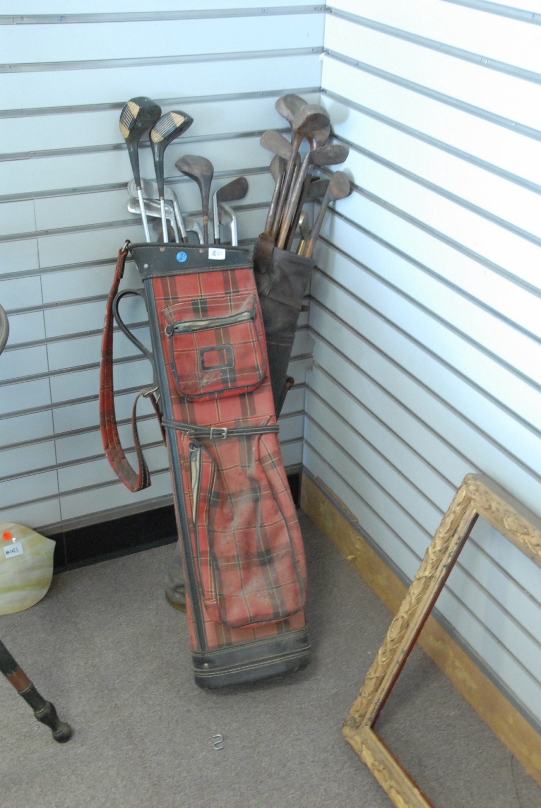 Two bags of golf clubs including eleven with wood shafts