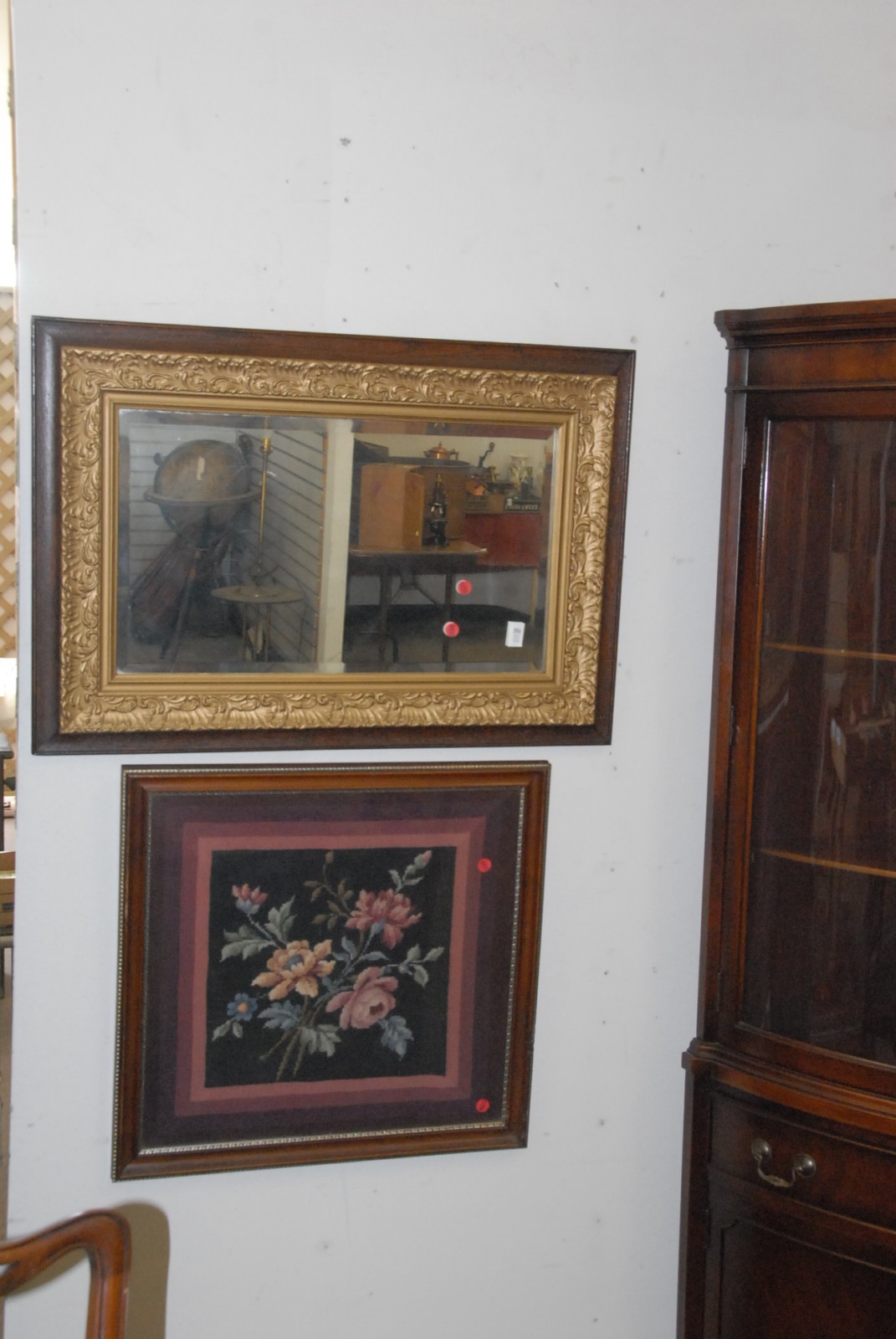 Two piece lot to include gold frame mirror and a framed needlepoint