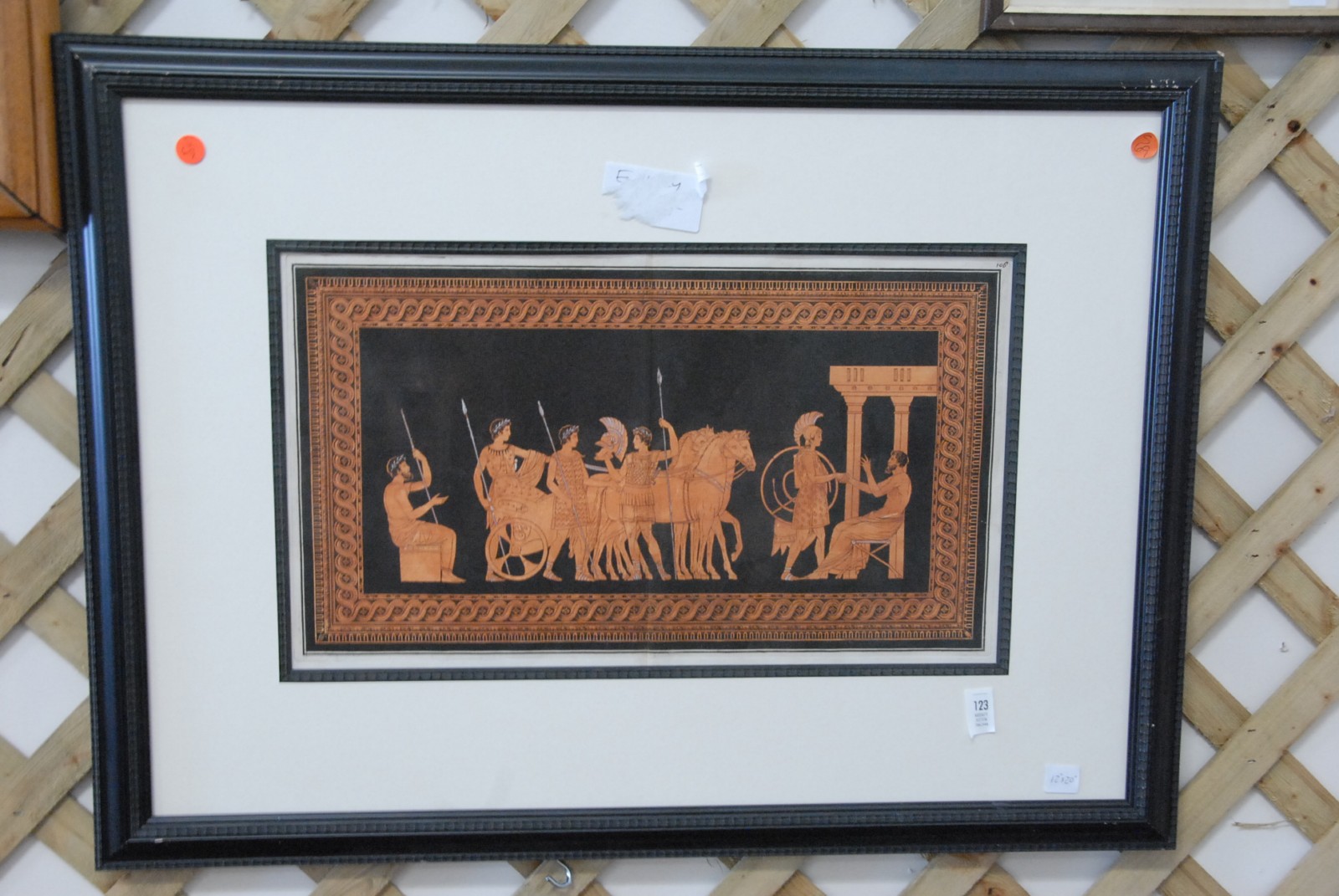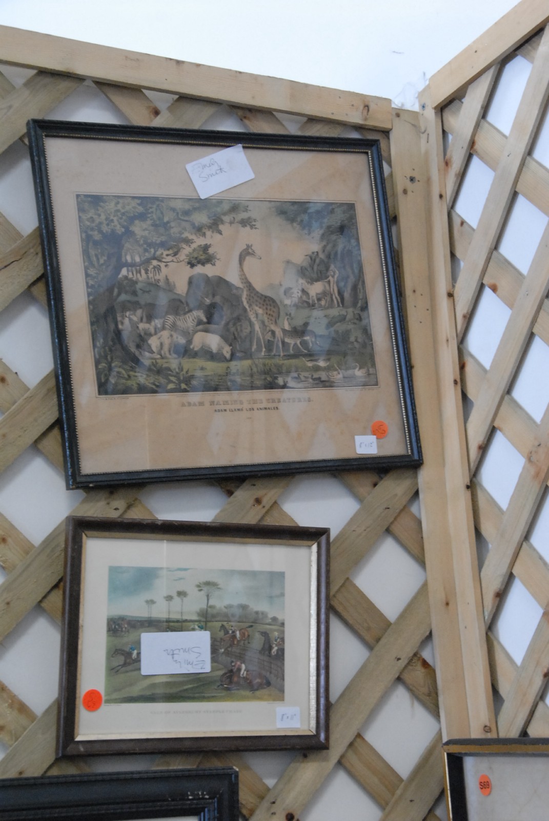 Three piece lot to include camel printed on cloth, Adam naming the creatures, and small sporting print