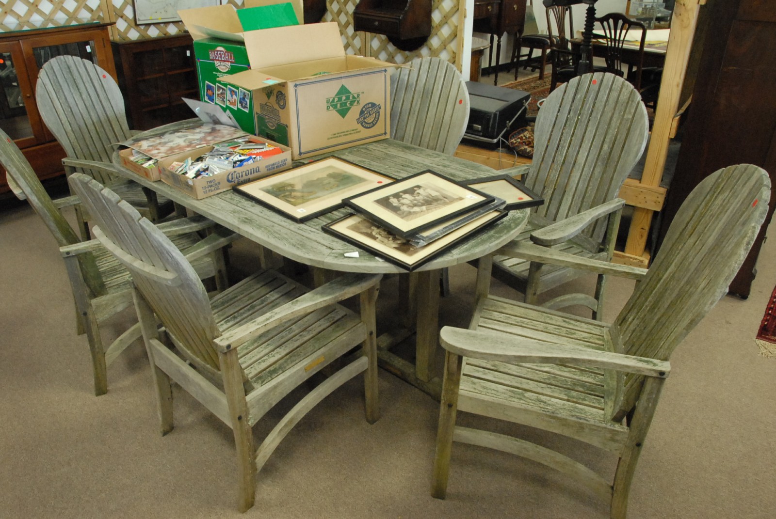 Kingsley Bate seven piece teak outdoor set, oval table and six armchairs
