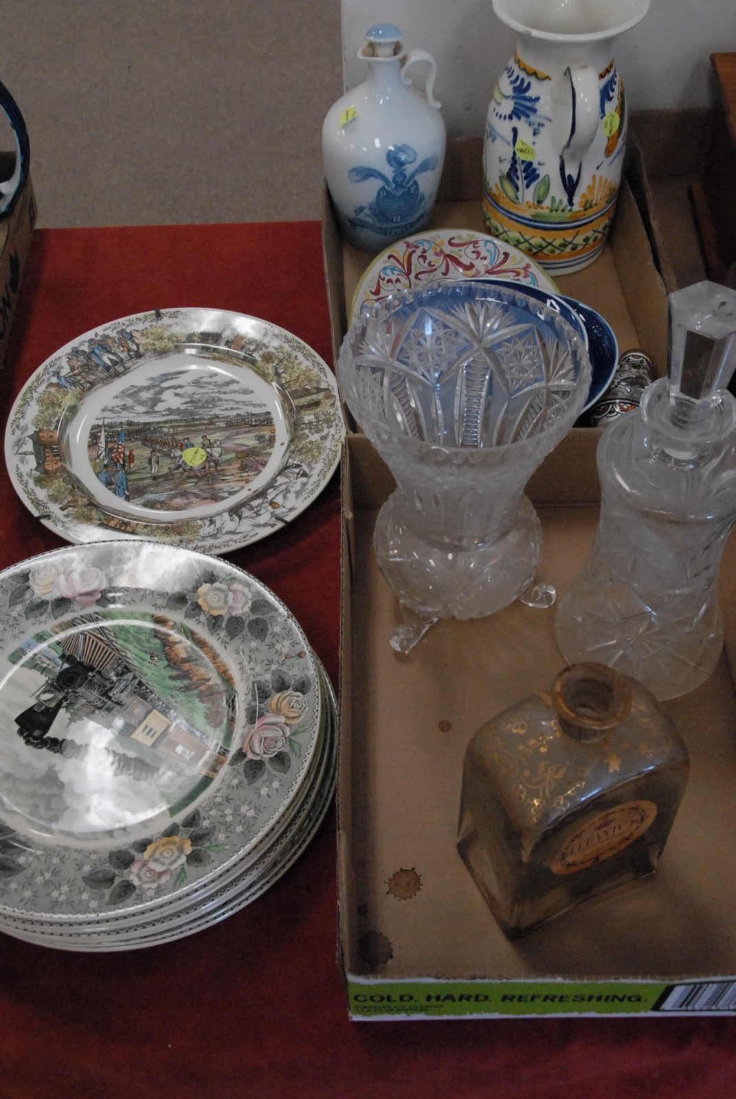Three box lots of Staffordshire, as is, including Marshall Troy paddle wheel plate, and a MacDonough’s victory teapot , chip on the lid, plus Samsung plate, tile, teapot, a couple of lustered decorated plates with a ship