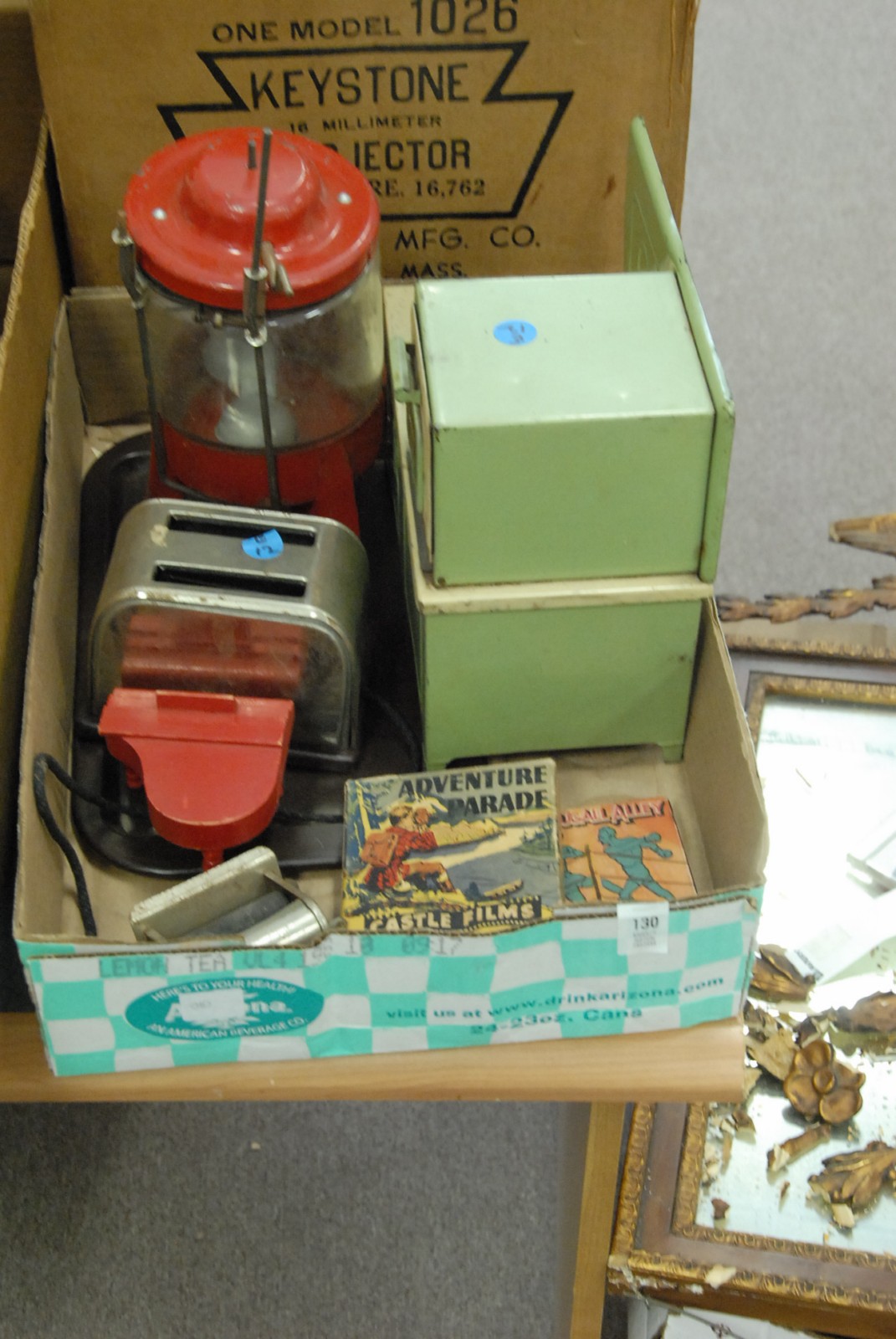 Early films and projector, toy toaster, piano, stove, and washing machine