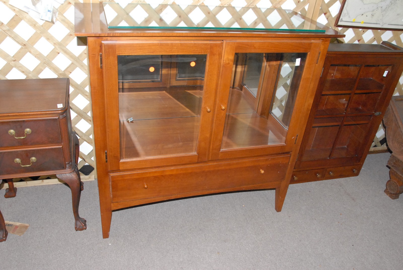 Contemporary curio cabinet with beveled glass doors, glass shelves, and drawer