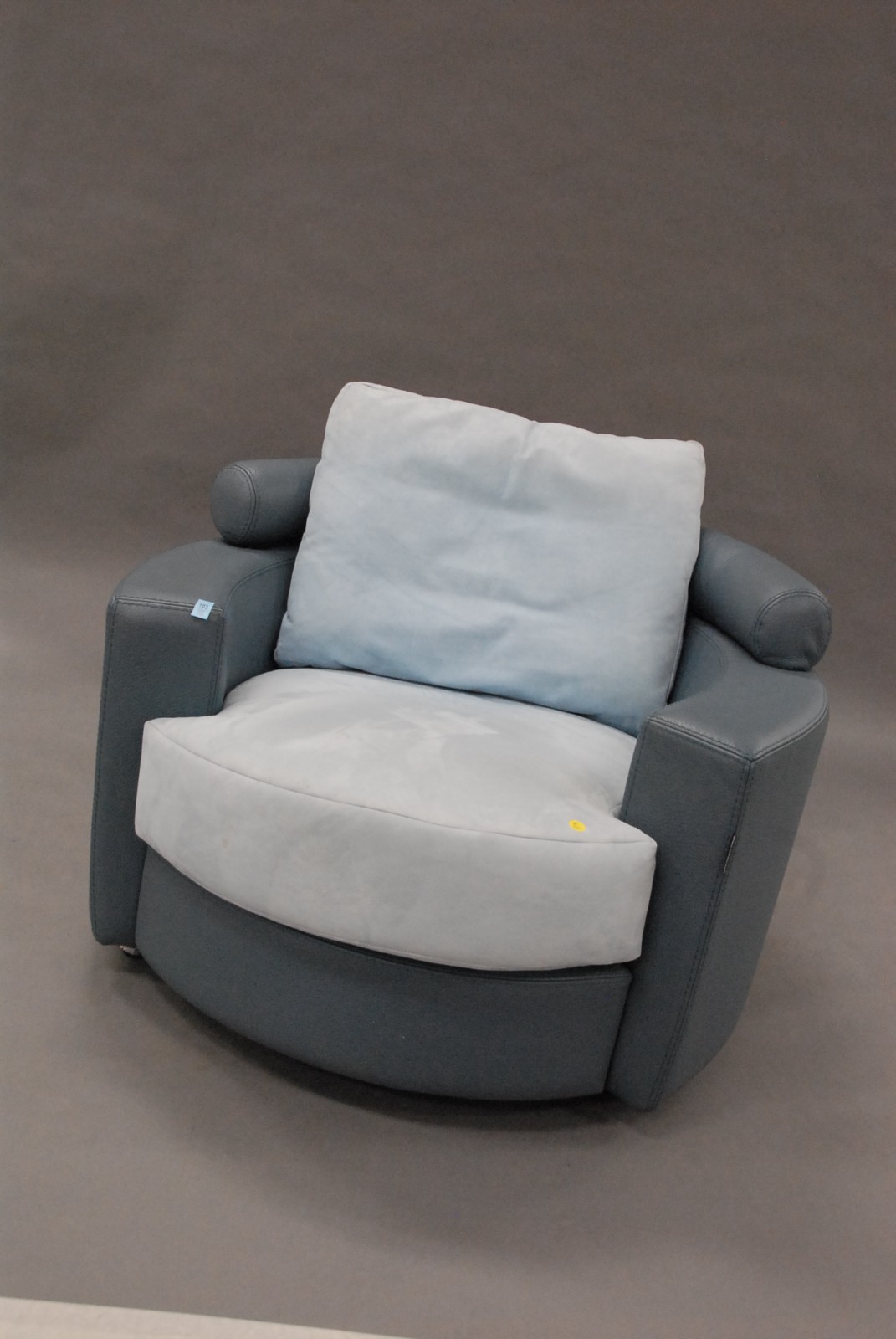 Roche Bobois leather and suede round swivel chair, signed. New cost over 5000.00