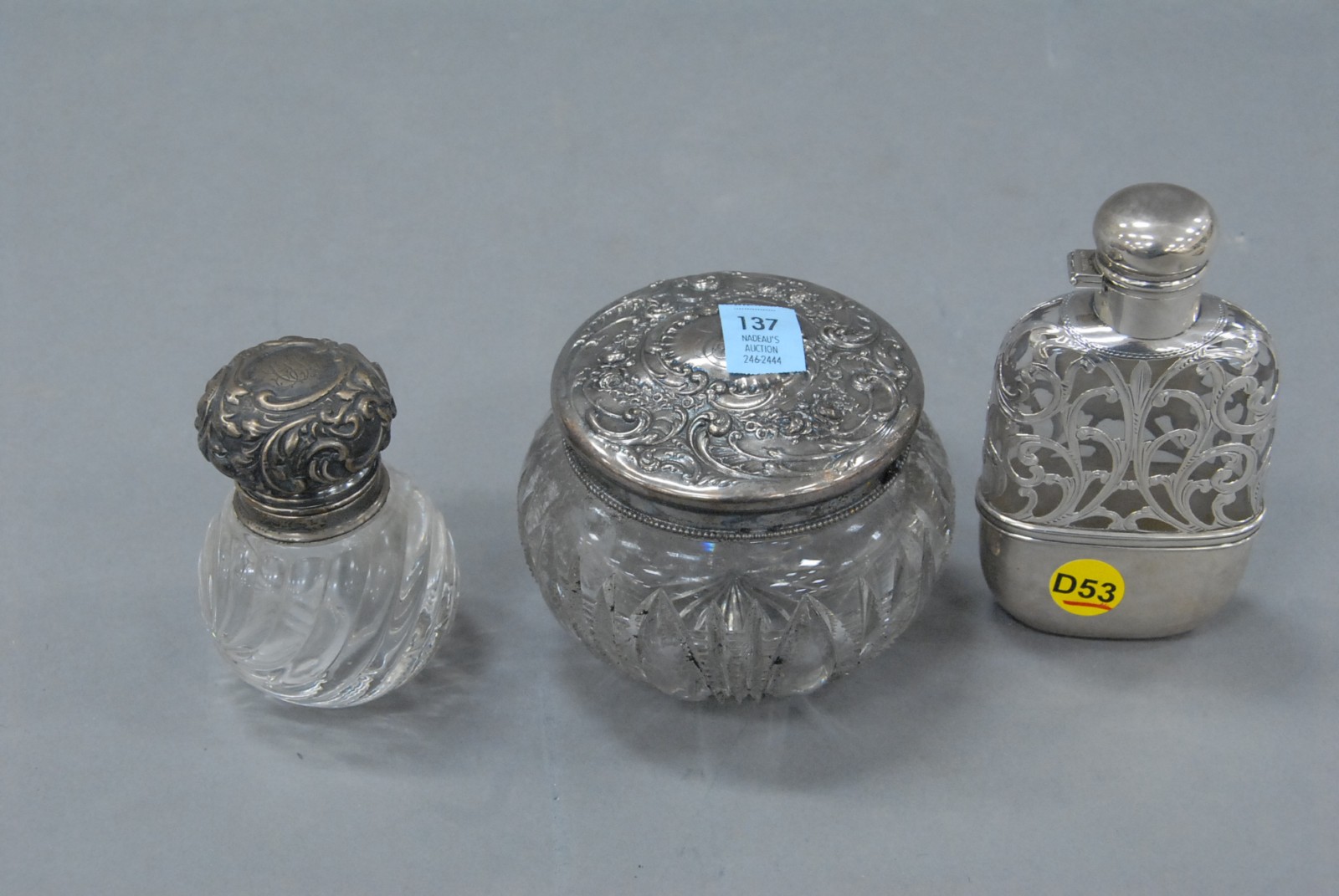 Three piece lot, silver overlaid flask, silver topped inkwell, silver topped powder jar