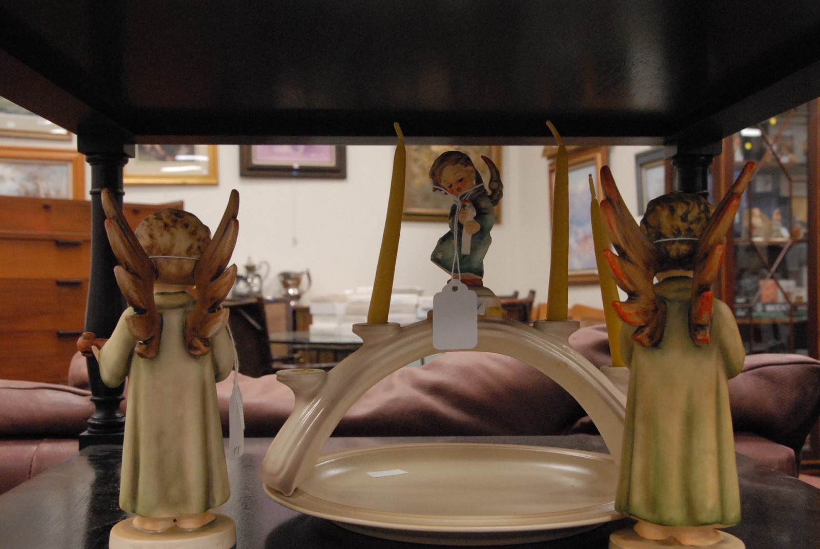 Four piece Hummel lot to include two winged angels, plus a plate with an arch of candles with an angel.