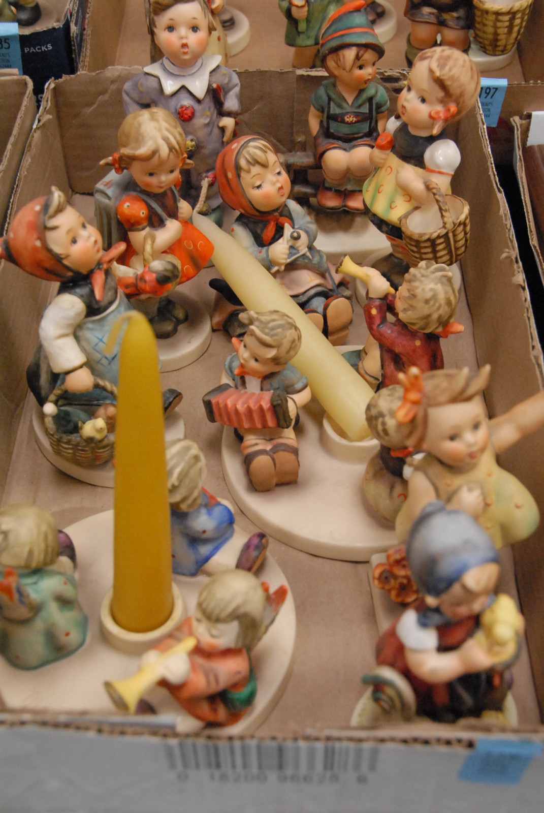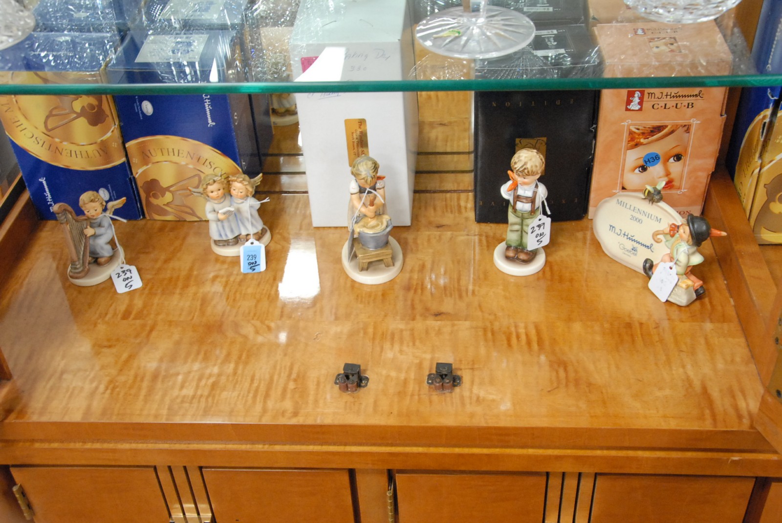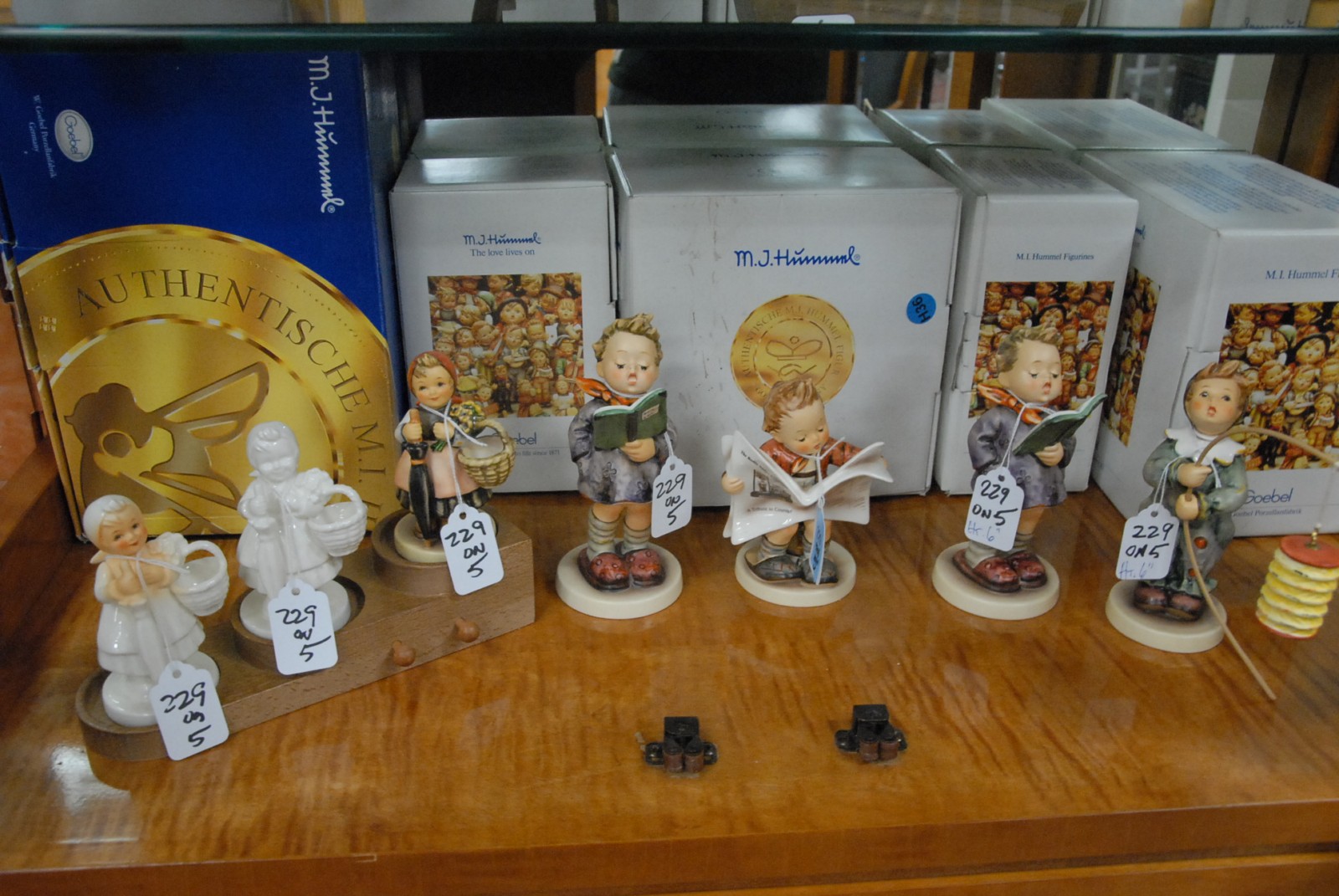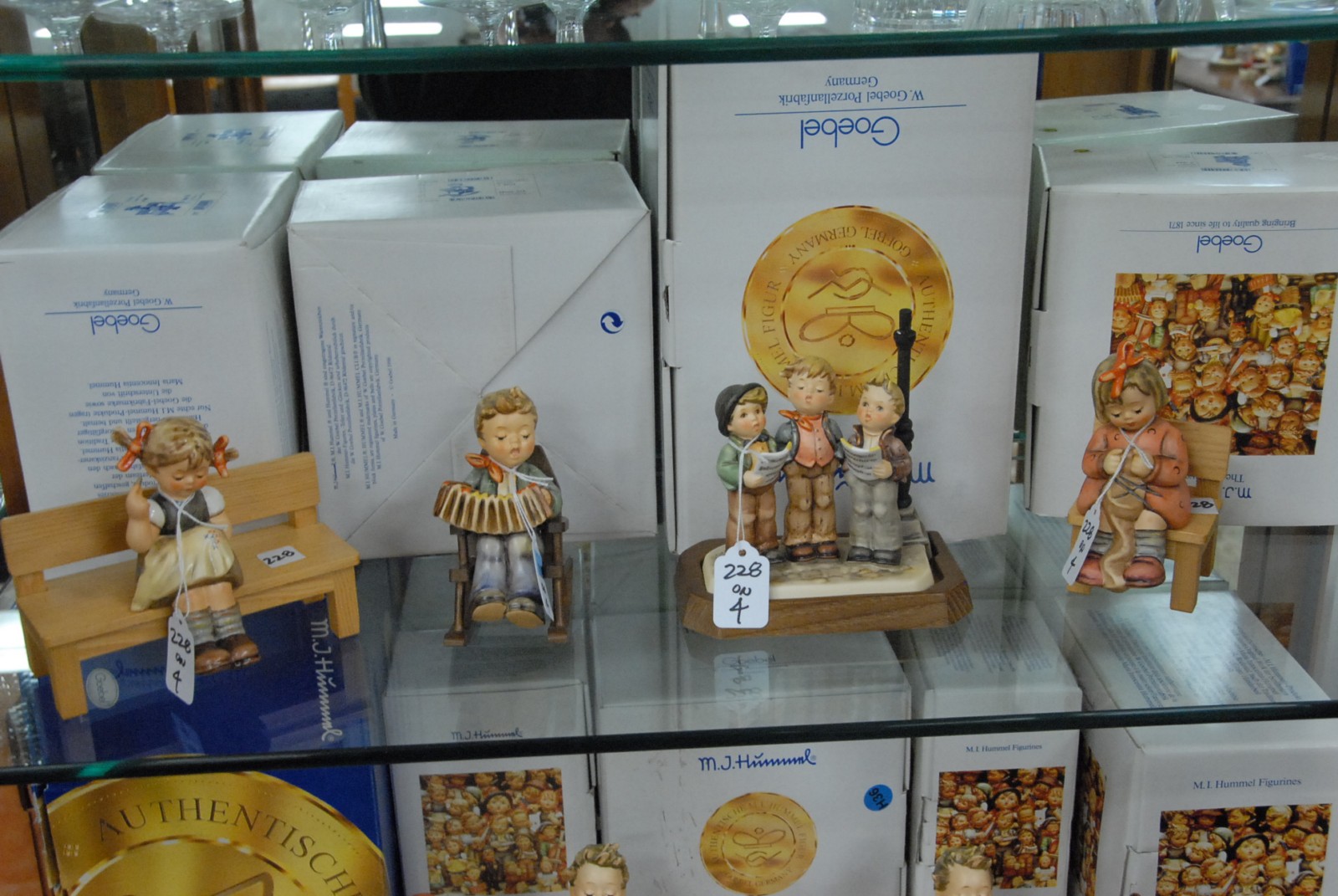 Four Hummels with original boxes, including Nimble Fingers, Practice Makes Perfect, To Keep You Warm, and A Tuneful Trio