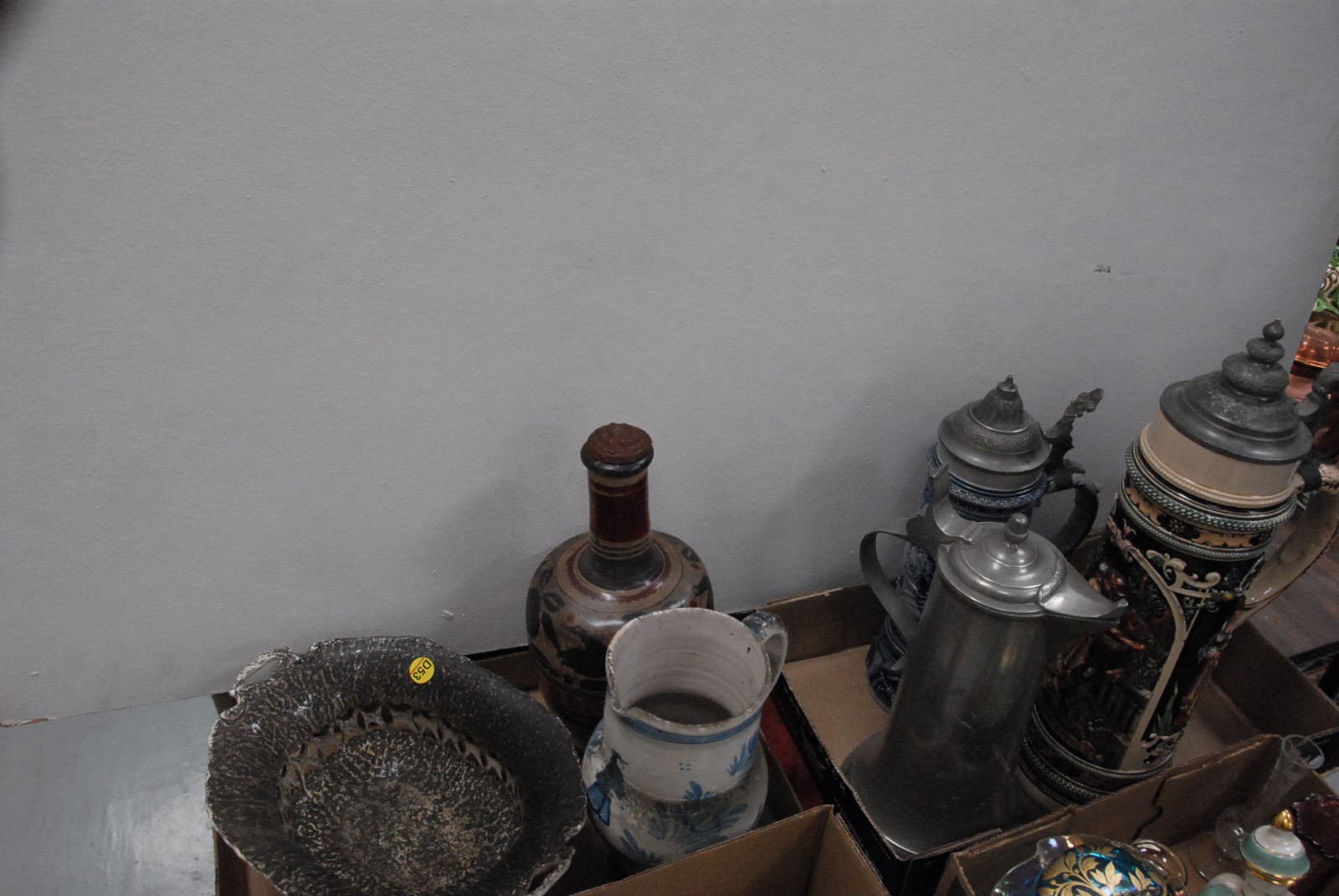 Two box lots to include Quimper pitcher, pewter tanker, three steins, pottery bottle, and Staffordshire bowl