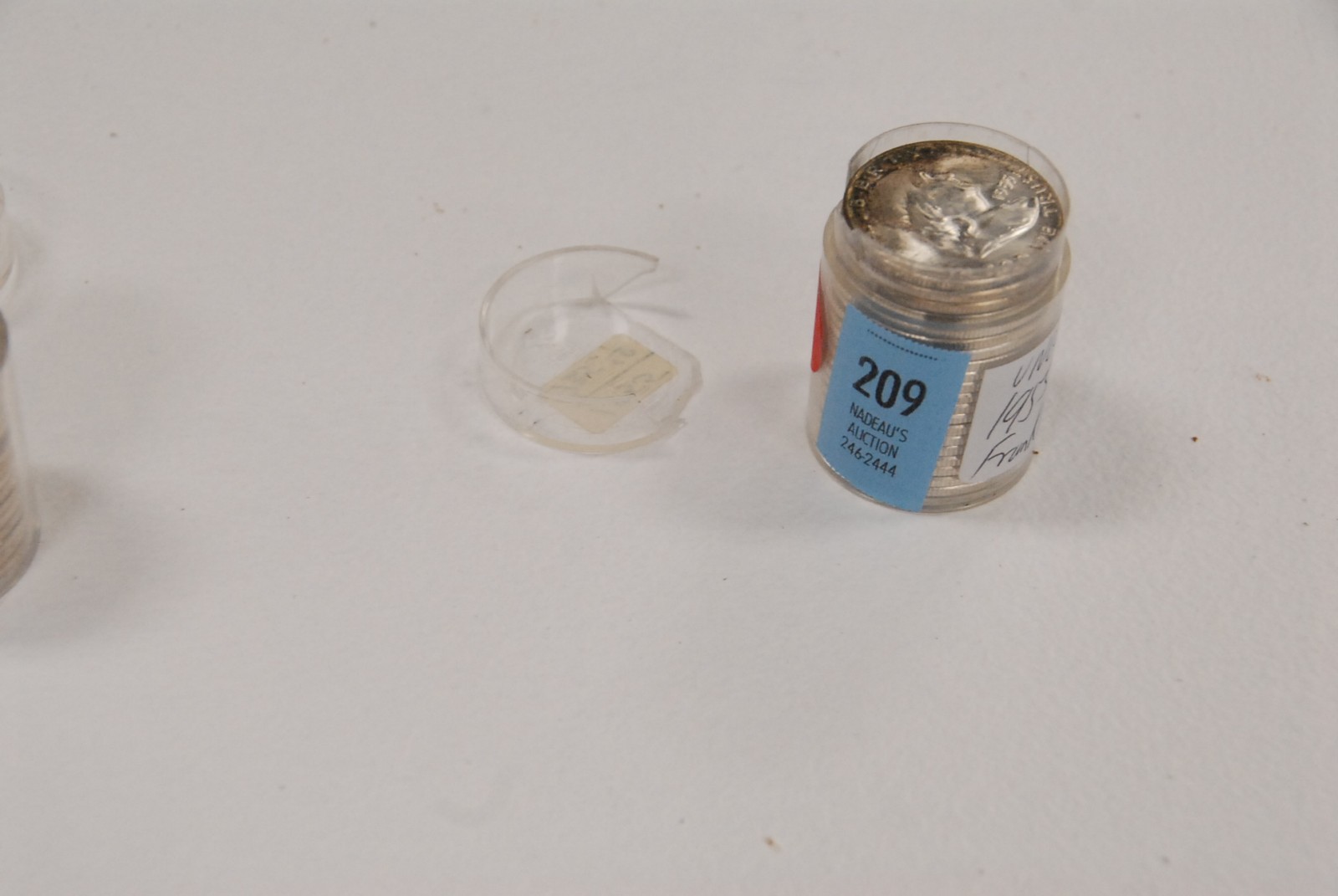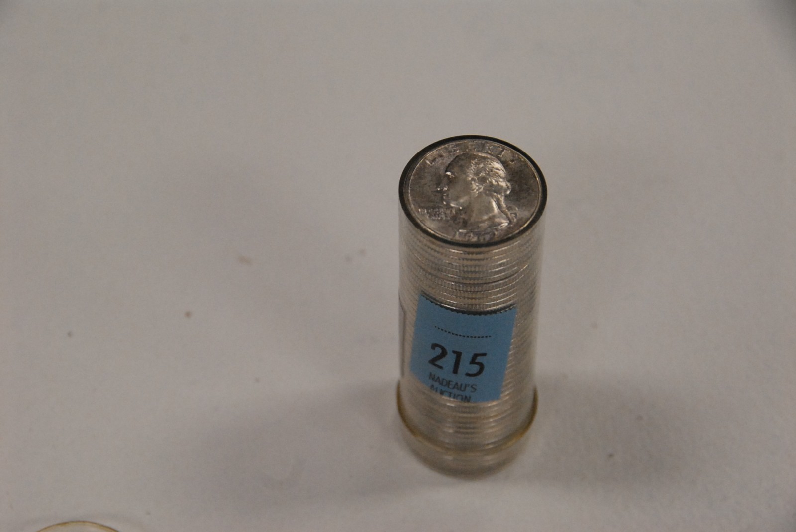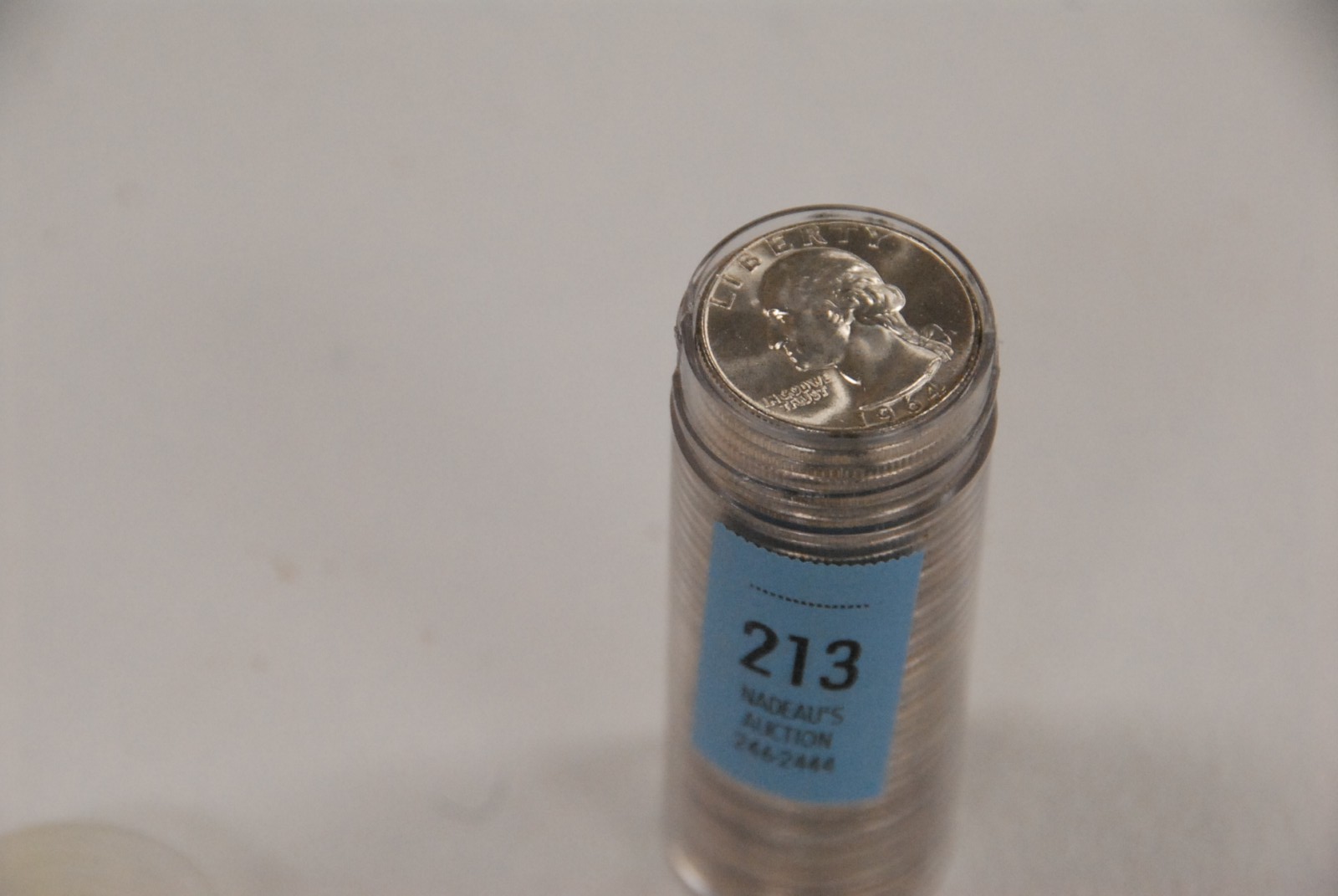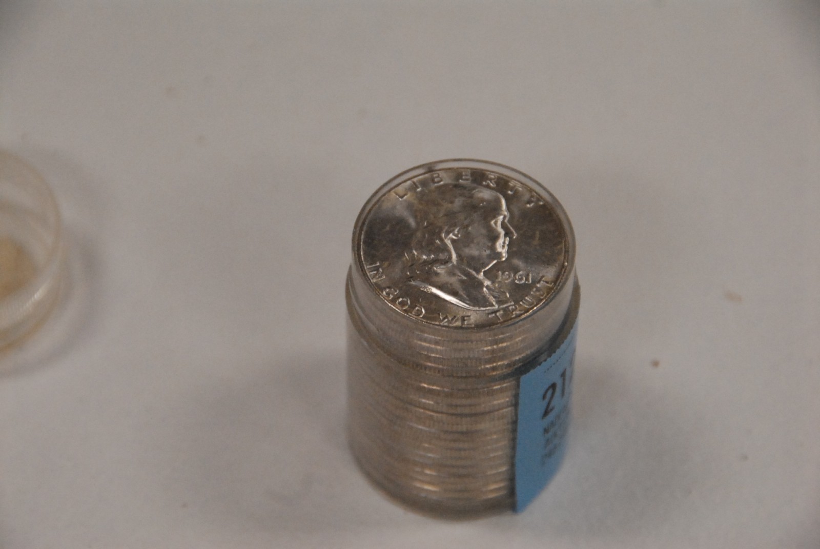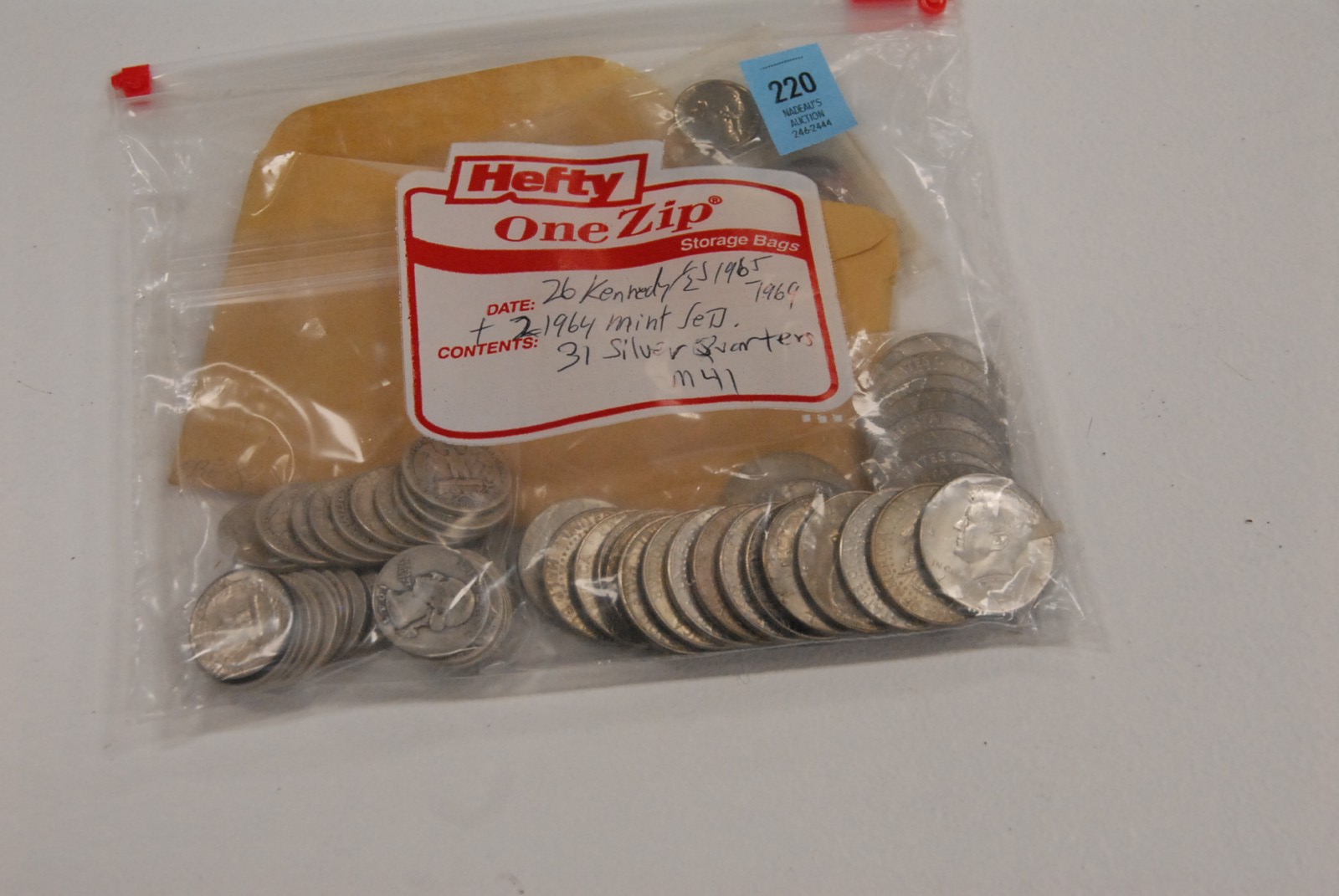 Bag lot of silver coins, twenty six Kennedy half dollars 1965 to 1969, two 1964 mint sets, thirty one silver quarters