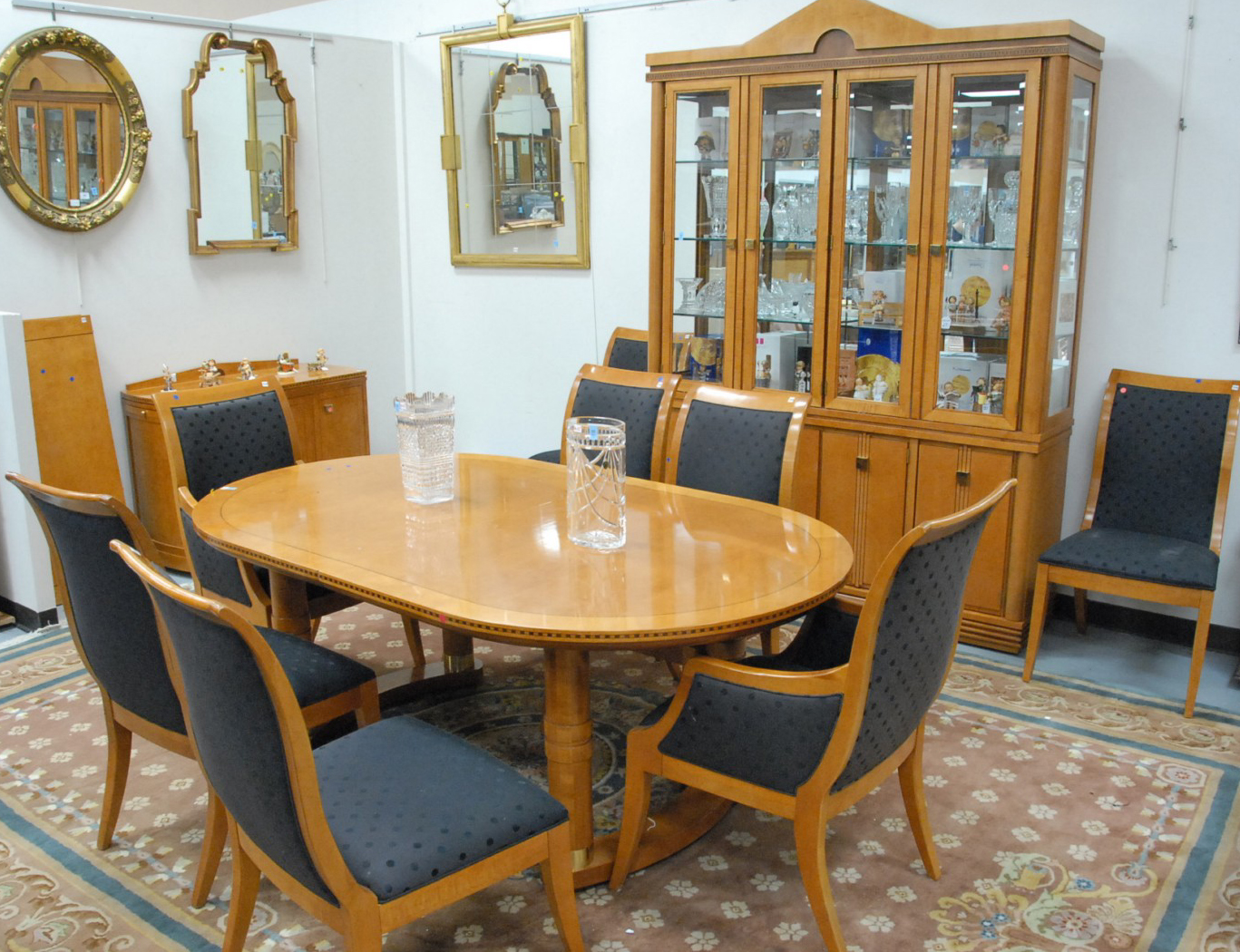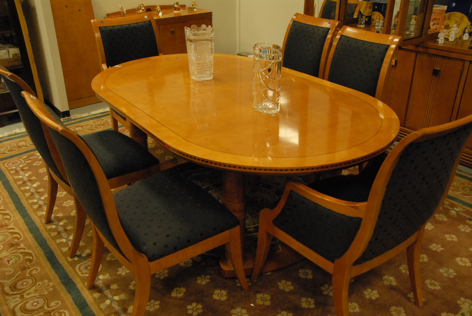 Hickory White oval dining table and eight upholstered chairs with two leaves