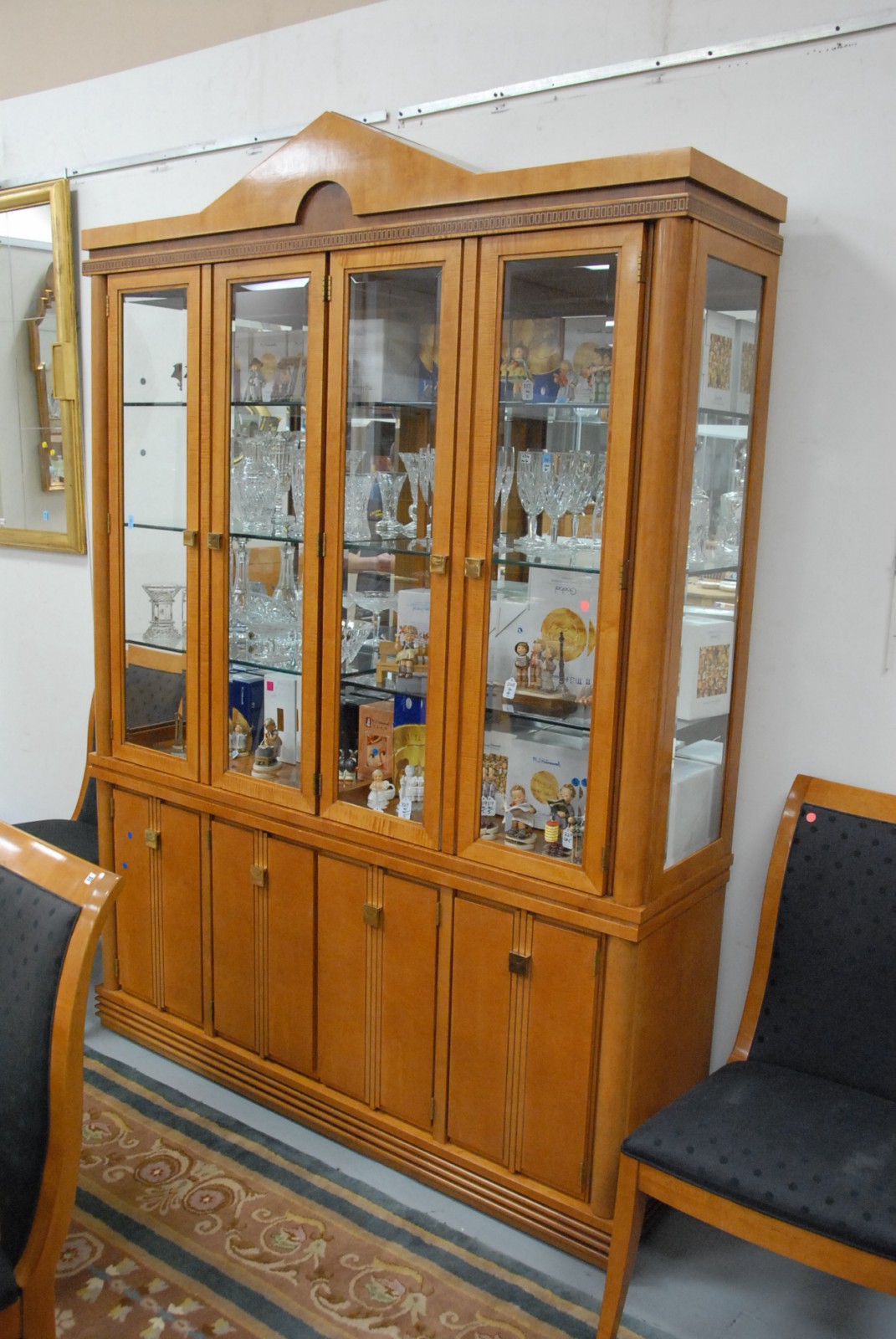 Hickory White breakfront with four beveled glass doors, glass shelves, and mirrored back