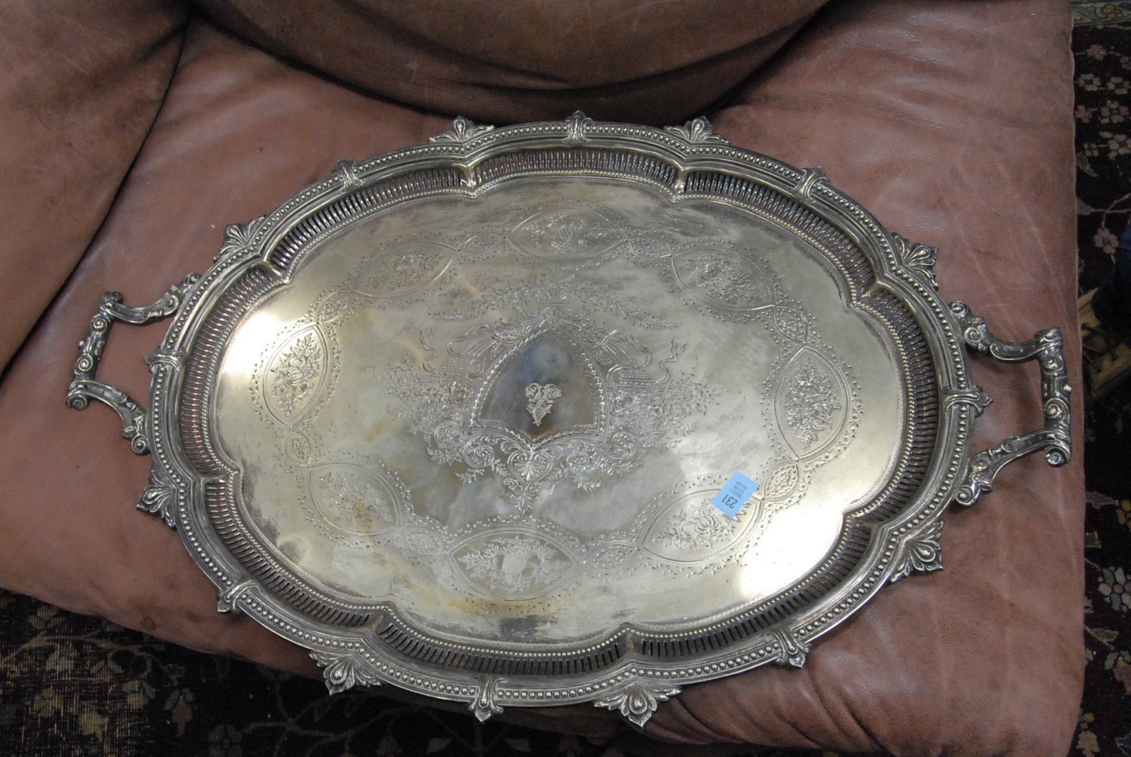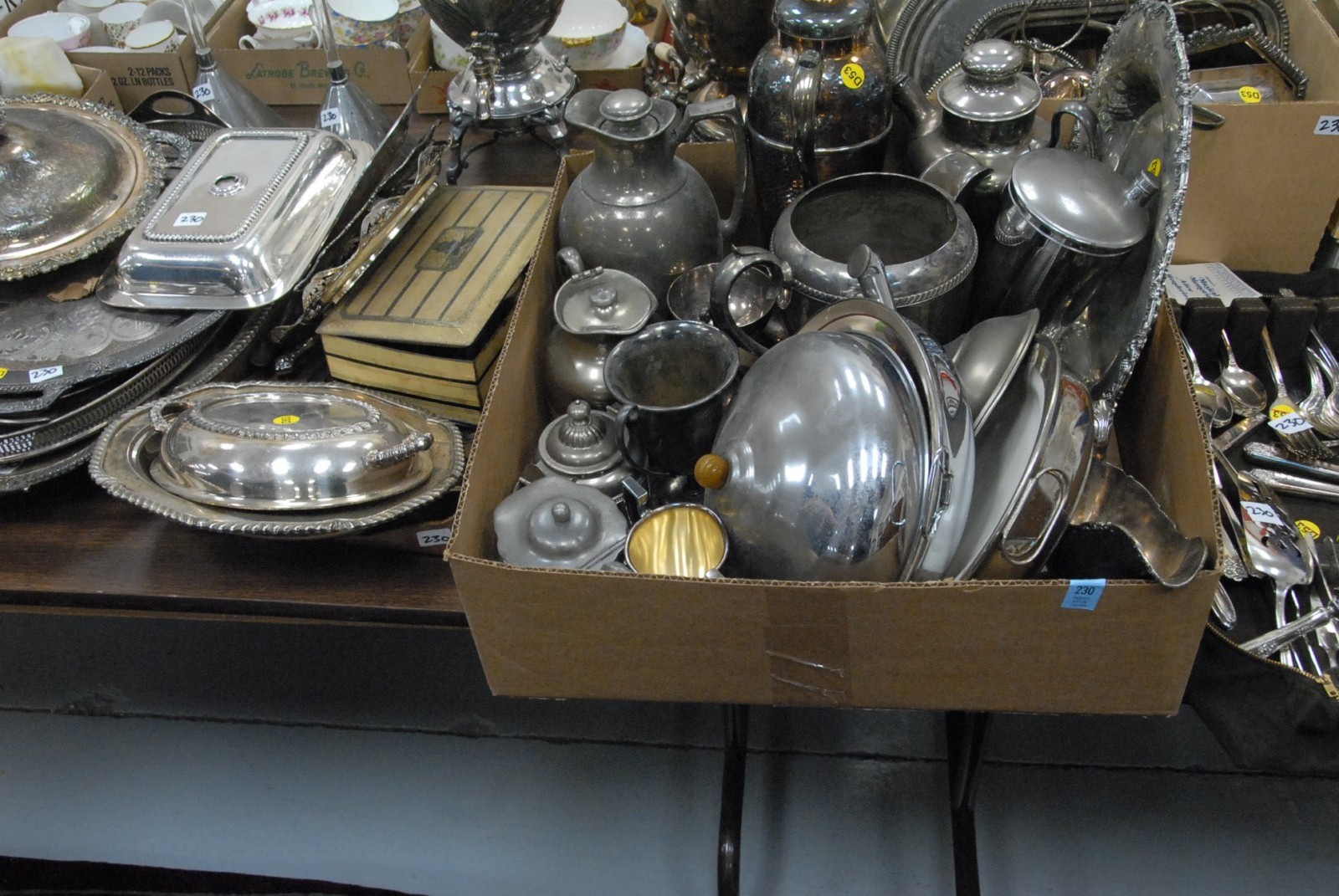 Large grouping of silver plated items to include several trays, gallery tray, covered dishes , coffee urns no covers, round trays, small silver plated flatware set, misc