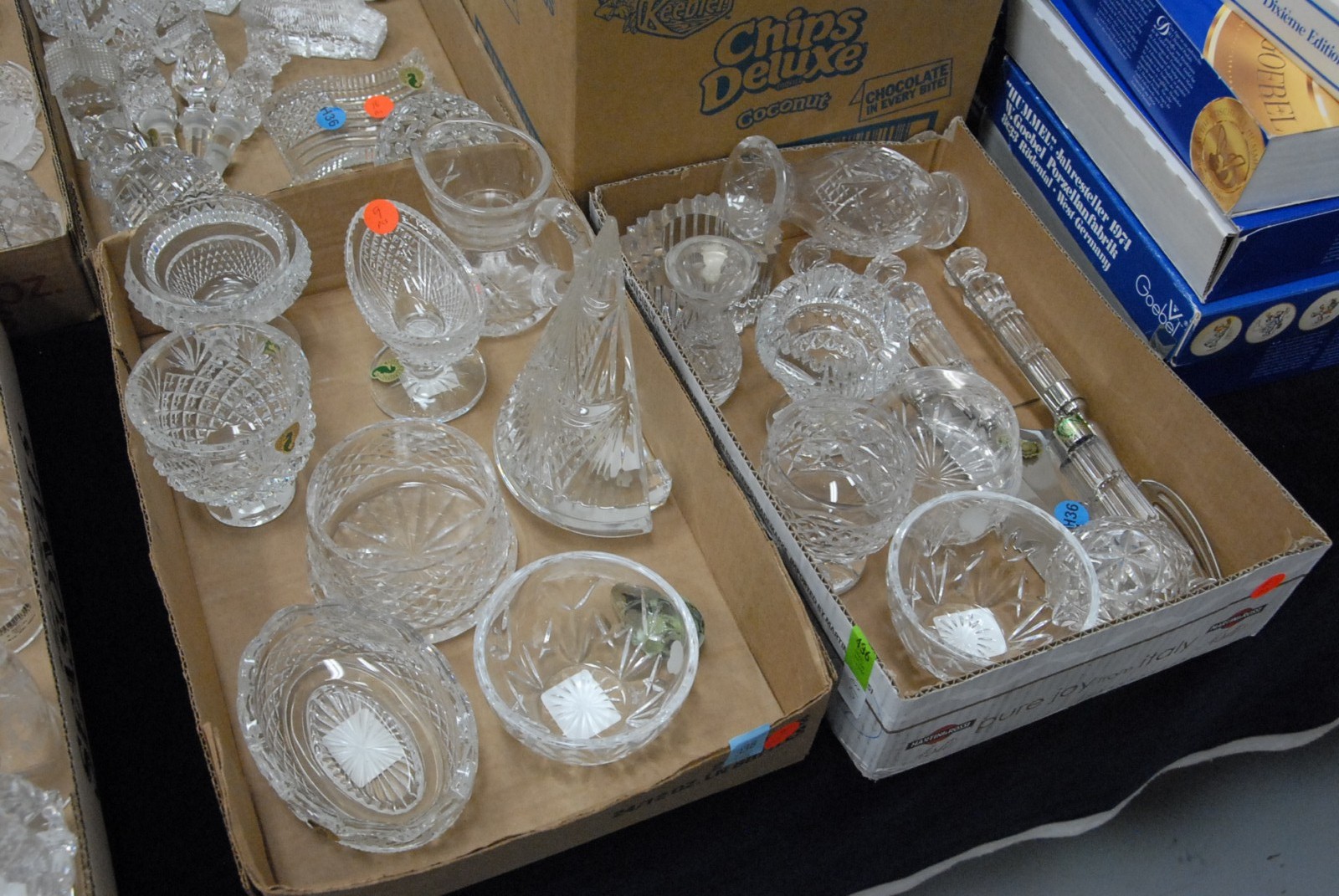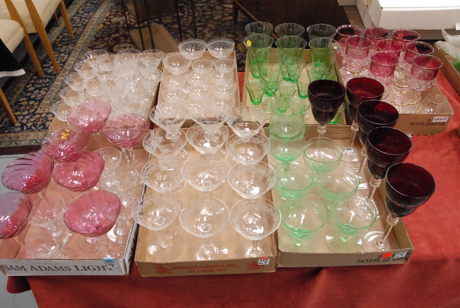 Seven box lots of various of crystal and stems including, green stems, ruby glass stems, crystal stems, etc