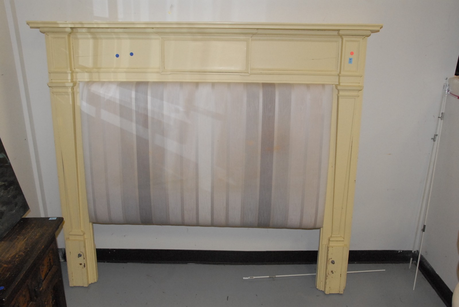 Vintage fireplace mantle, made into headboard with upholstered center