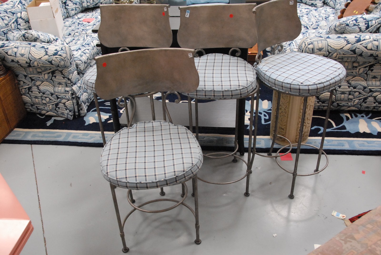 Four metal stools, three of one height , one lower