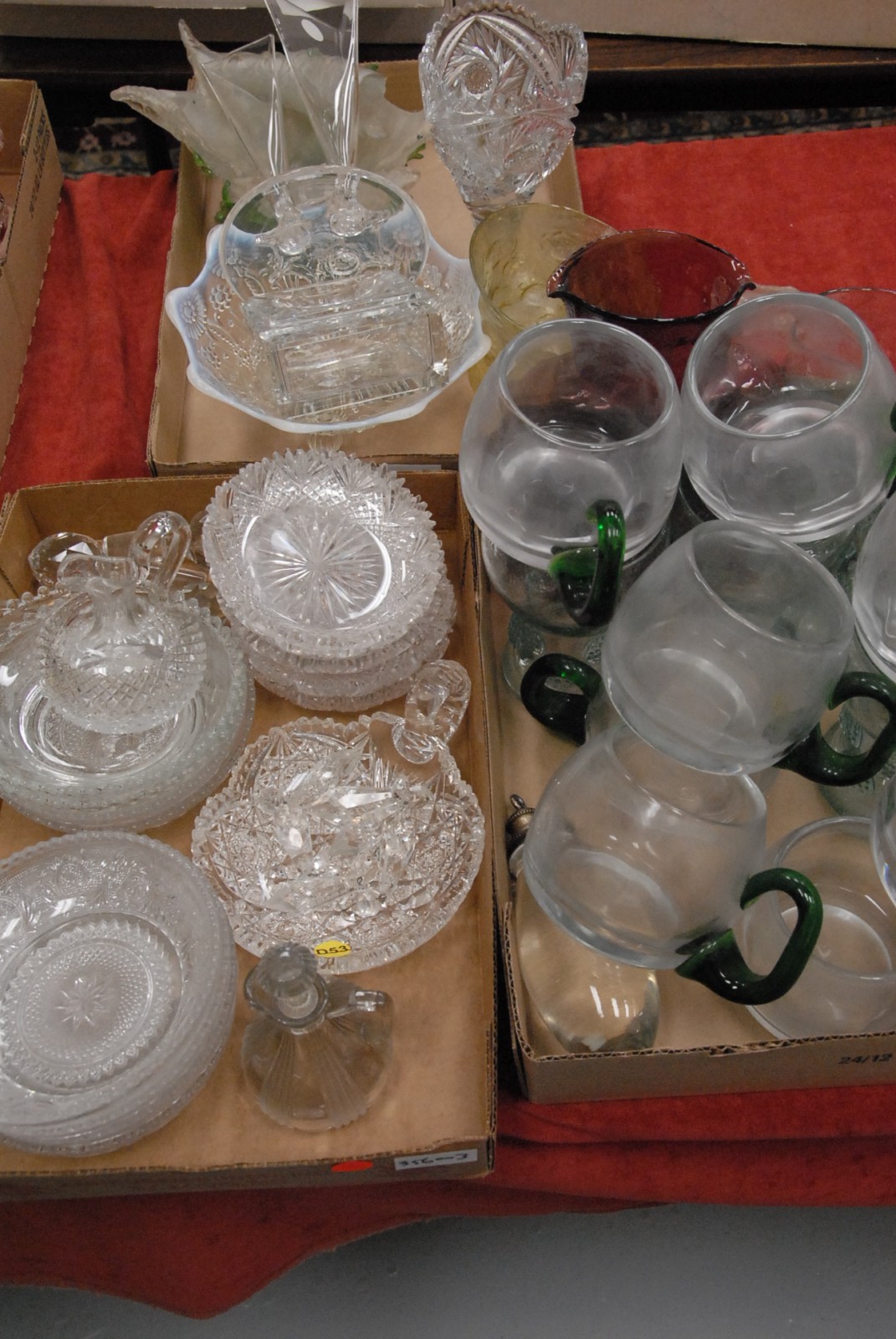 Three box lots to include small cut glass dishes, crystal mugs, glass, Venetian glass shell as is