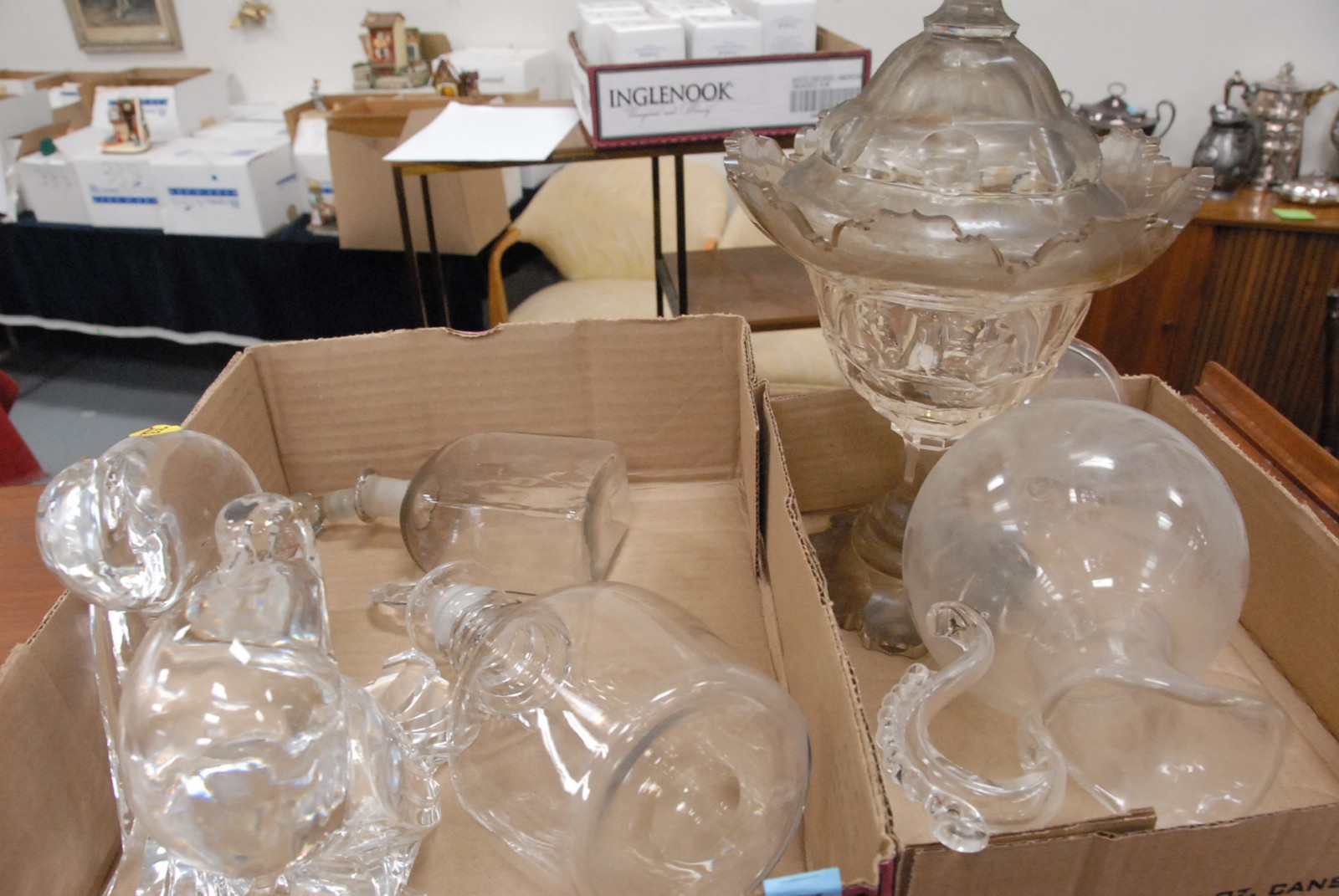 Two box lots including Anglo Irish crystal dish with a cover, three decanters,and two Stueben birds with small chips
