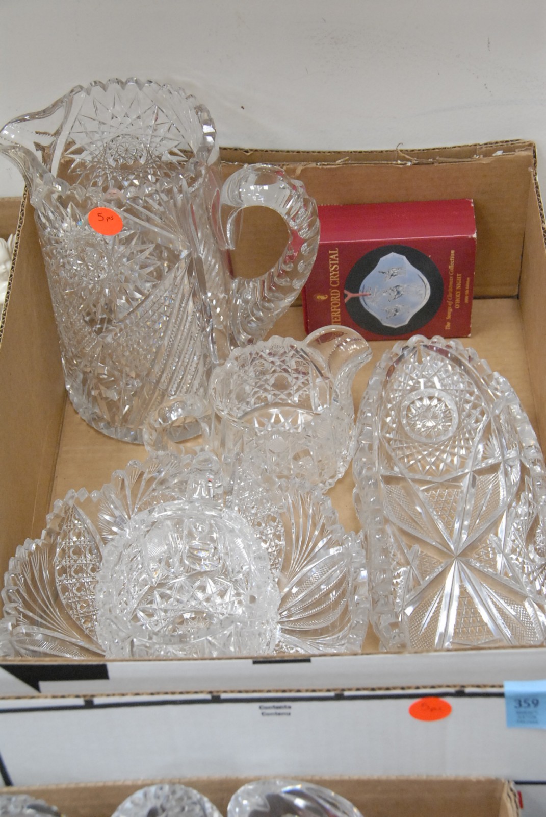 Box lot of antique cut glass, sugar, creamer, two dishes, and a pitcher