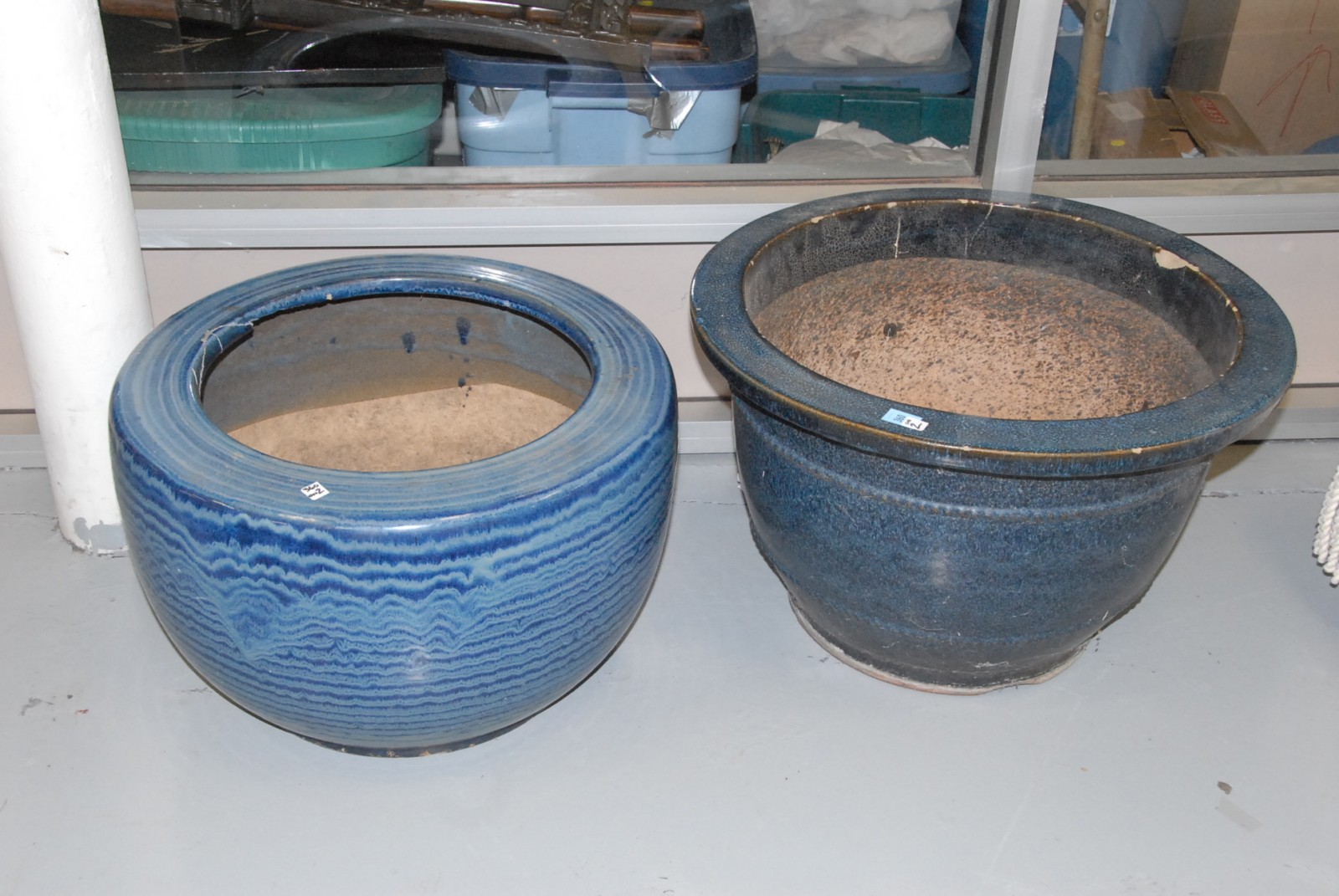 Two stoneware jardinieres one with a chip, one with repair on lip