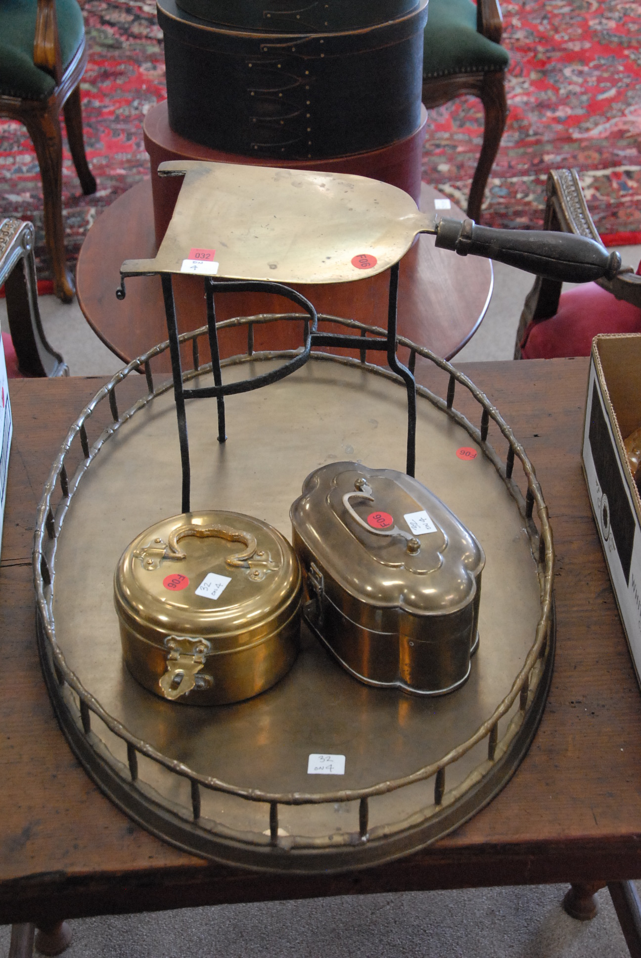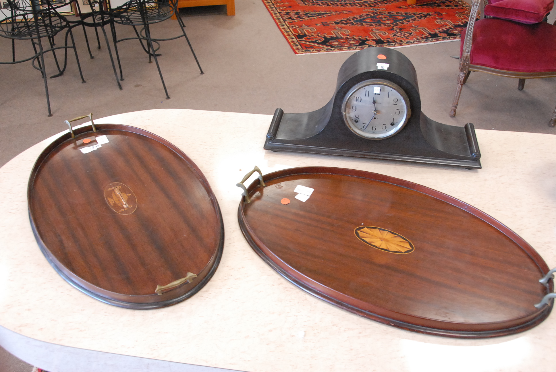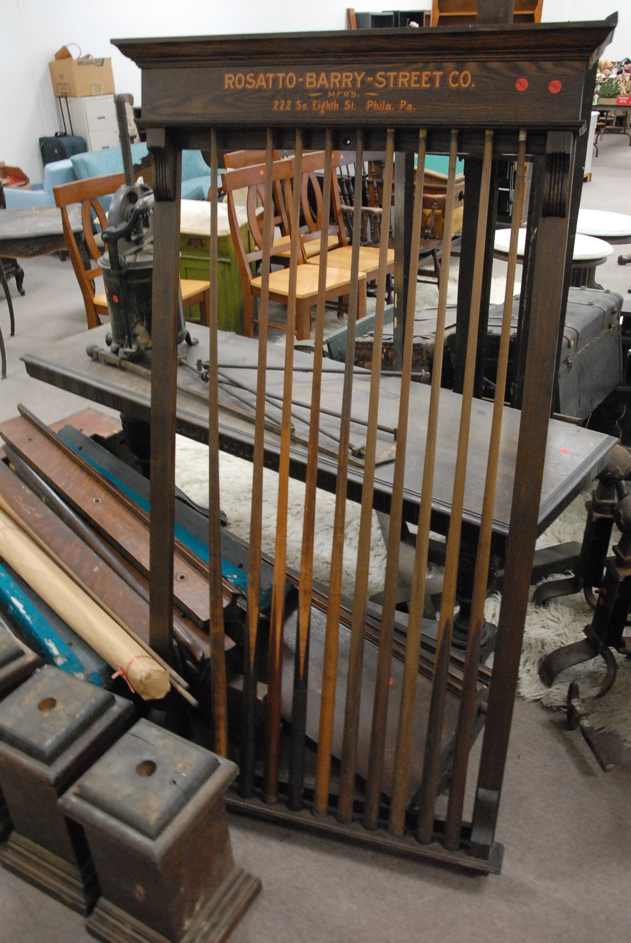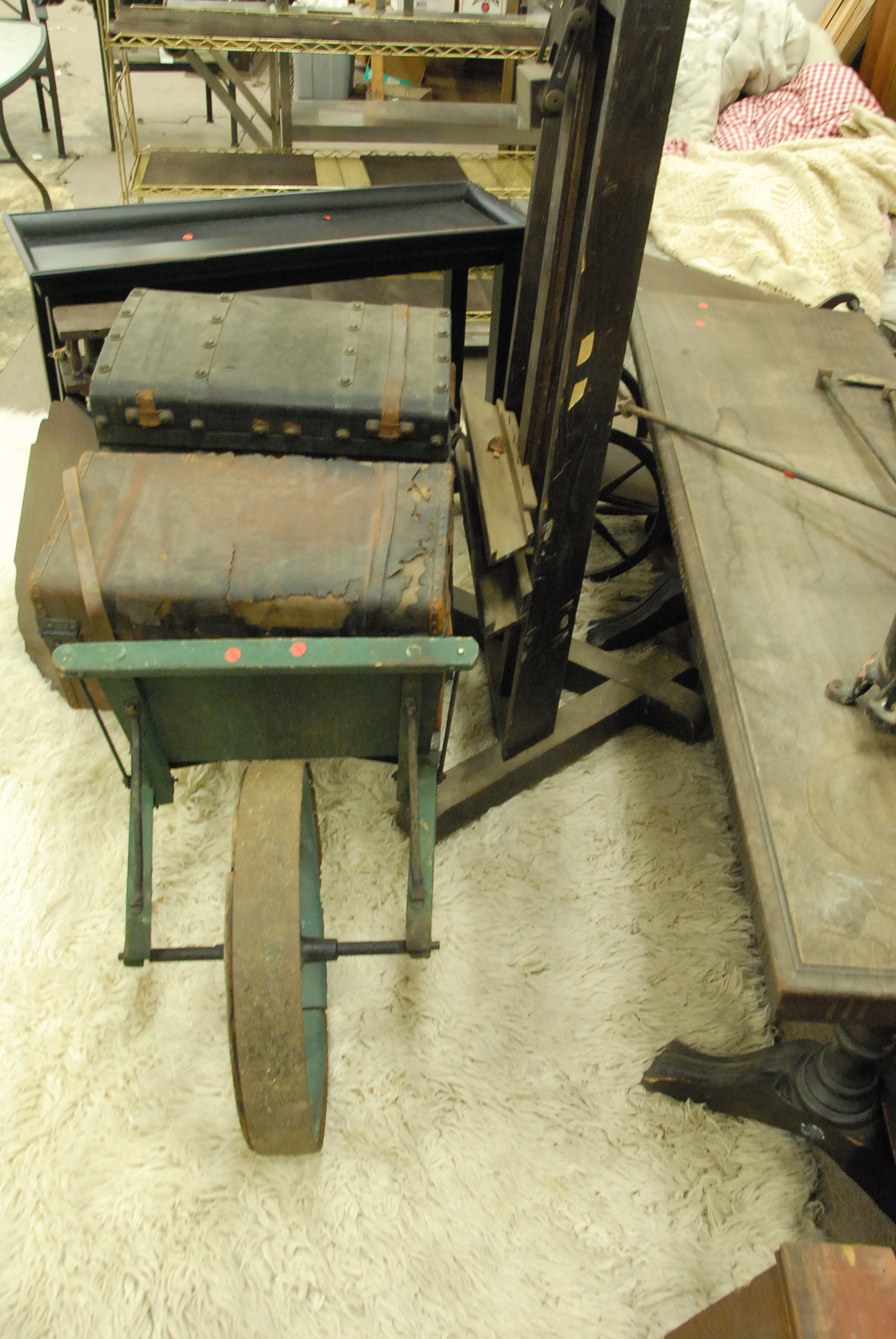 Large group of furniture, two hall tables, tea cart, wheel barrel, two leather trunks, easel, coffee grinder, pair of andirons, and a tip top table as is