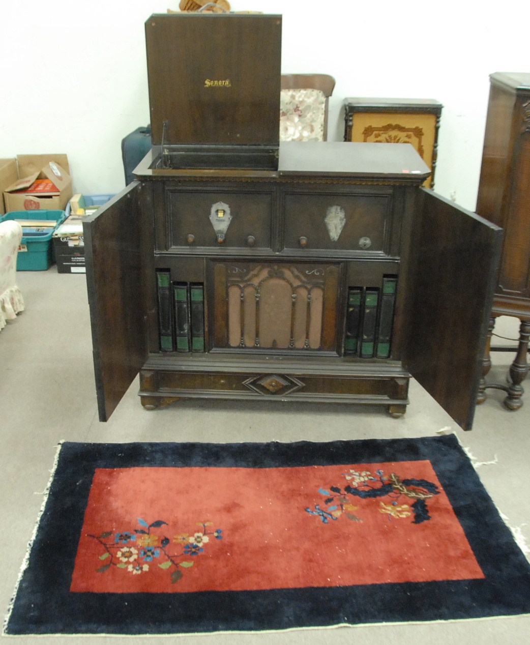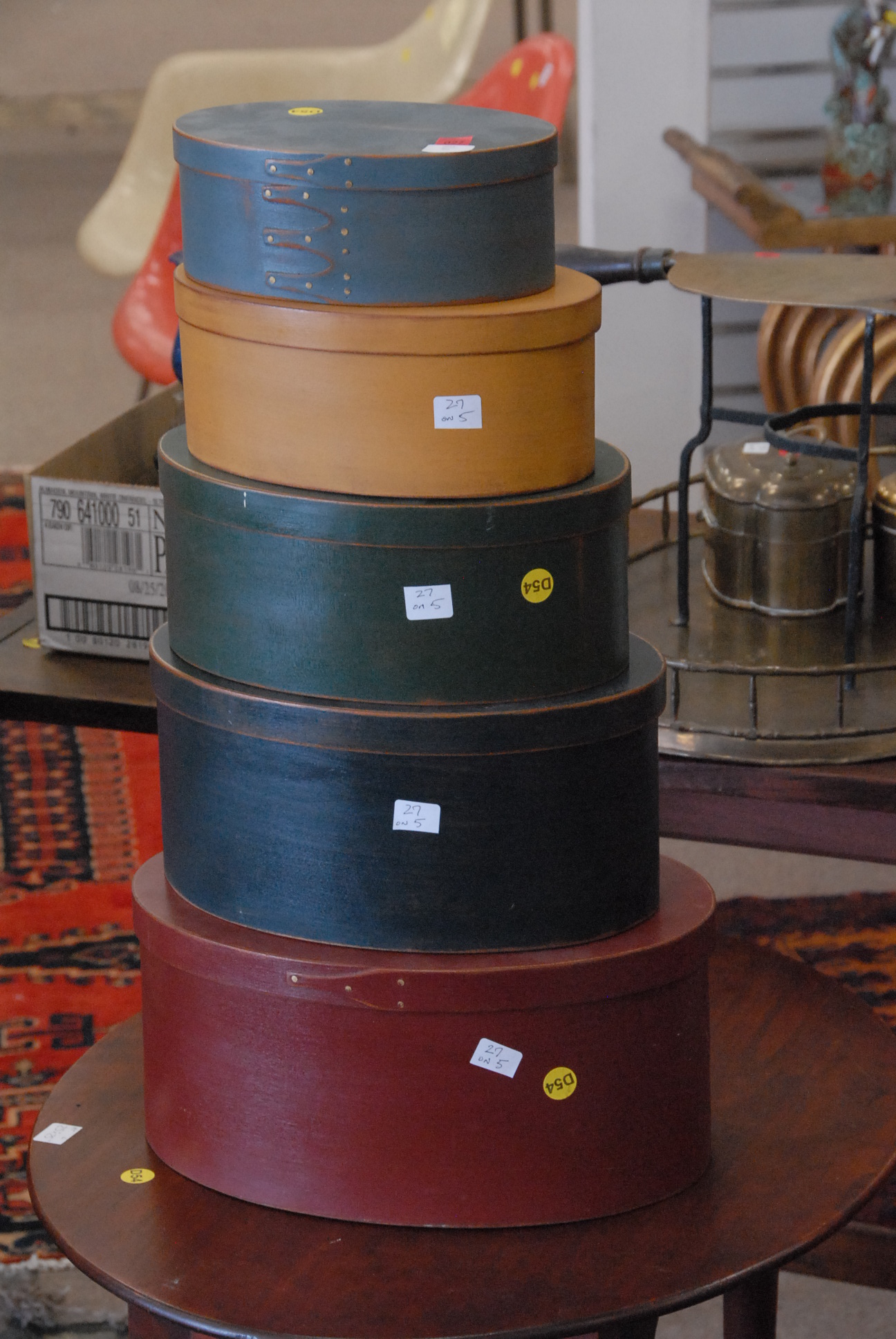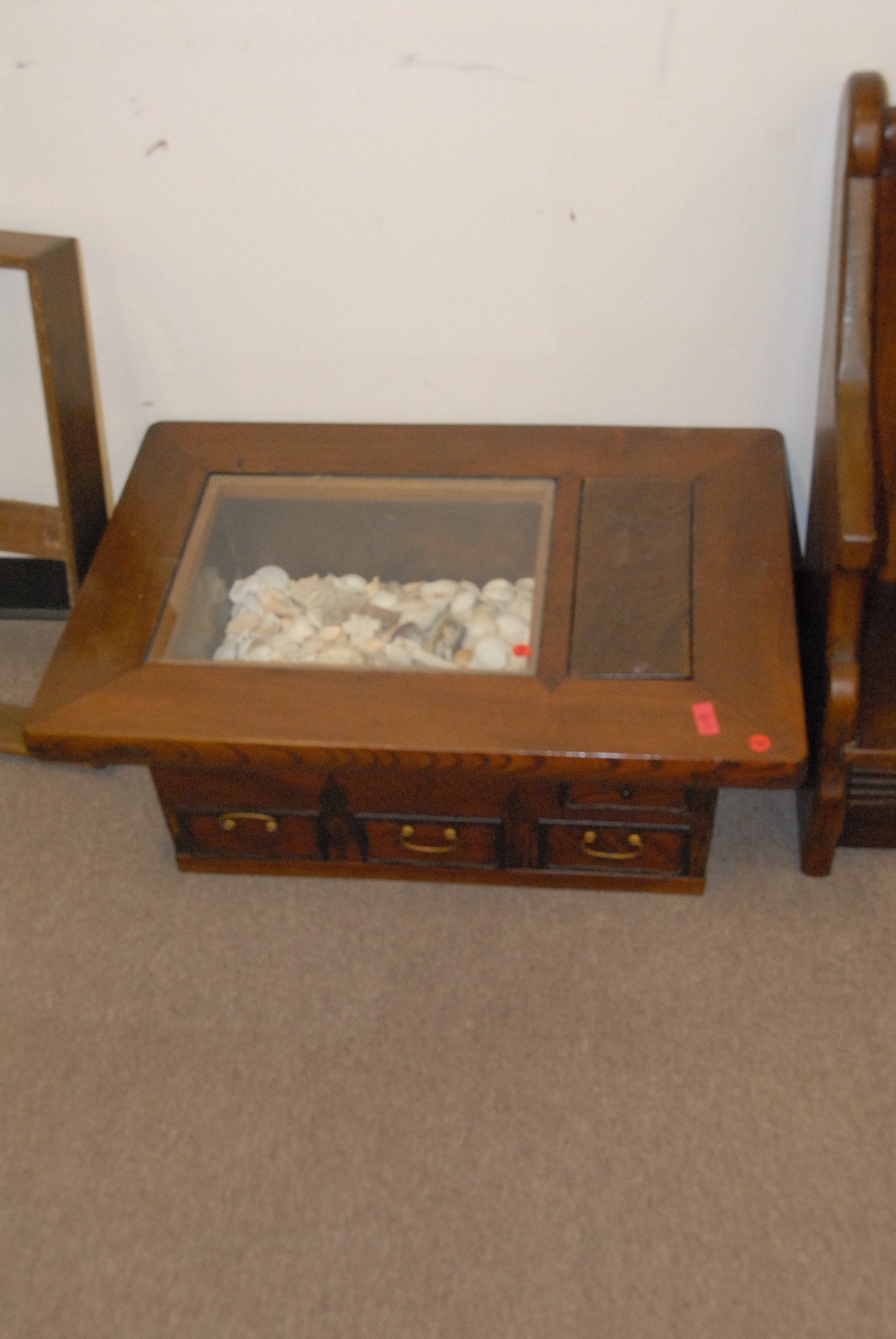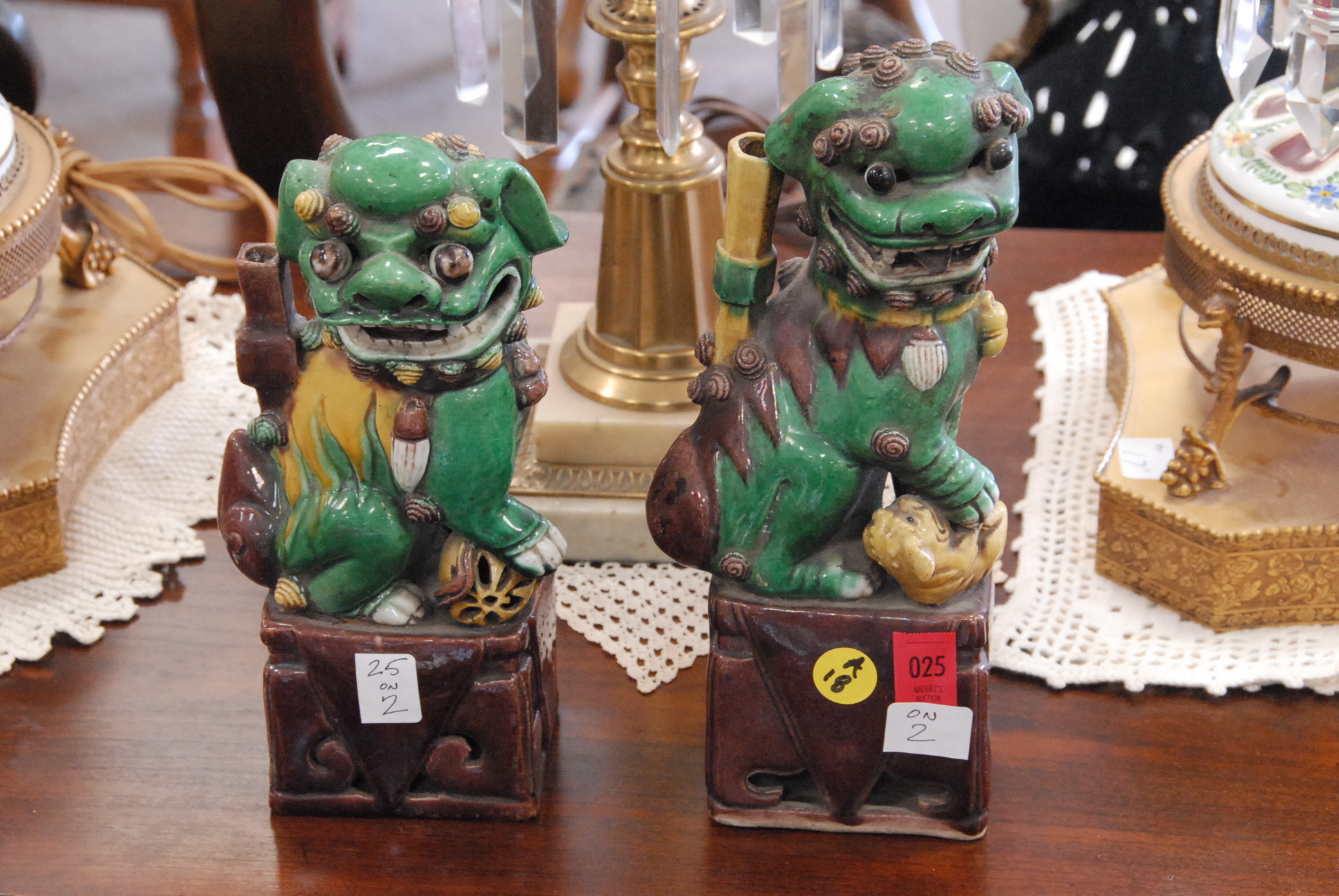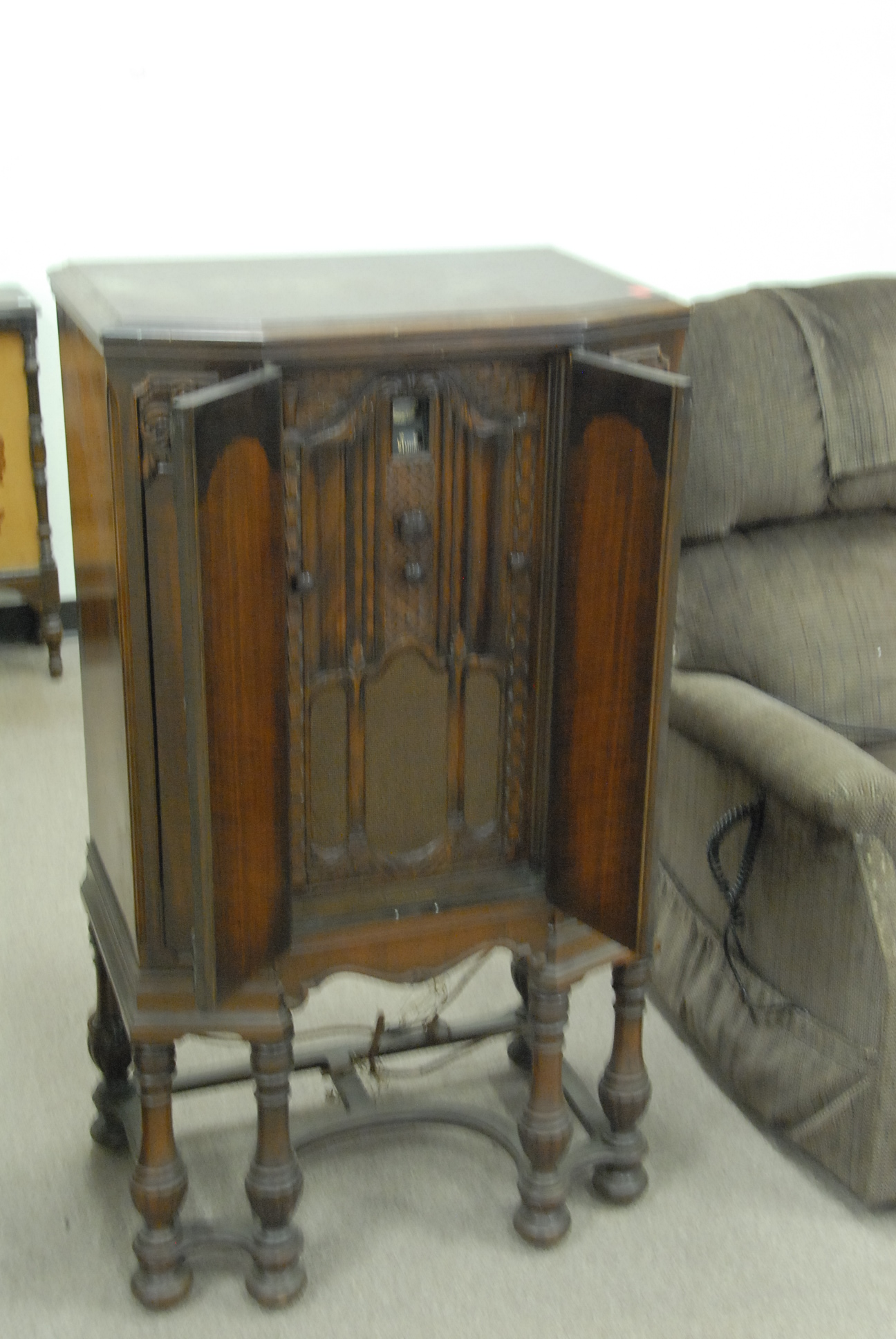 Large group of furniture, two hall tables, tea cart, wheel barrel, two leather trunks, easel, coffee grinder, pair of andirons, and a tip top table as is