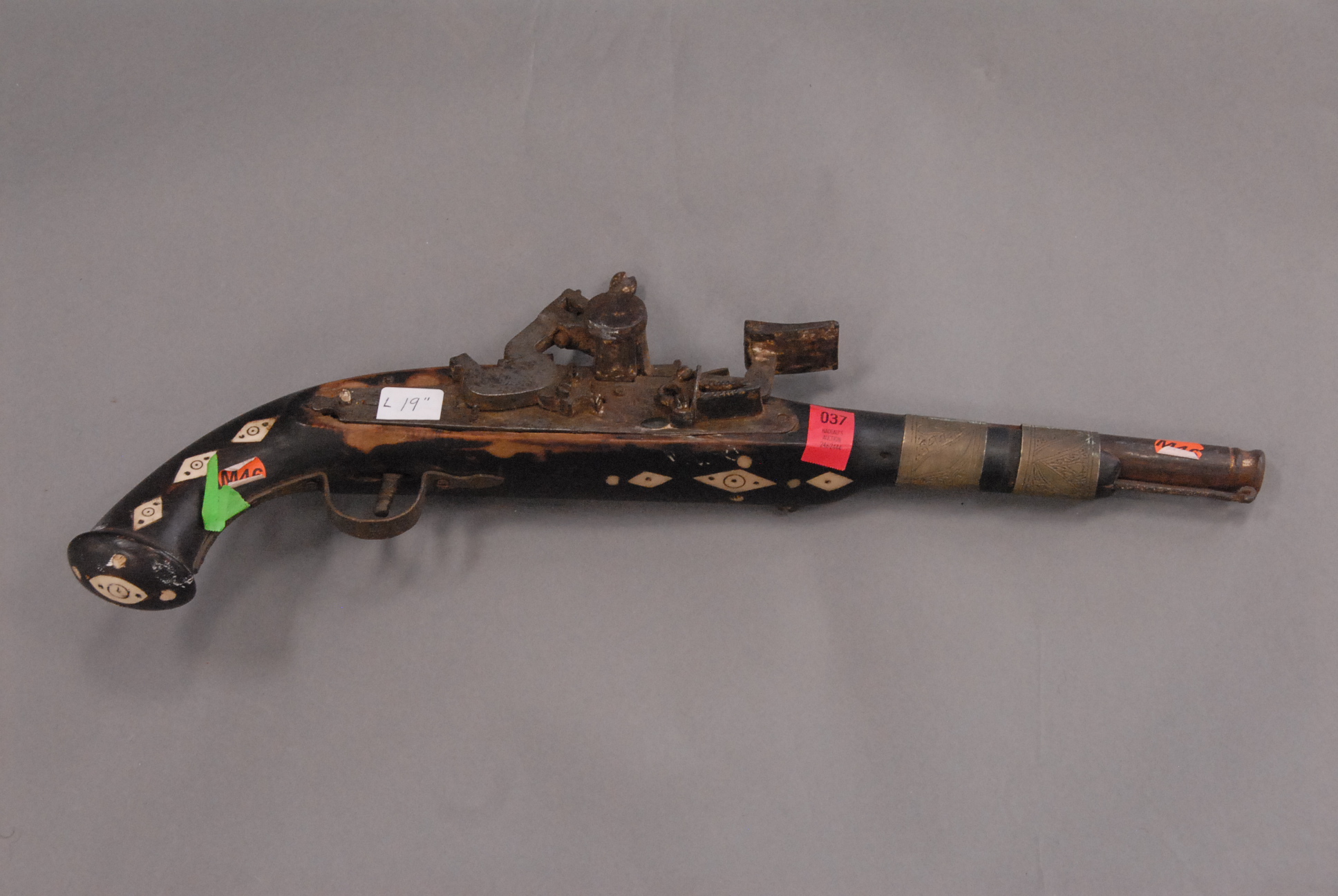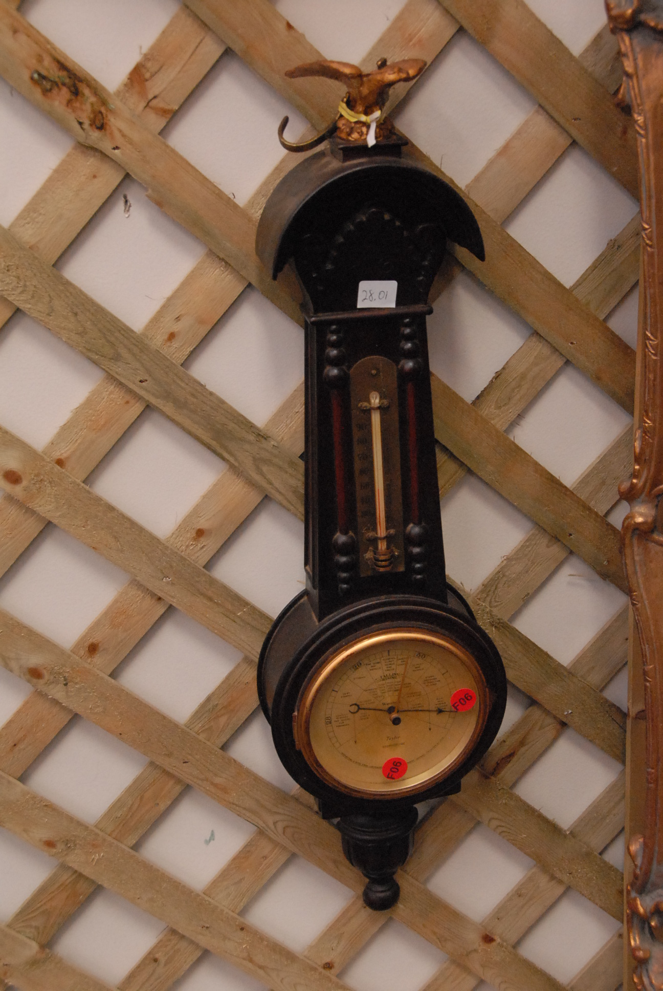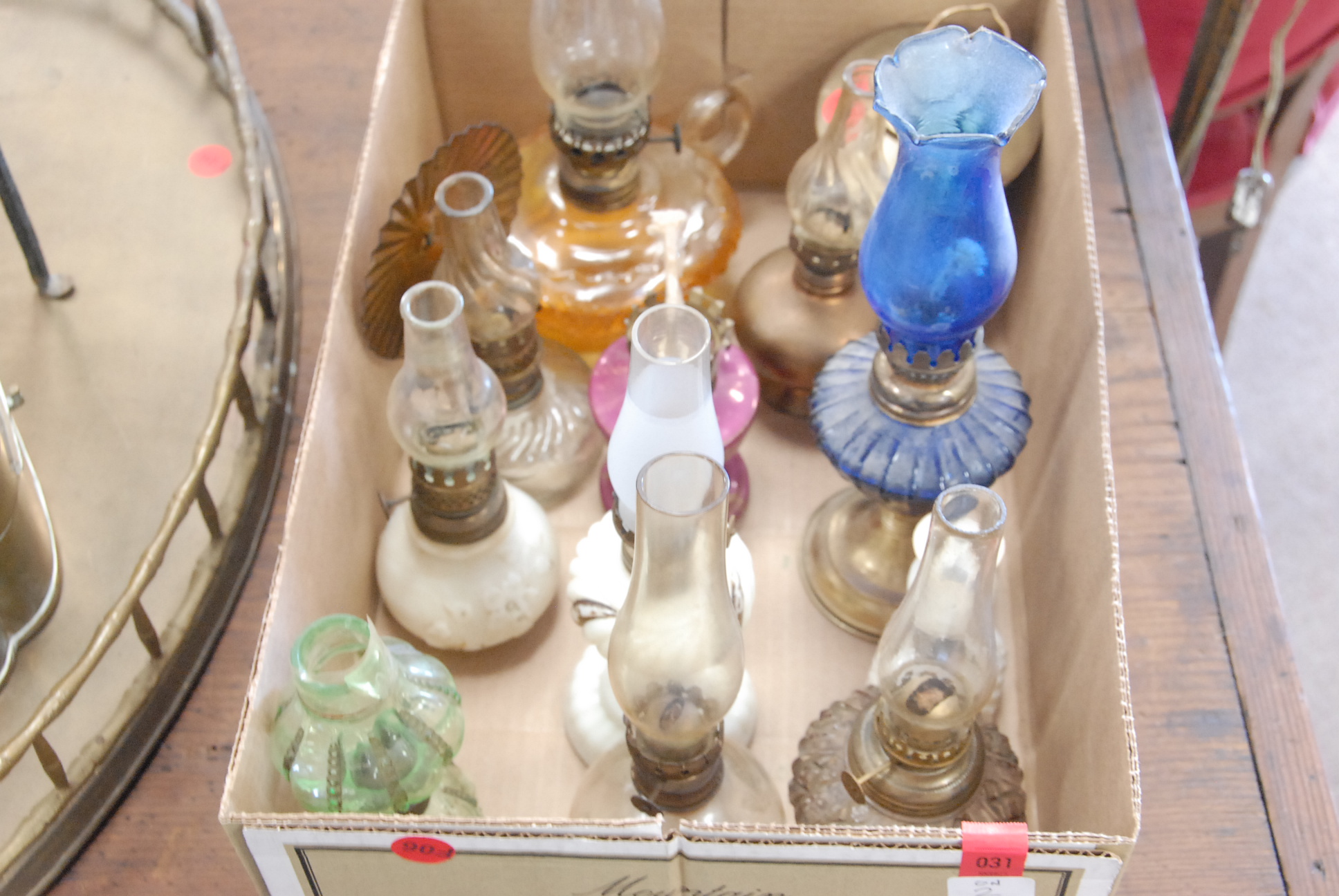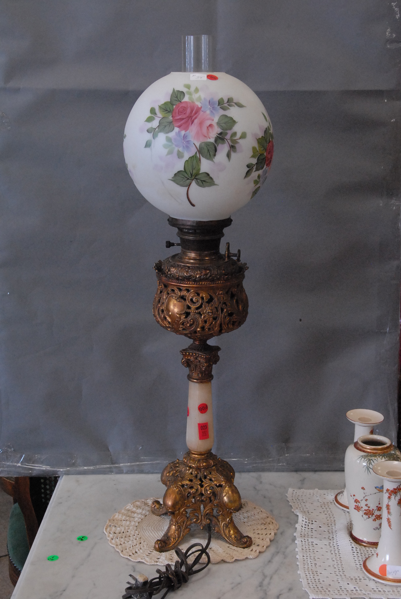 Large group of furniture, two hall tables, tea cart, wheel barrel, two leather trunks, easel, coffee grinder, pair of andirons, and a tip top table as is
