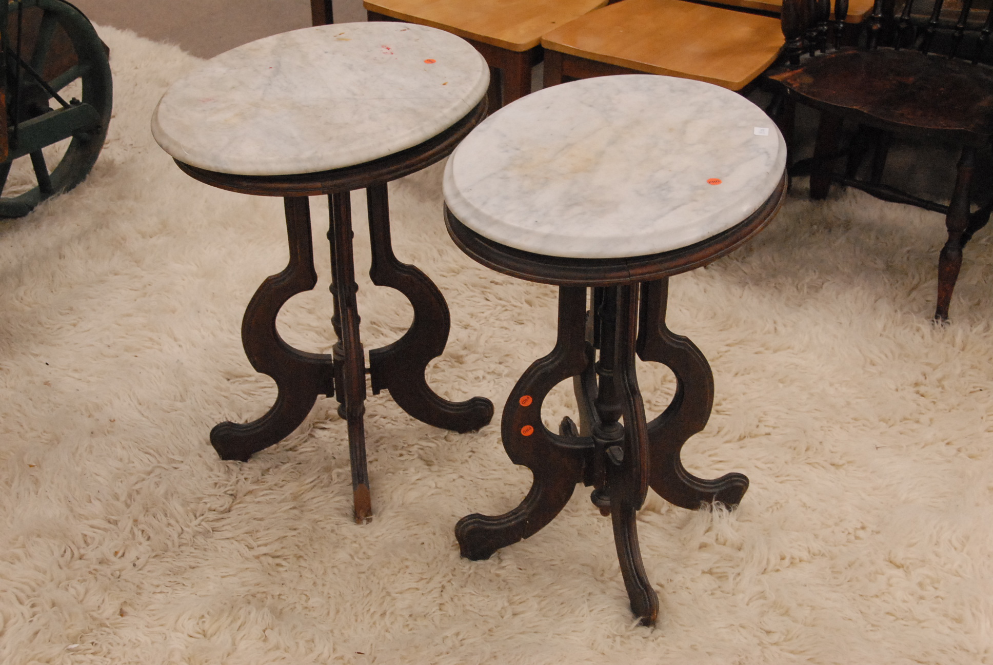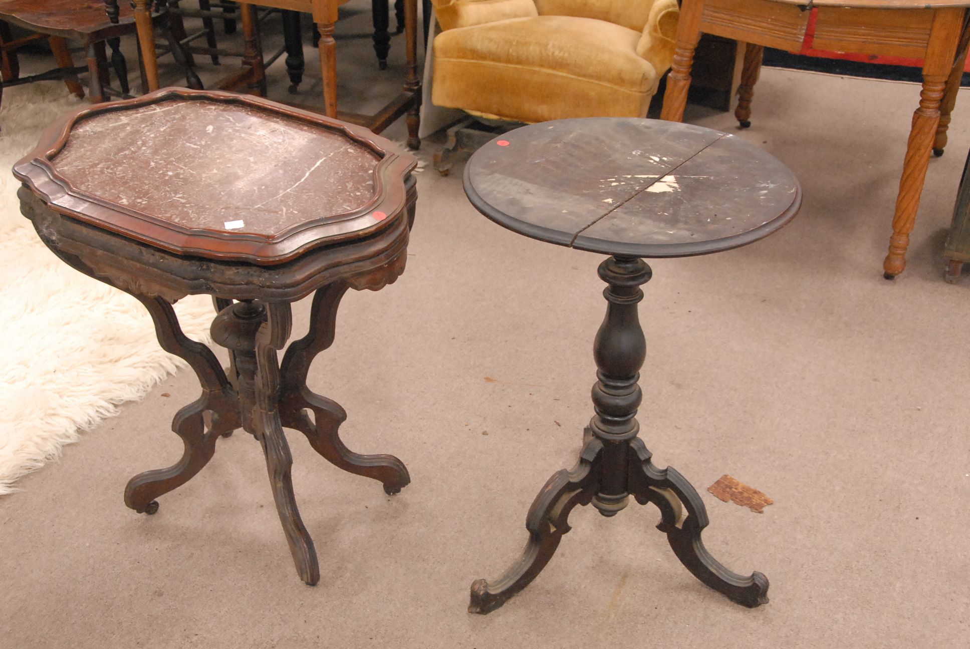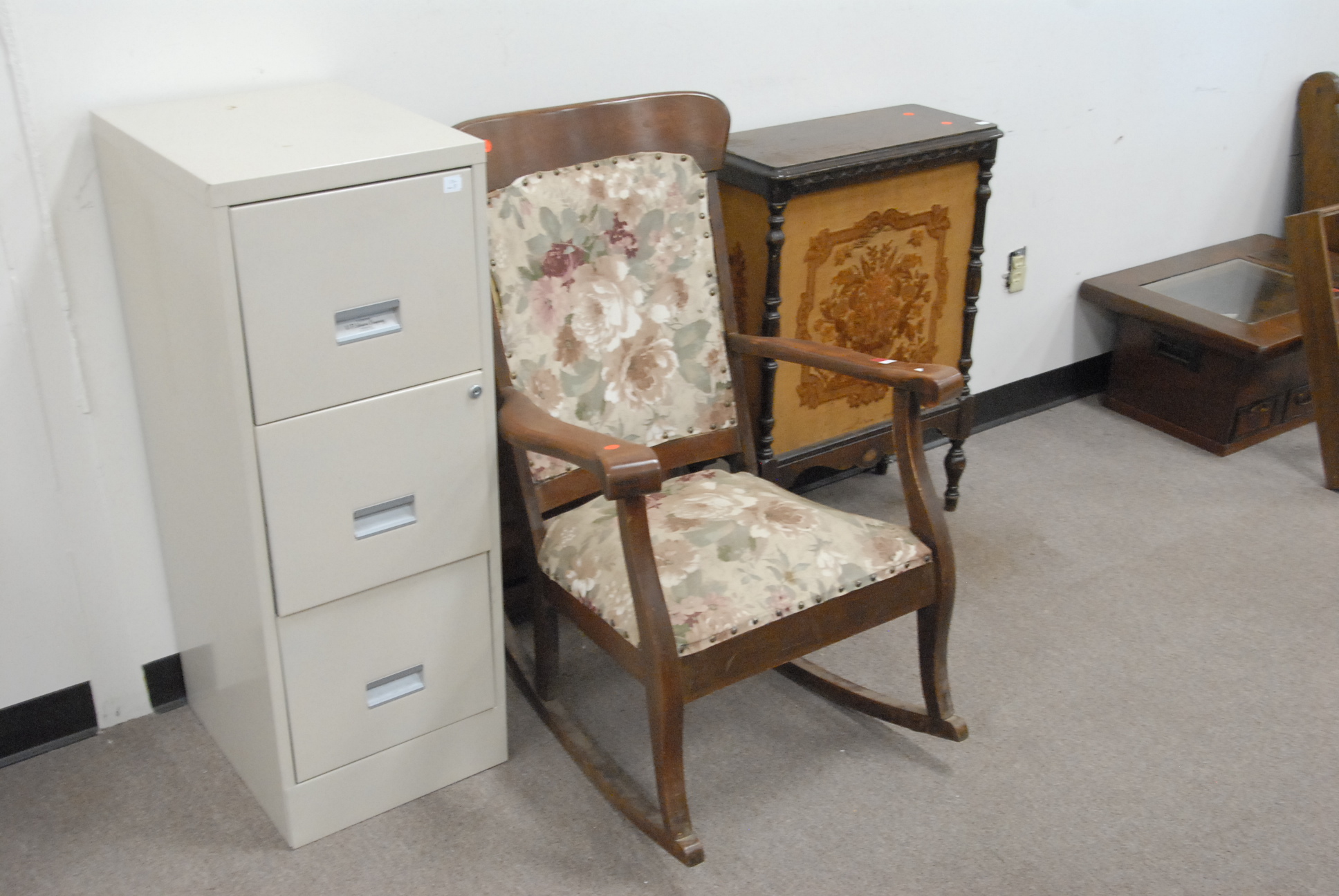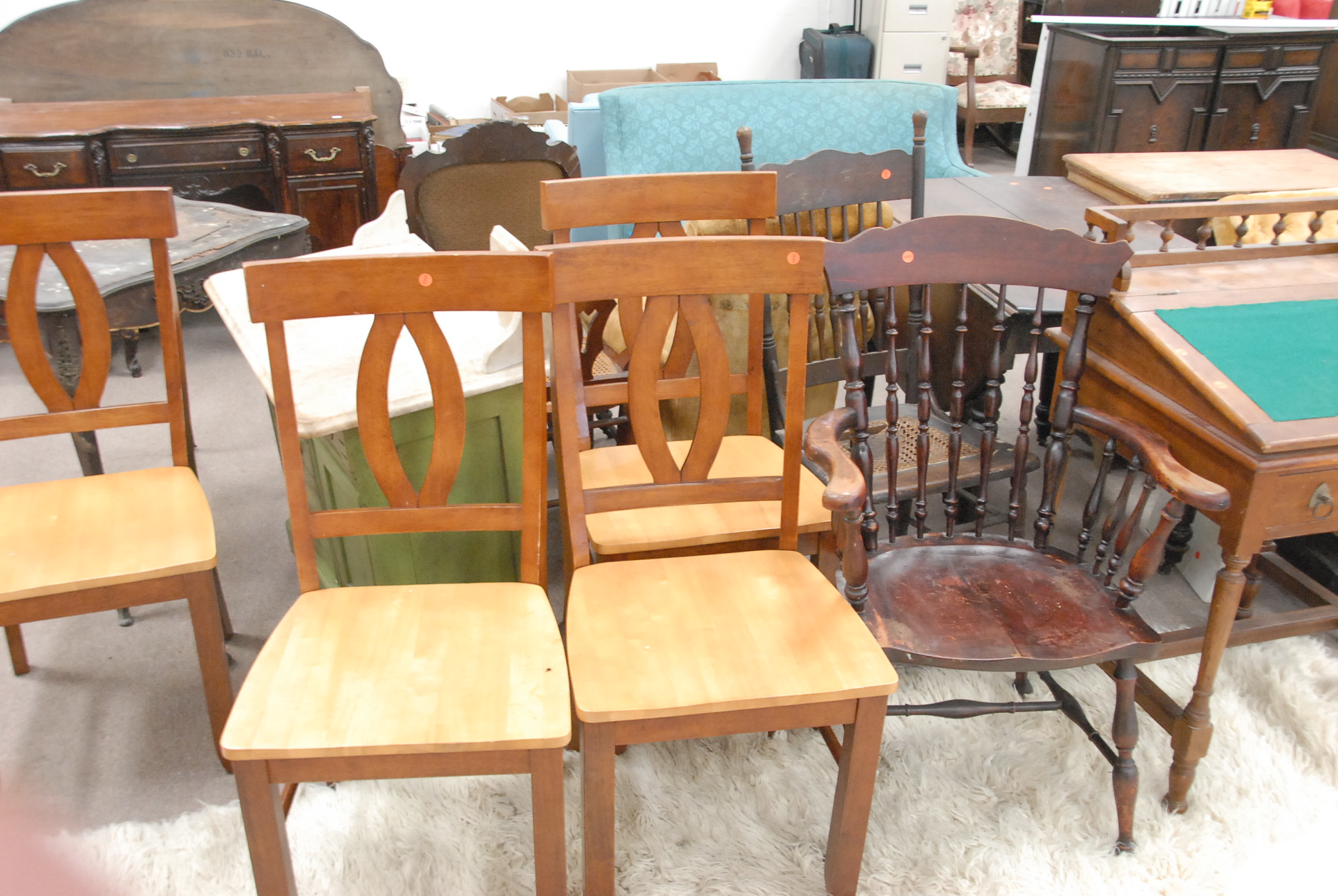 Large group of furniture to include an oak drop leaf table, walnut drop leaf table, a slant front desk, two platform rockers, set of four kitchen chairs, green marble top commode, and miscellaneous