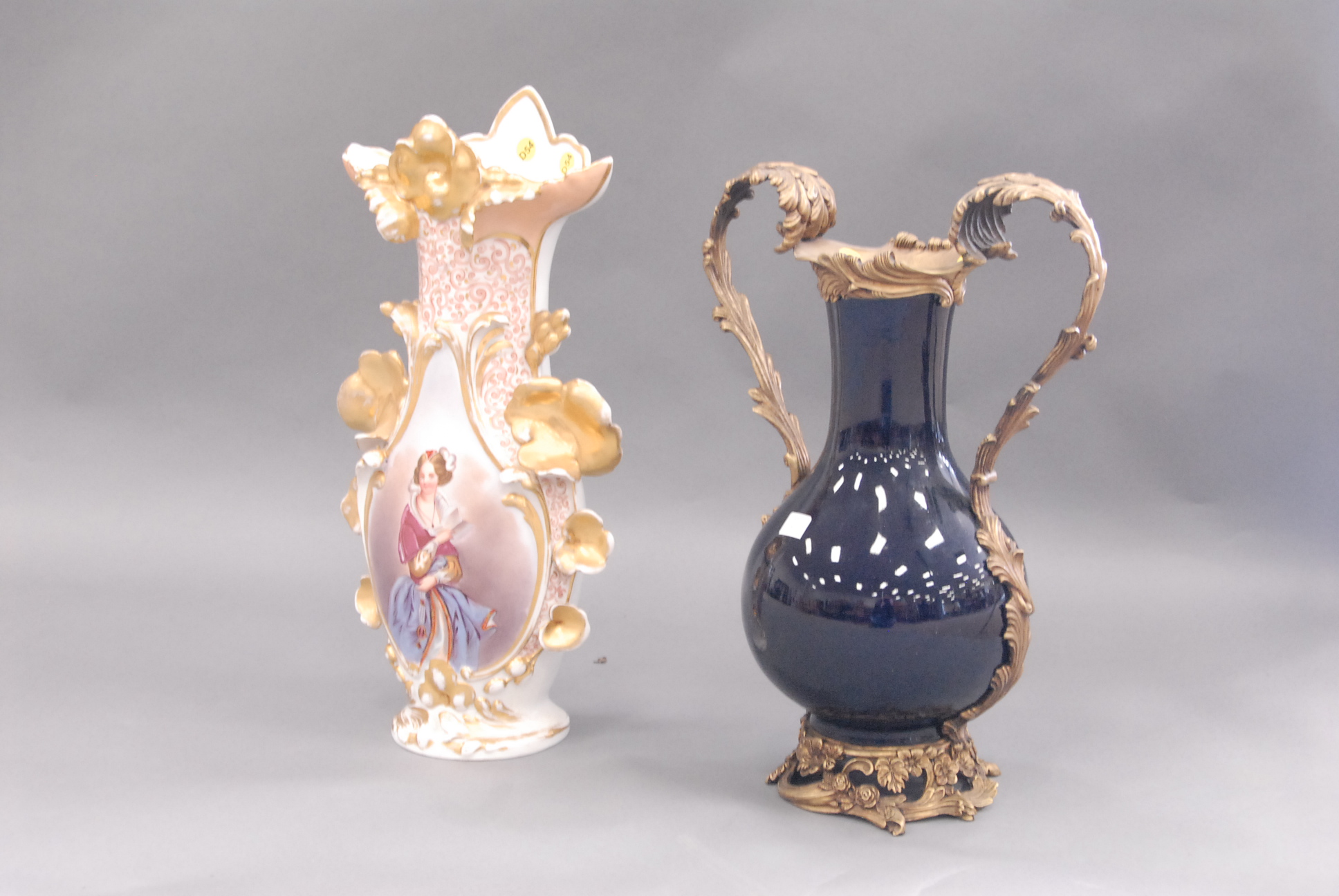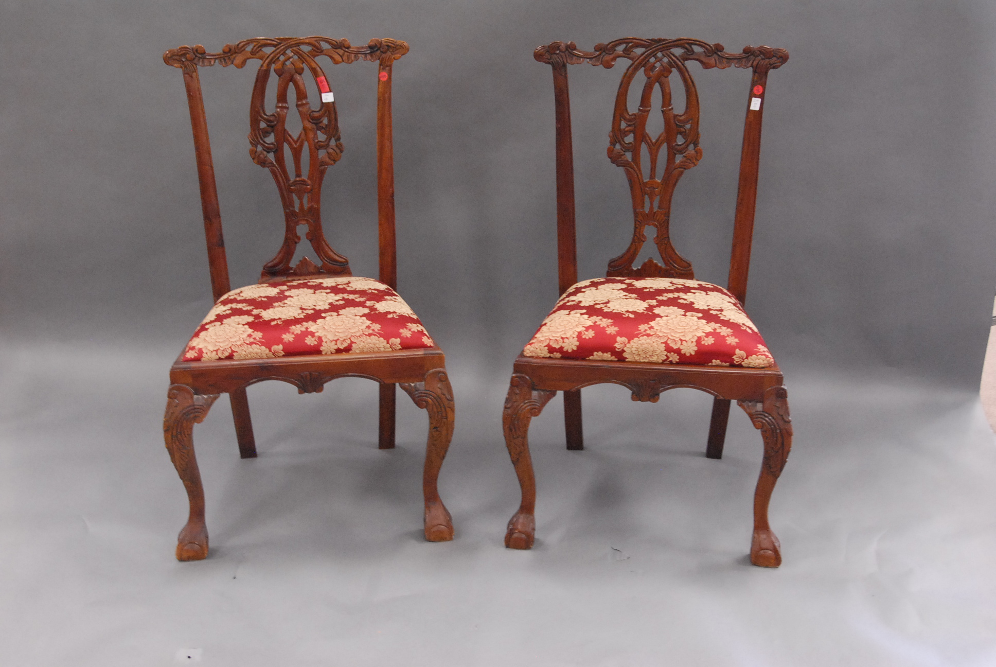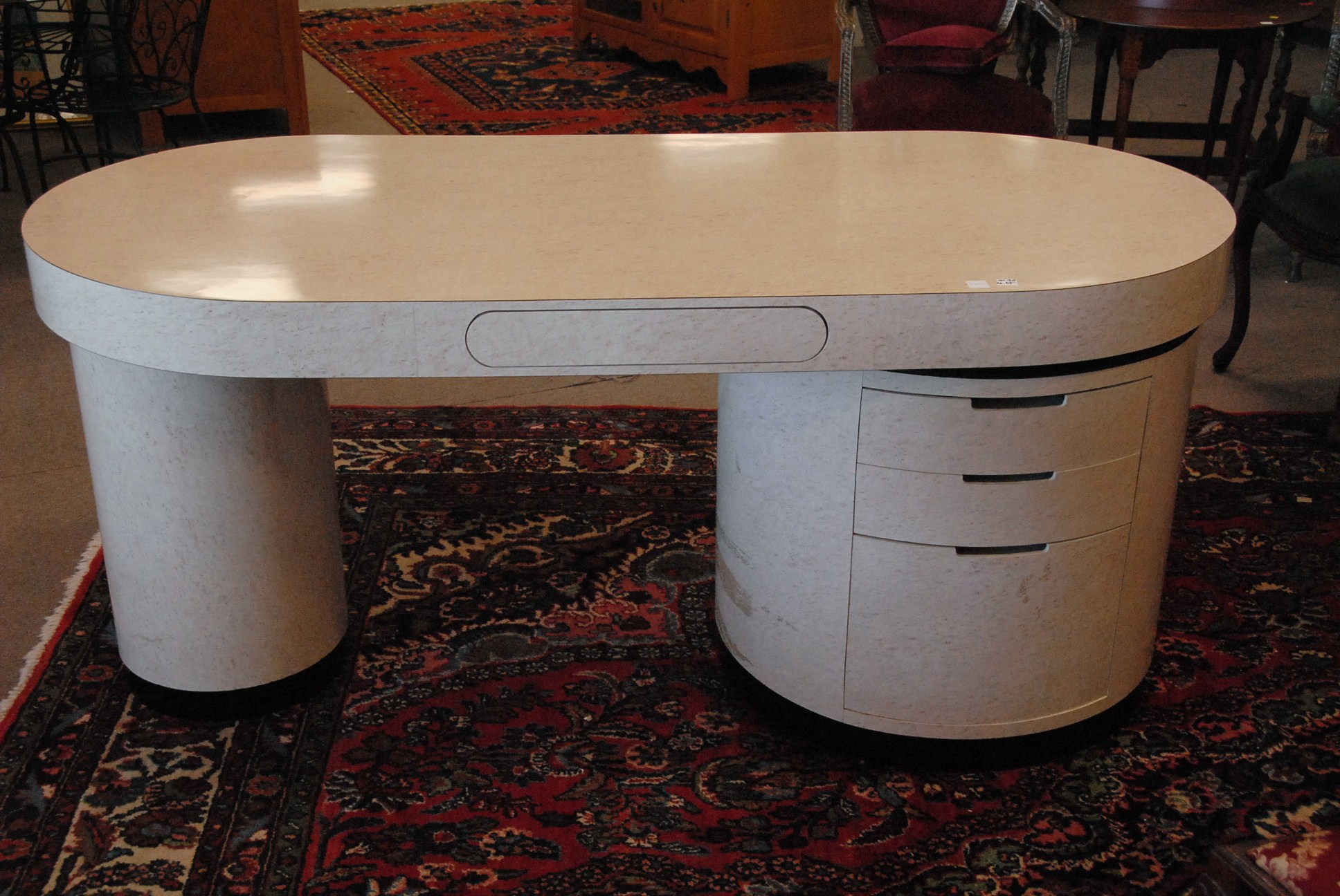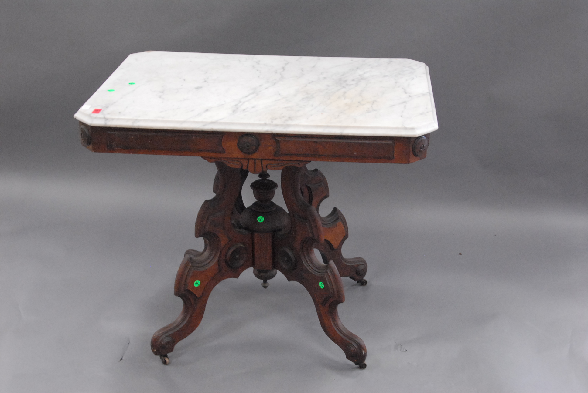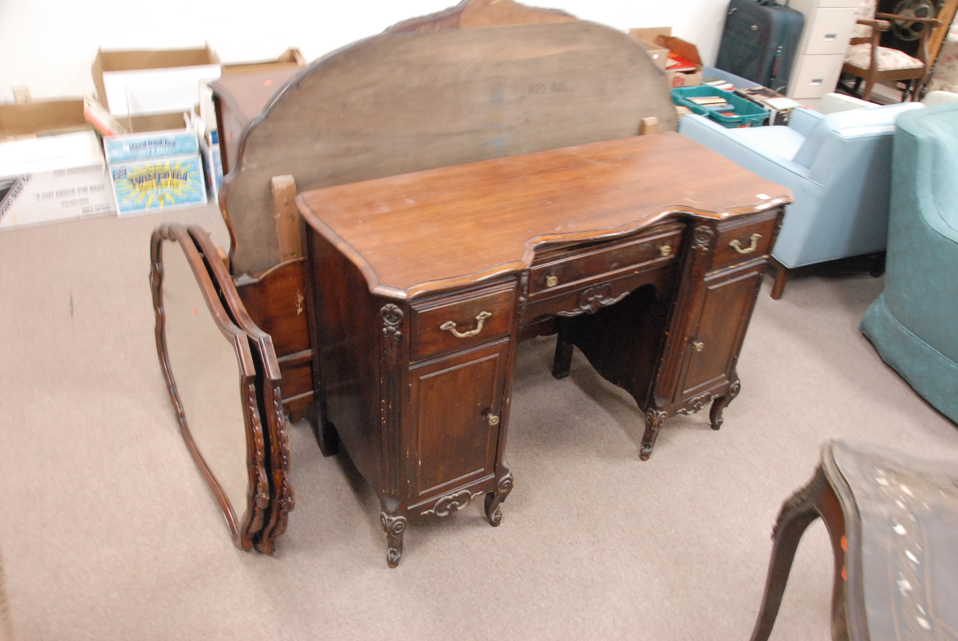 Large group of furniture to include an oak drop leaf table, walnut drop leaf table, a slant front desk, two platform rockers, set of four kitchen chairs, green marble top commode, and miscellaneous