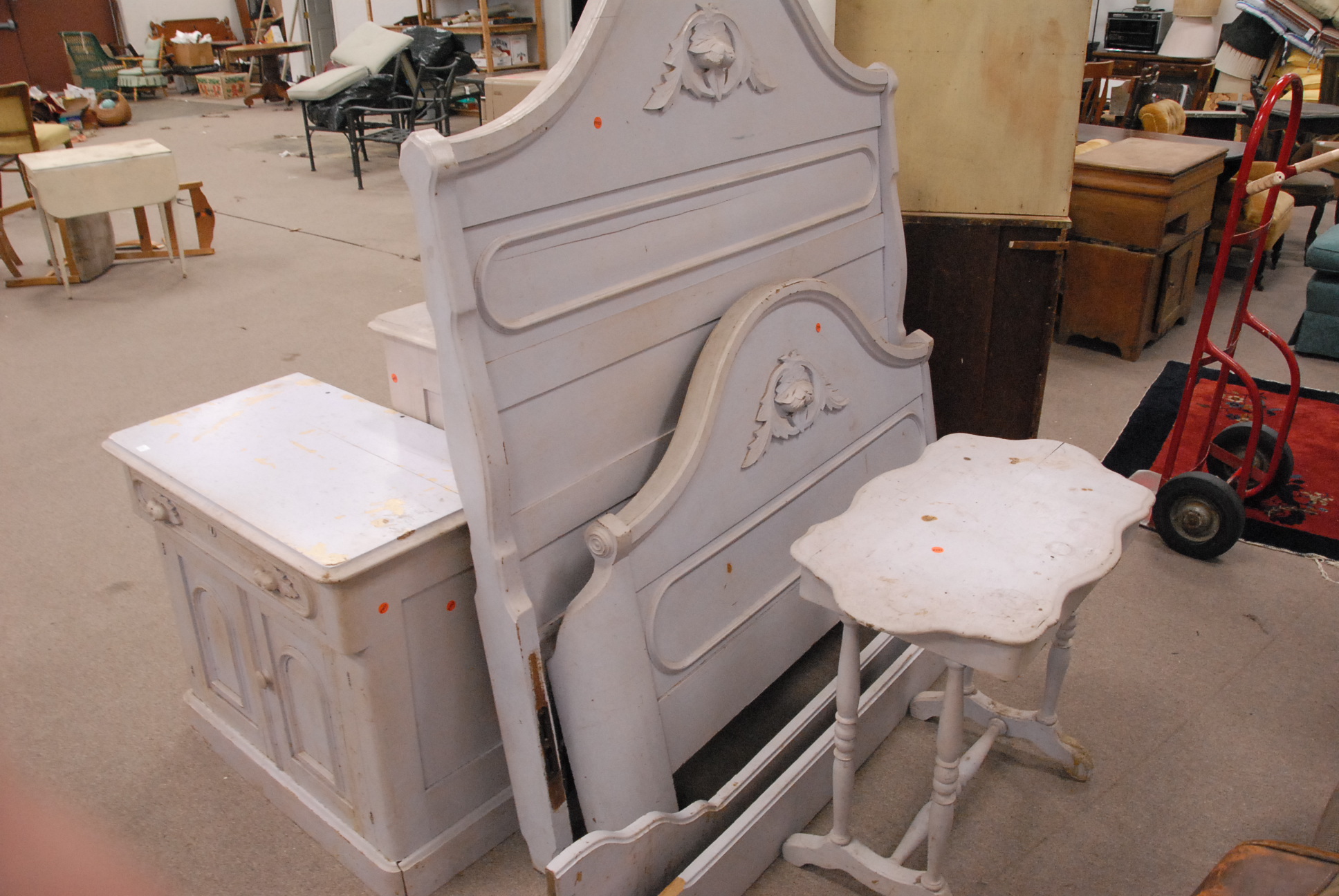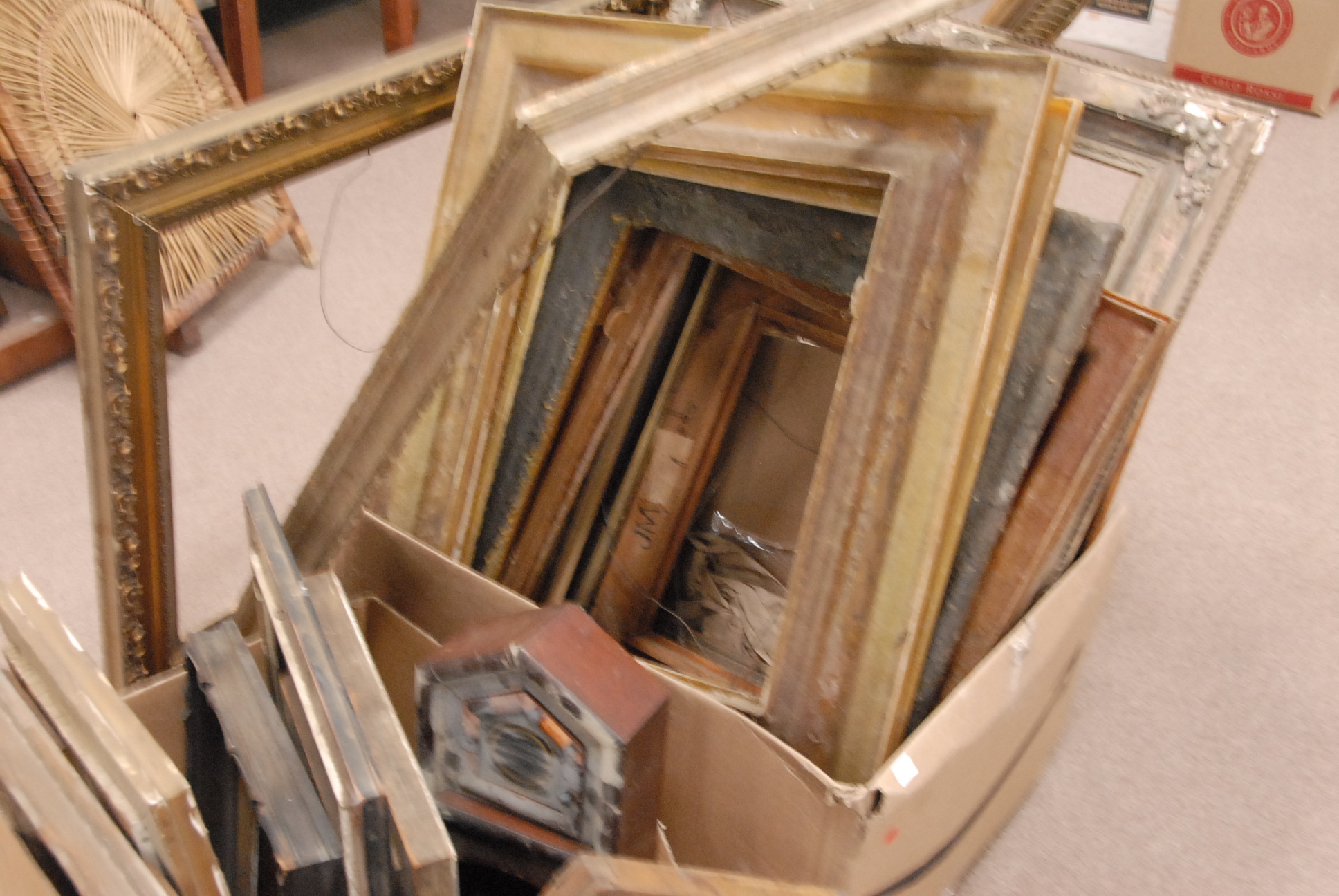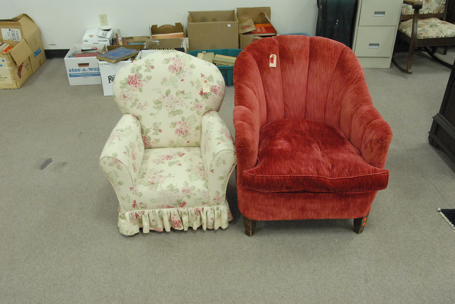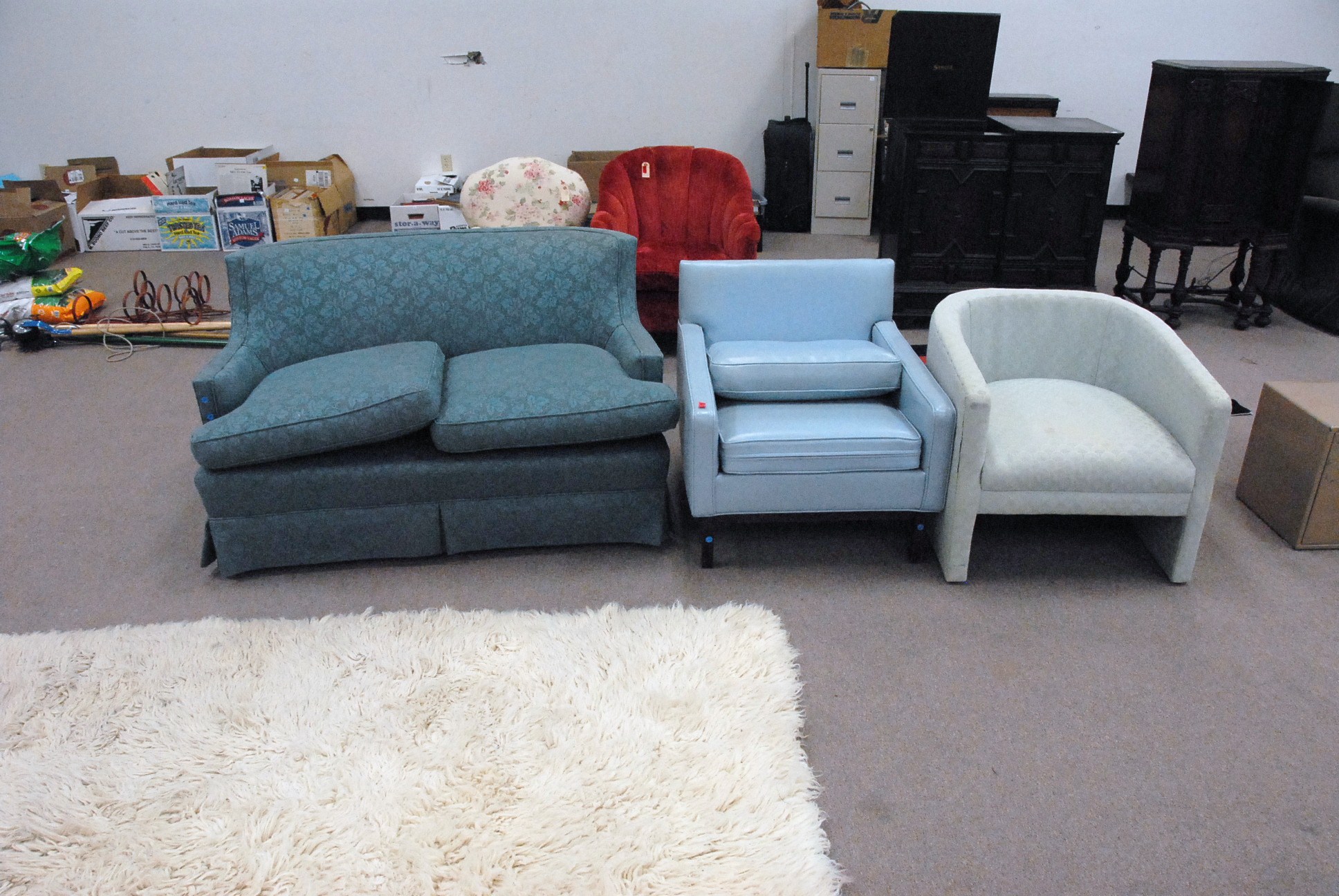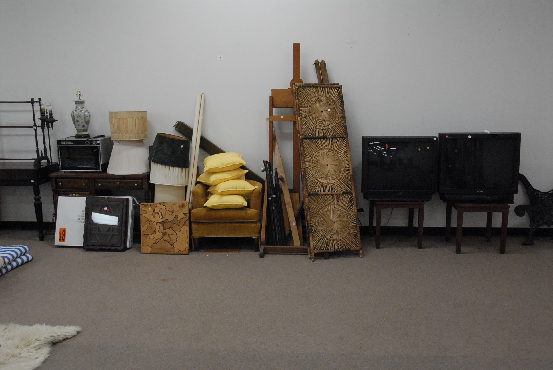 Large grouping including TVs, an easel, couple of chairs, spinet desk, modern desk, table lamp, floor lamp, lamp shades, pillows, and a couple of iron ends for a park bench, etc