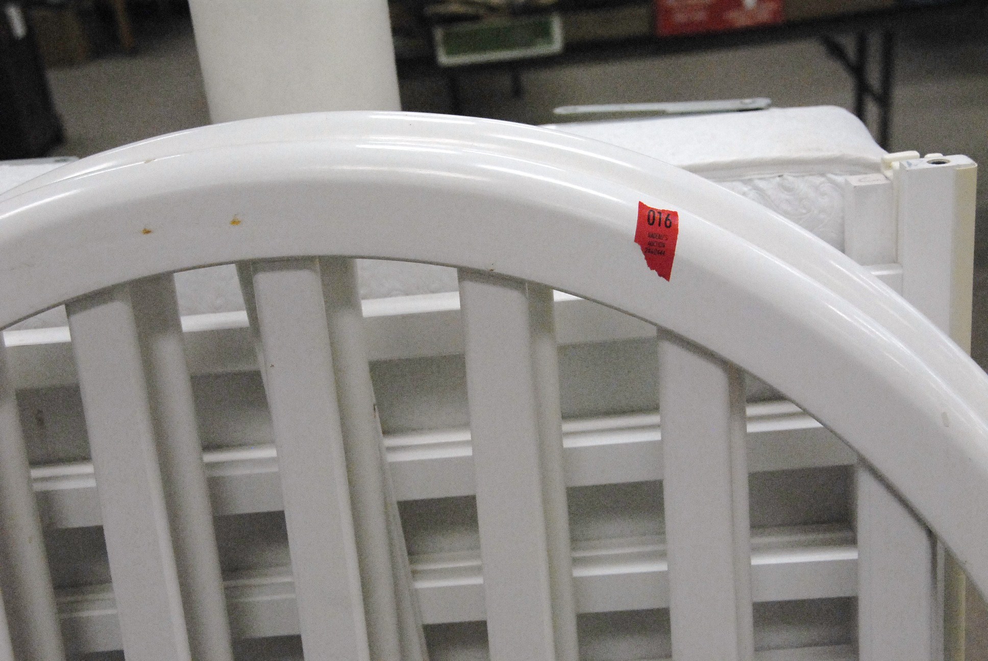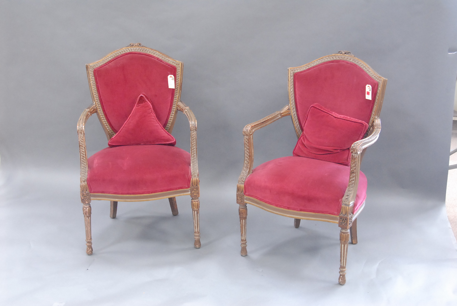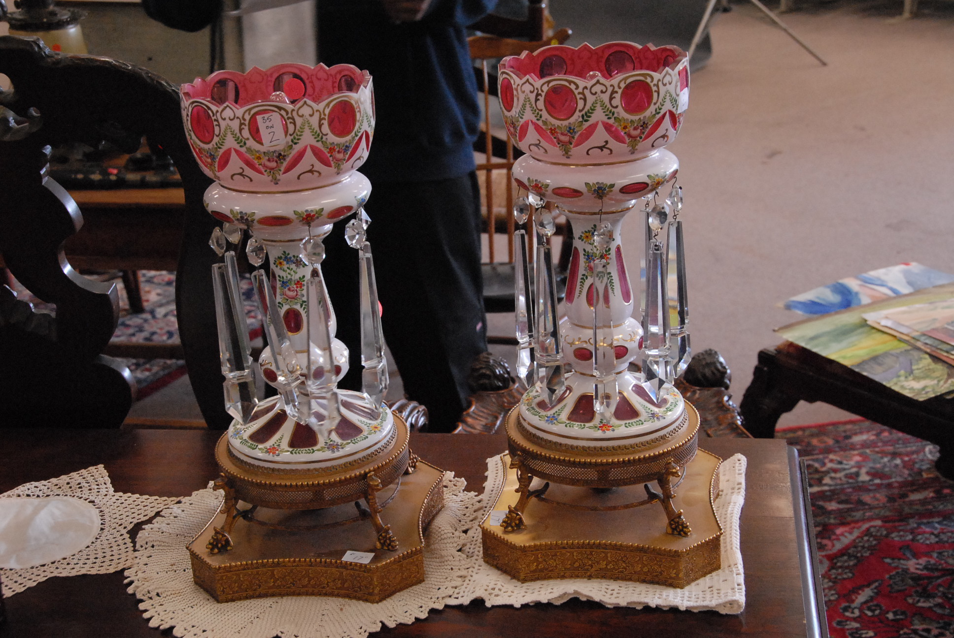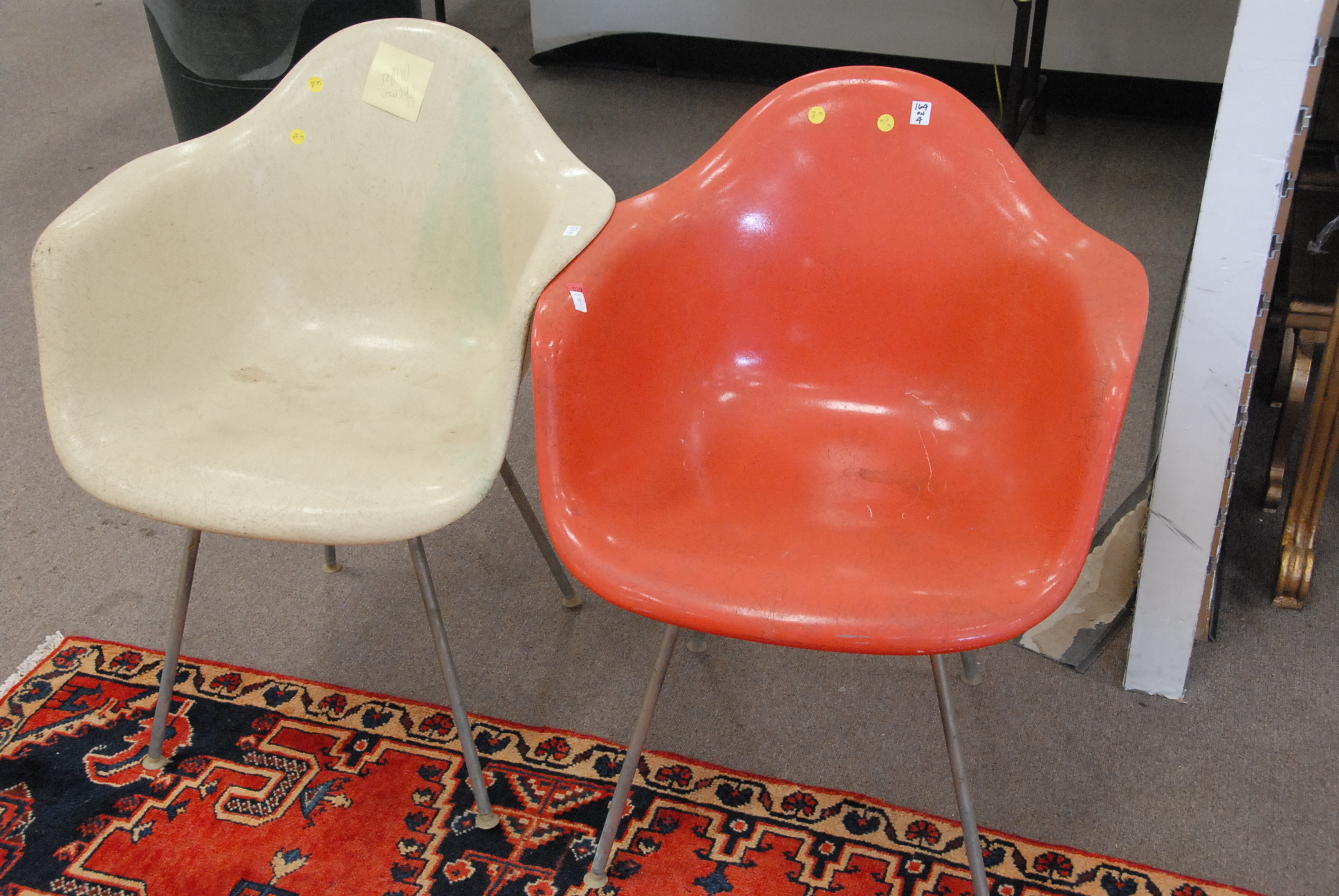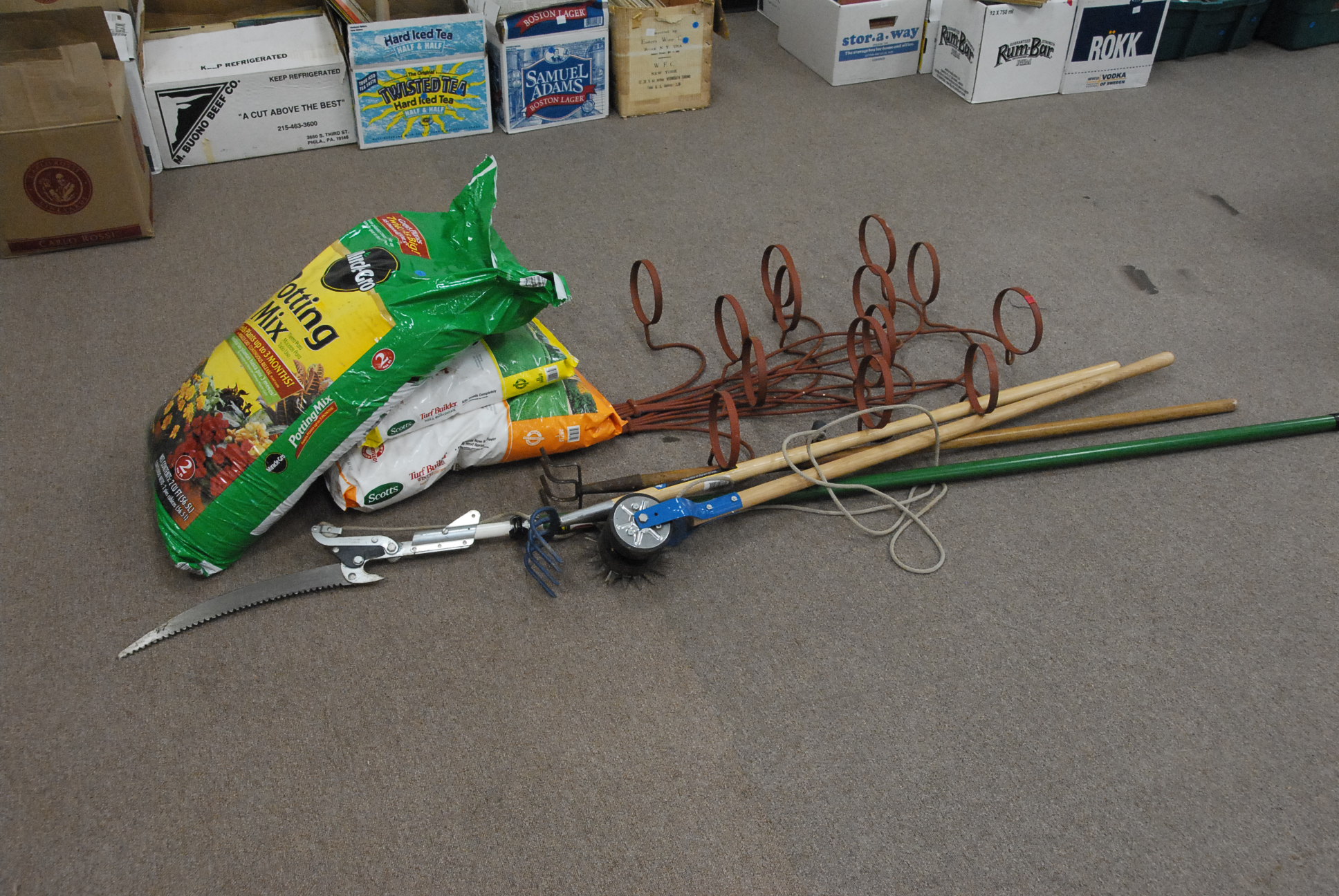 Large grouping including TVs, an easel, couple of chairs, spinet desk, modern desk, table lamp, floor lamp, lamp shades, pillows, and a couple of iron ends for a park bench, etc