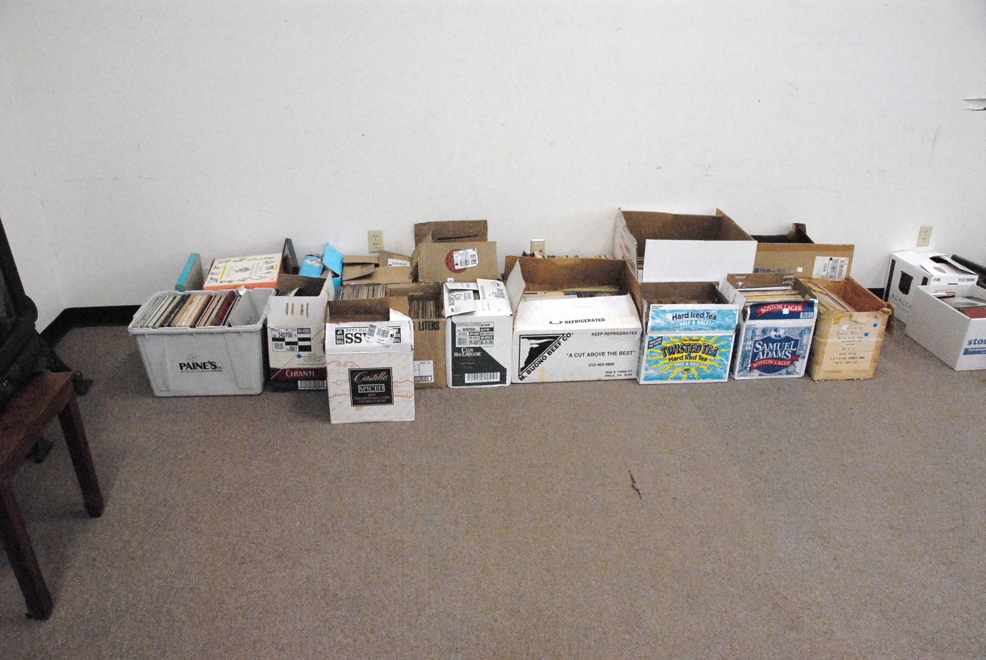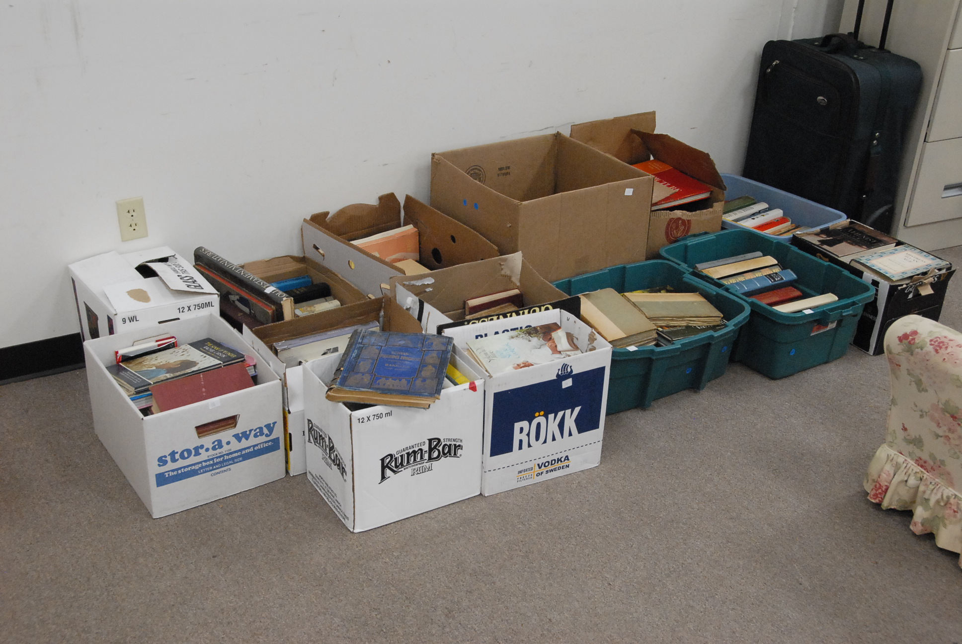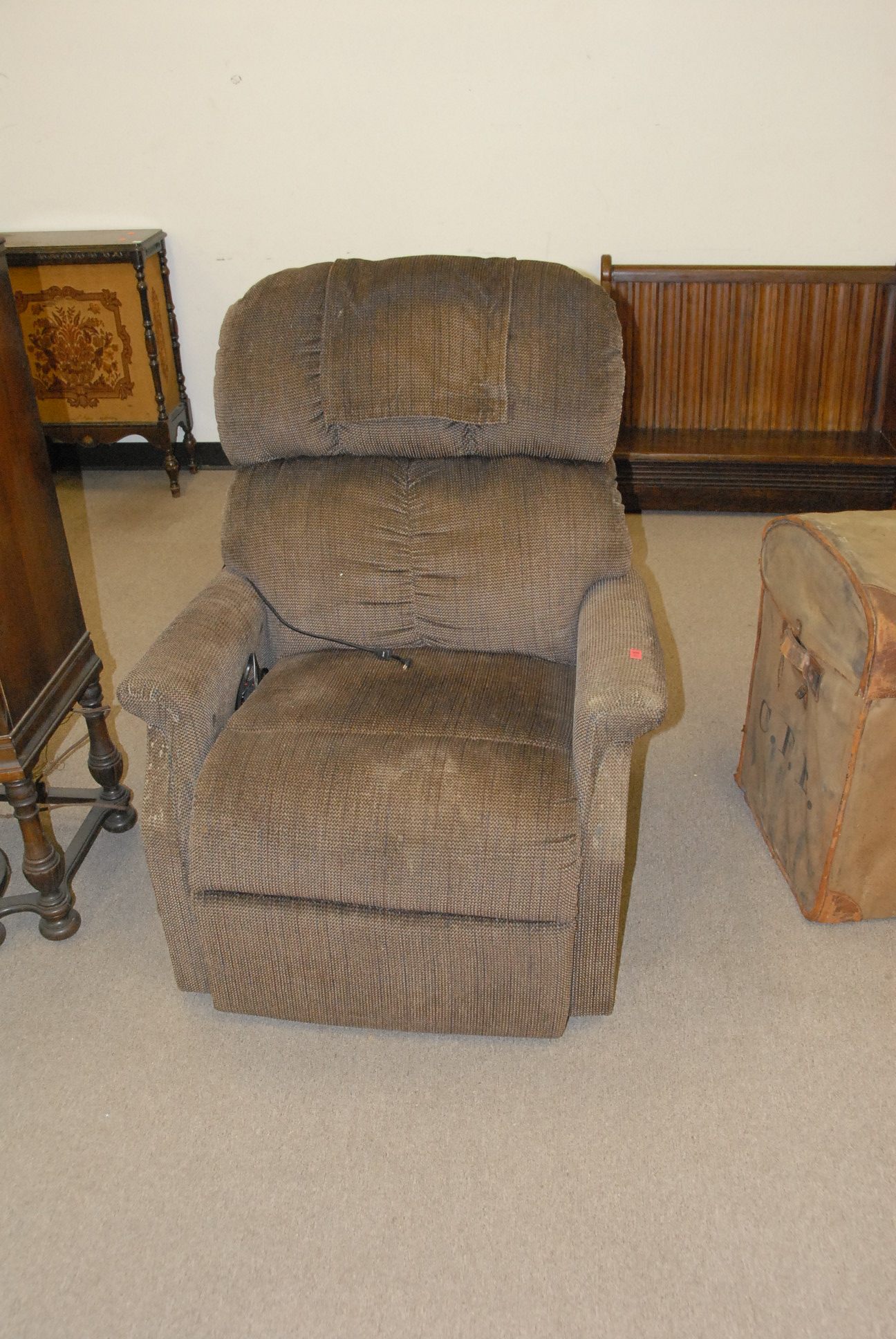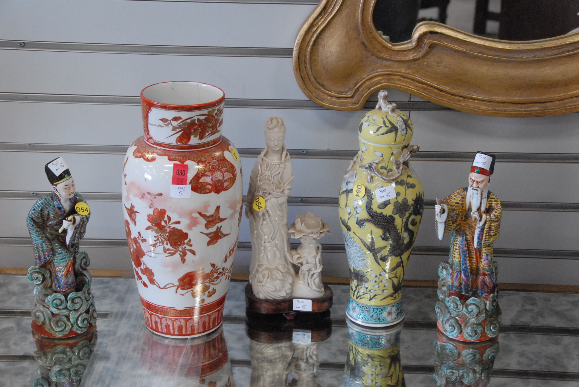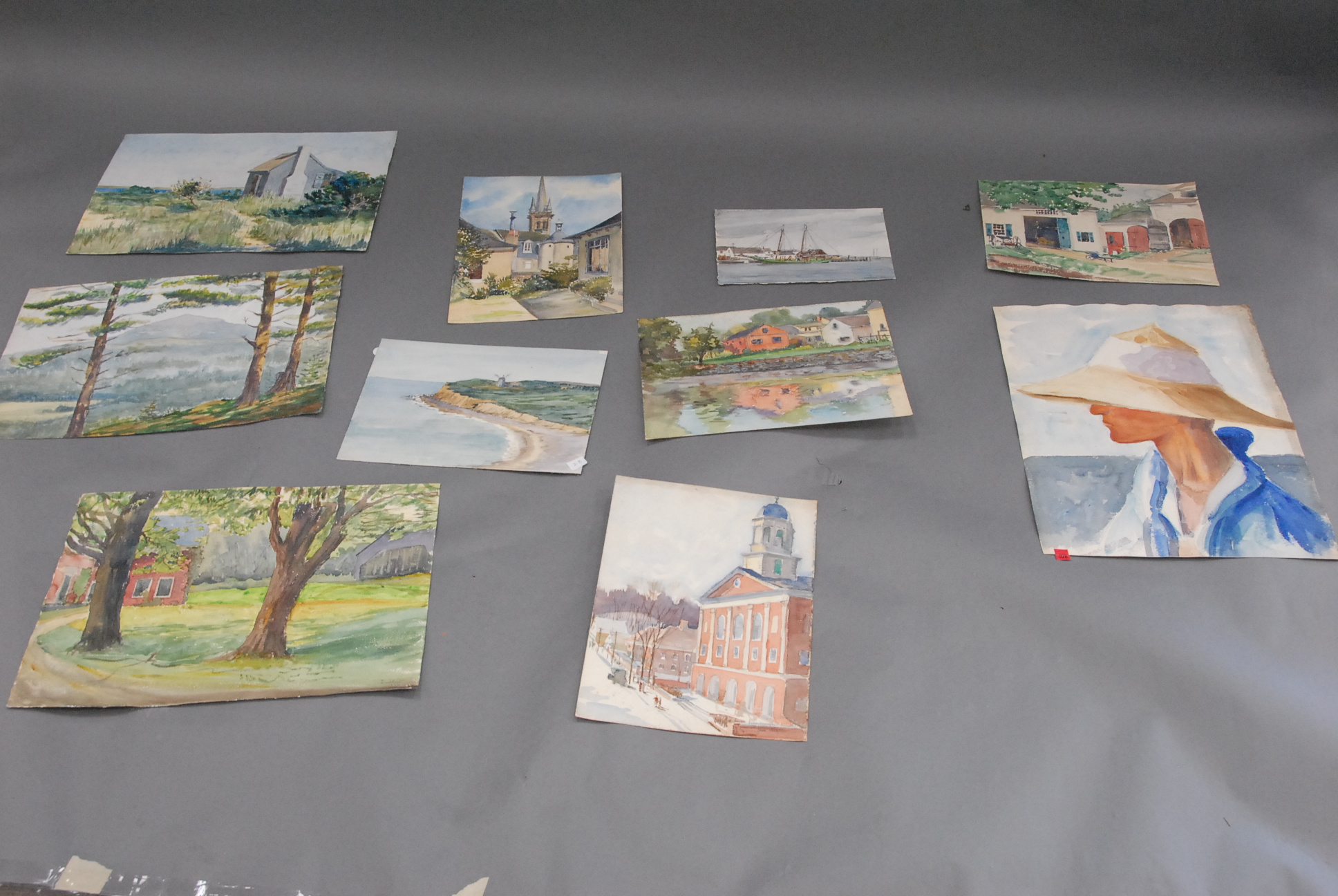 Large grouping including TVs, an easel, couple of chairs, spinet desk, modern desk, table lamp, floor lamp, lamp shades, pillows, and a couple of iron ends for a park bench, etc