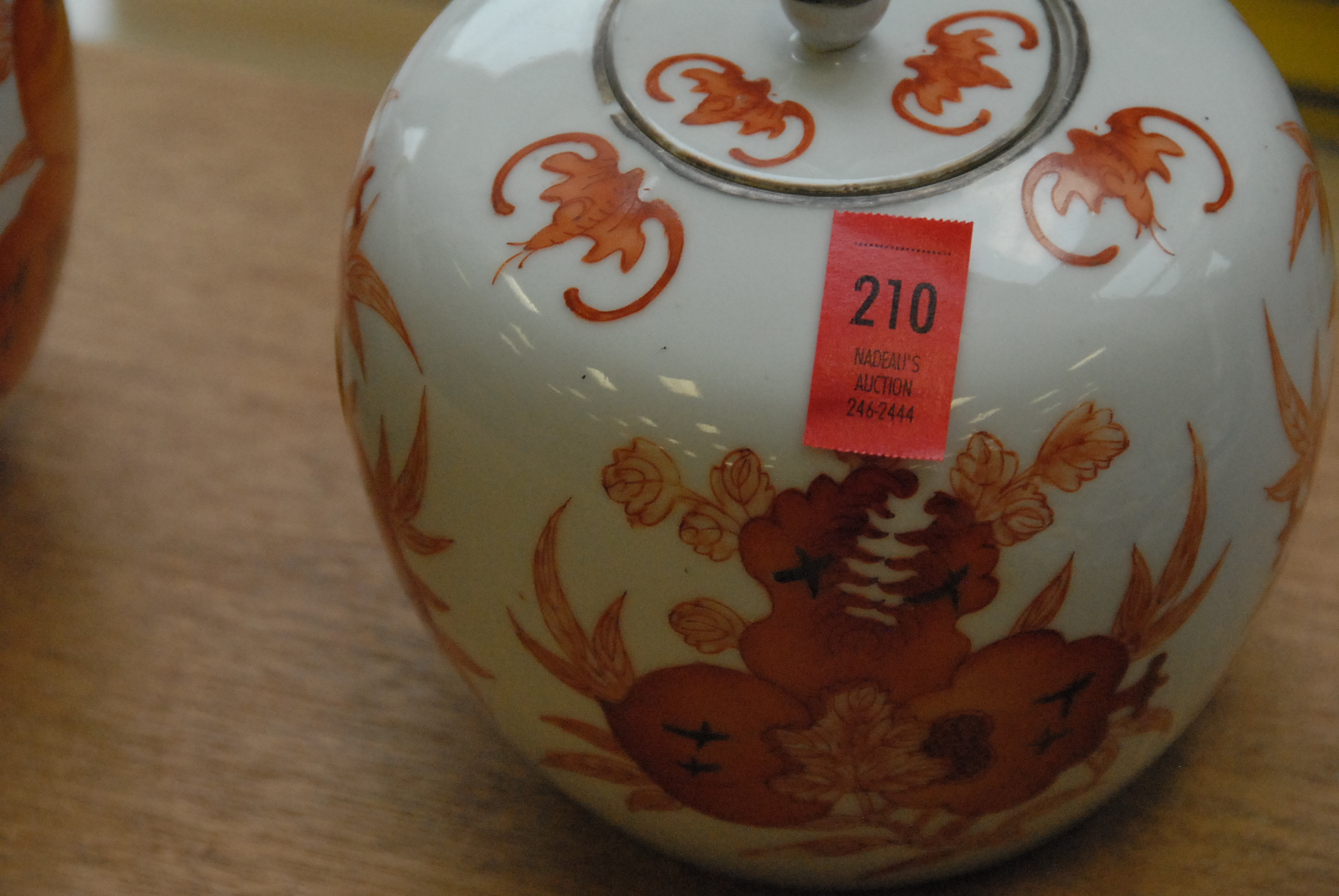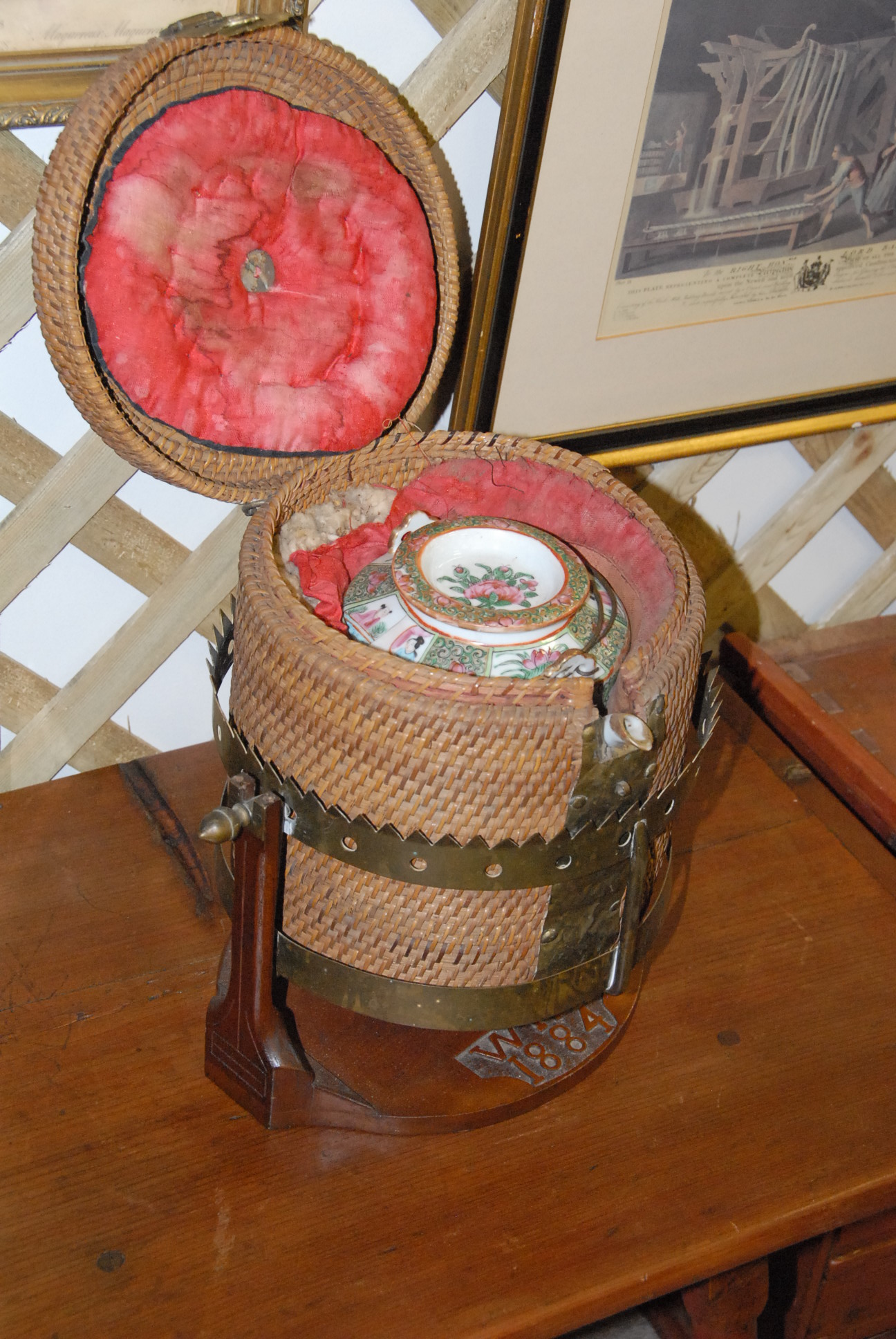 Rose Famille teapot in a woven basket on a tilting stand, dated 1884
