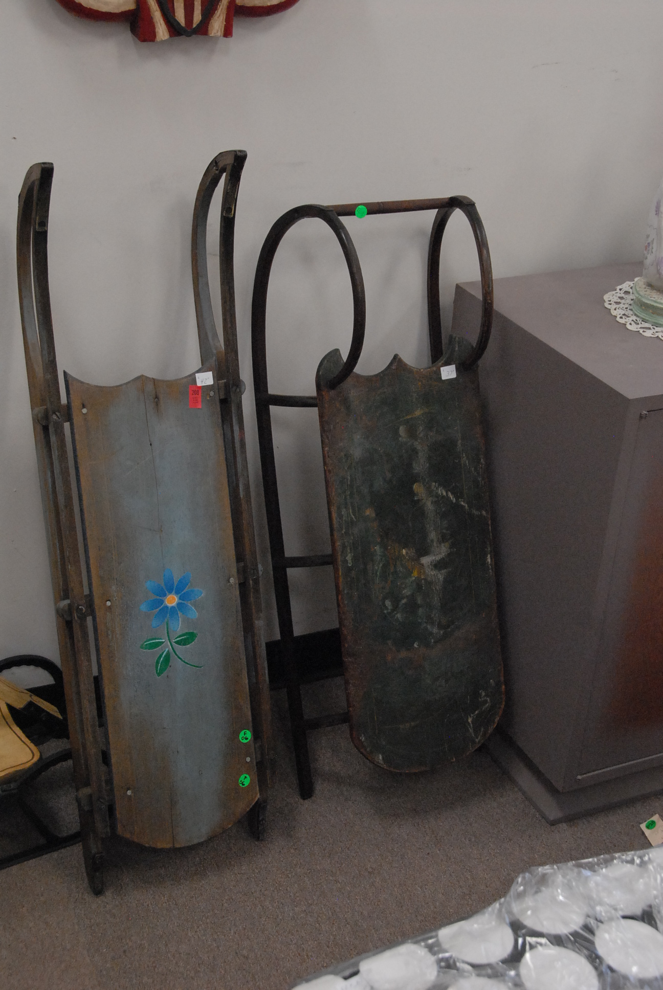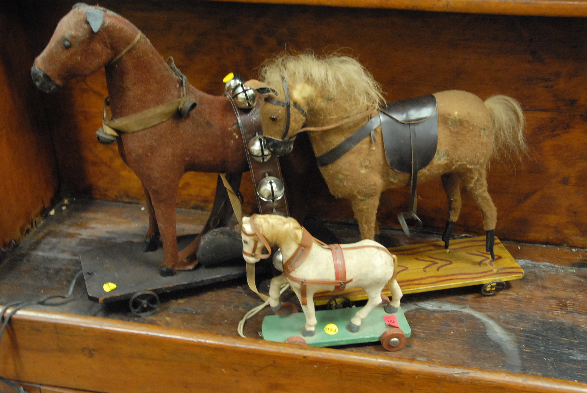 Seven piece lot to include an iron horse figure, a sheet metal fish, two roosters, a rocking horse figure, and two horses