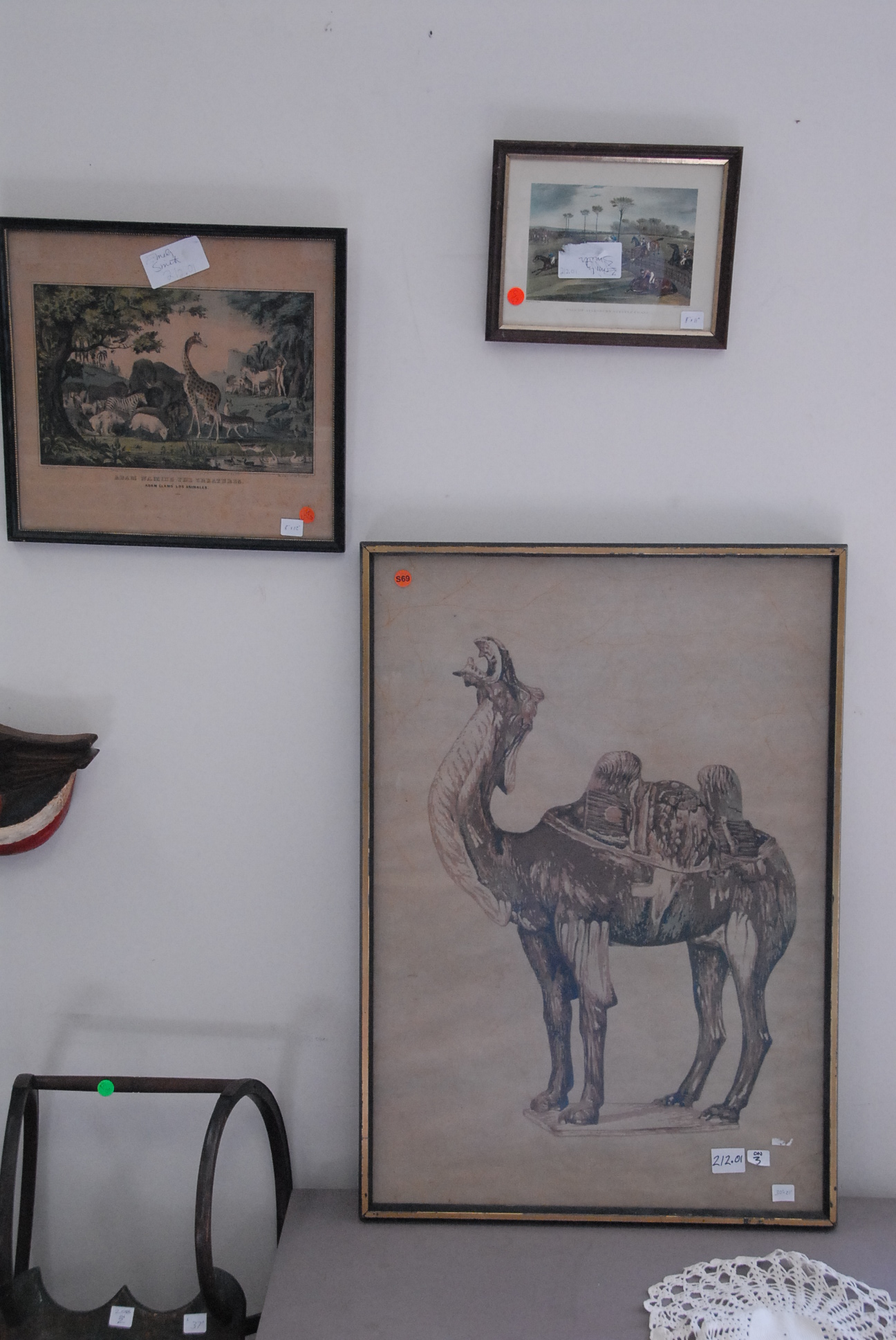 Three piece lot to include camel printed on cloth, Adam naming the creatures, and a small sporting print