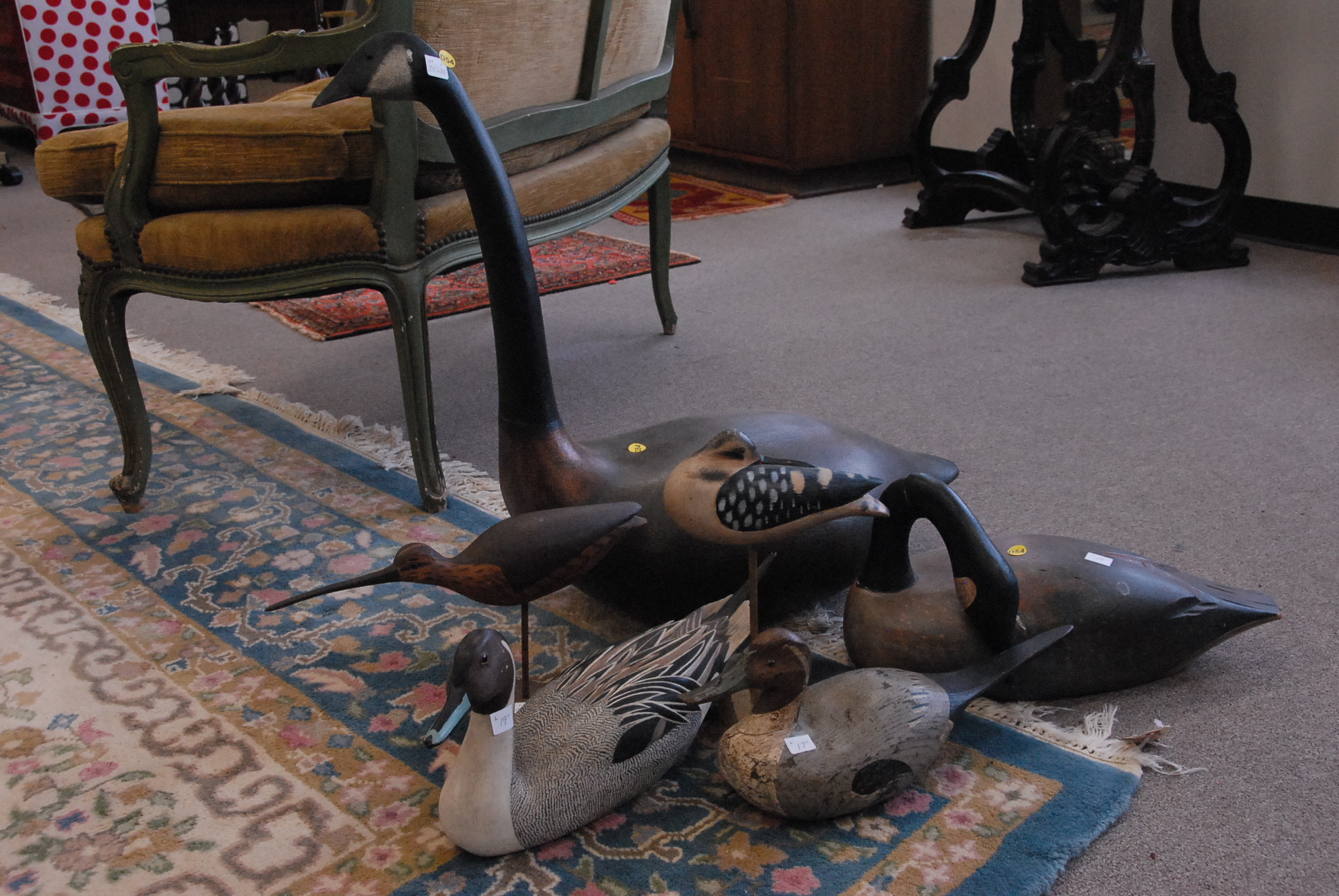 Six piece lot of decoy birds, shore birds, ducks, and geese, one signed J.E Dodge NY, one signed WEK