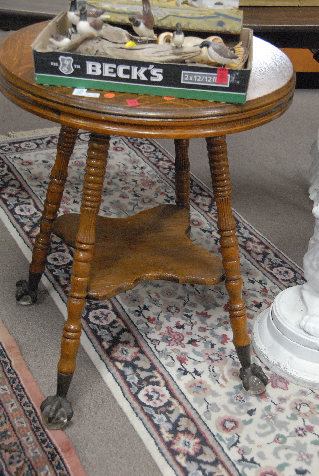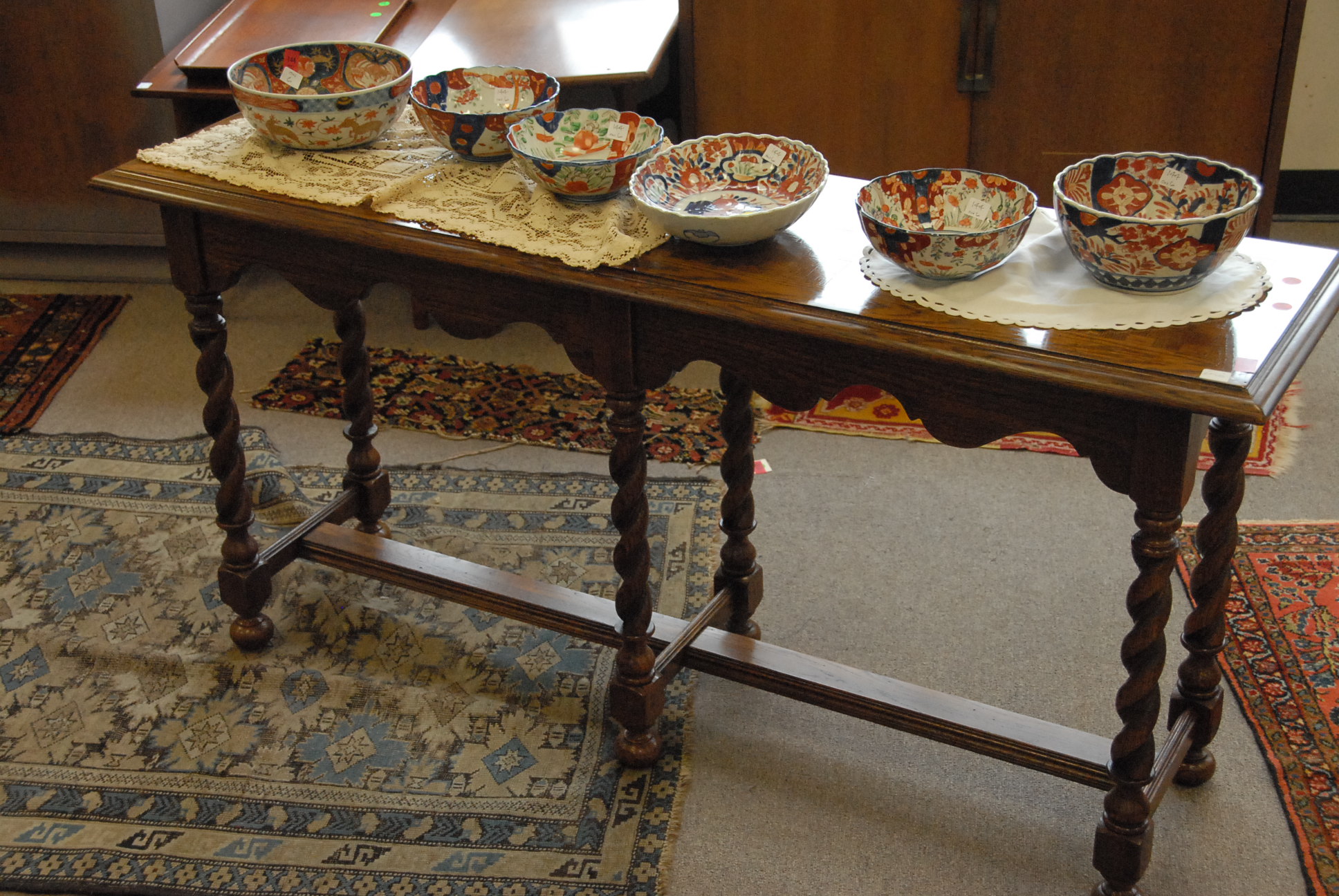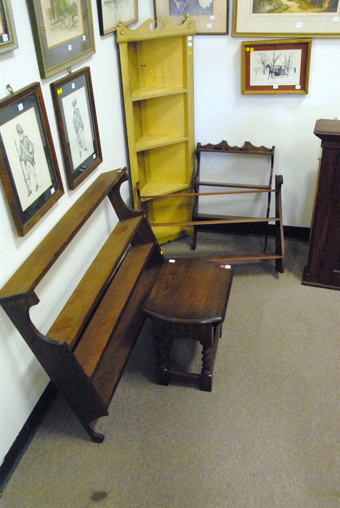 Group lot including three hanging shelves, small corner cabinet, and a miniature oak Jacobean style drop leaf table
